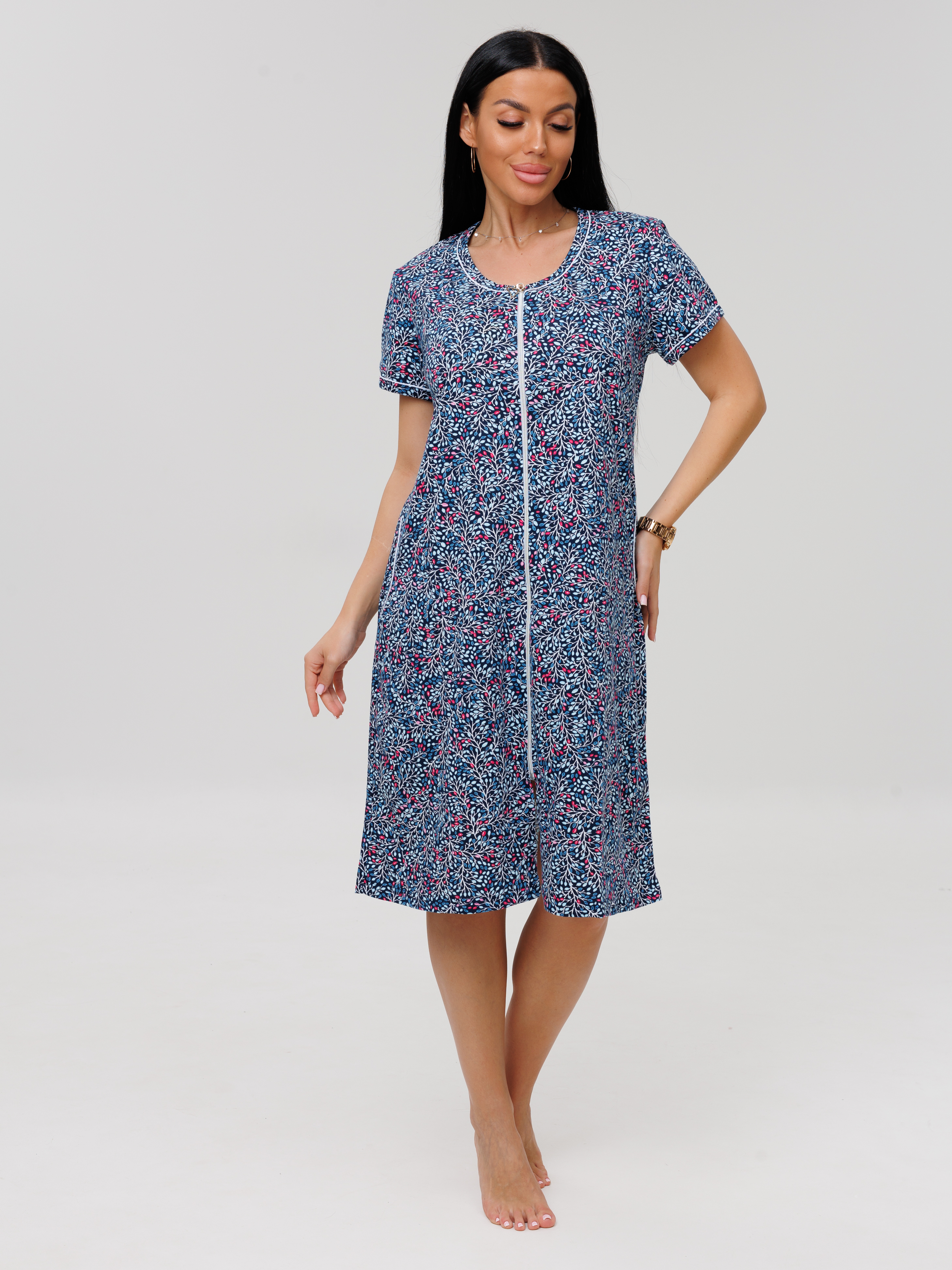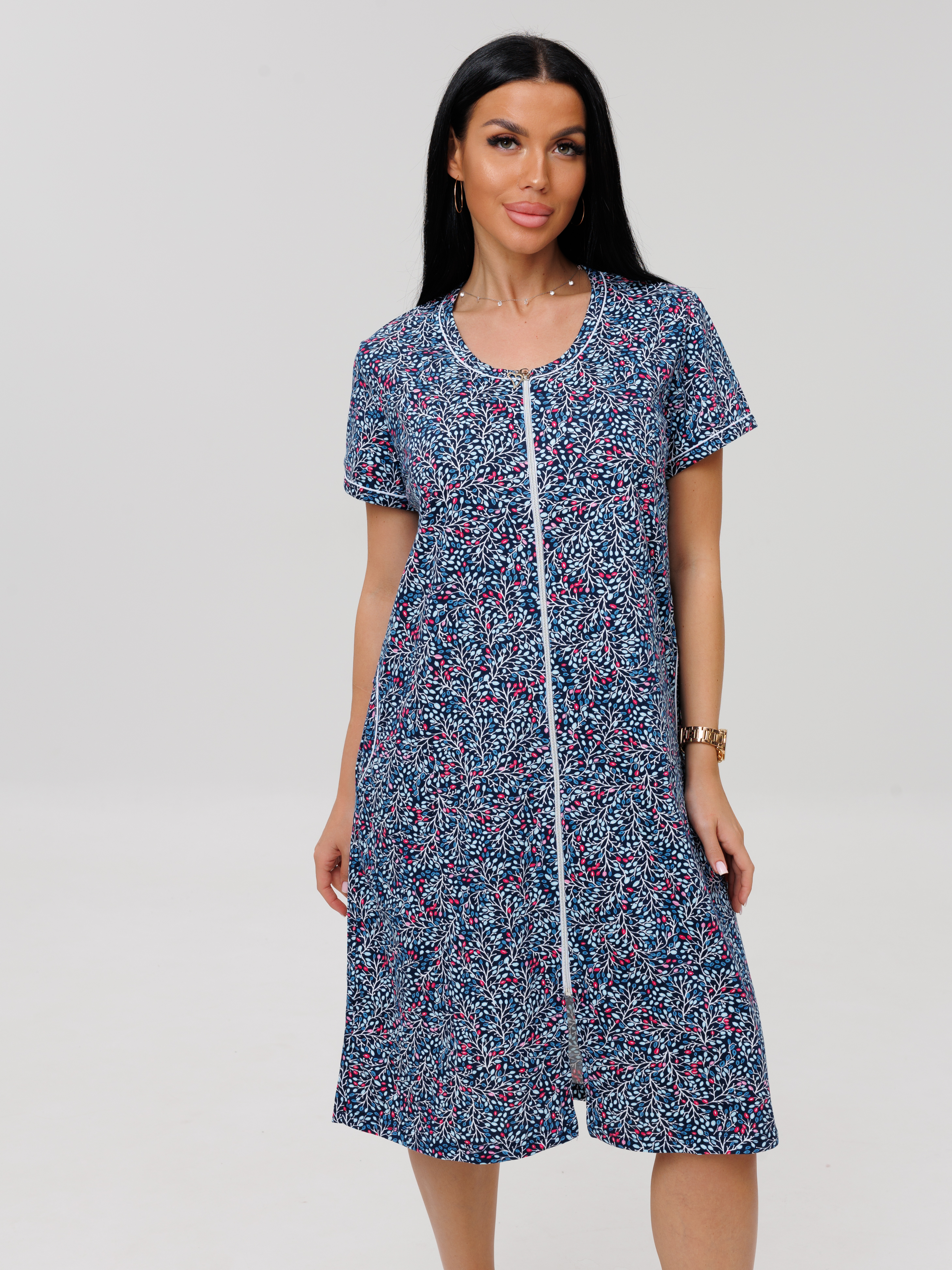 молнии, с короткими рукавами. Женский домашний халат из кулирки имеет широкий