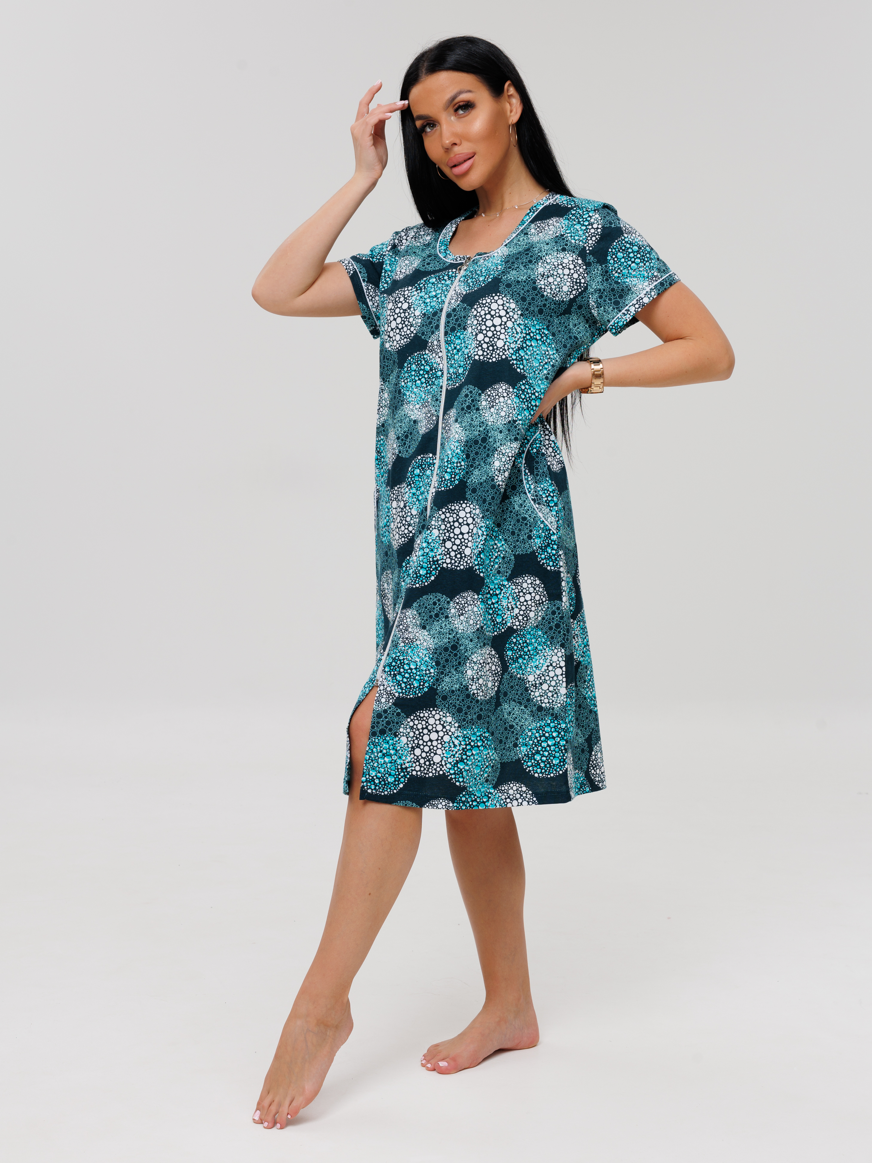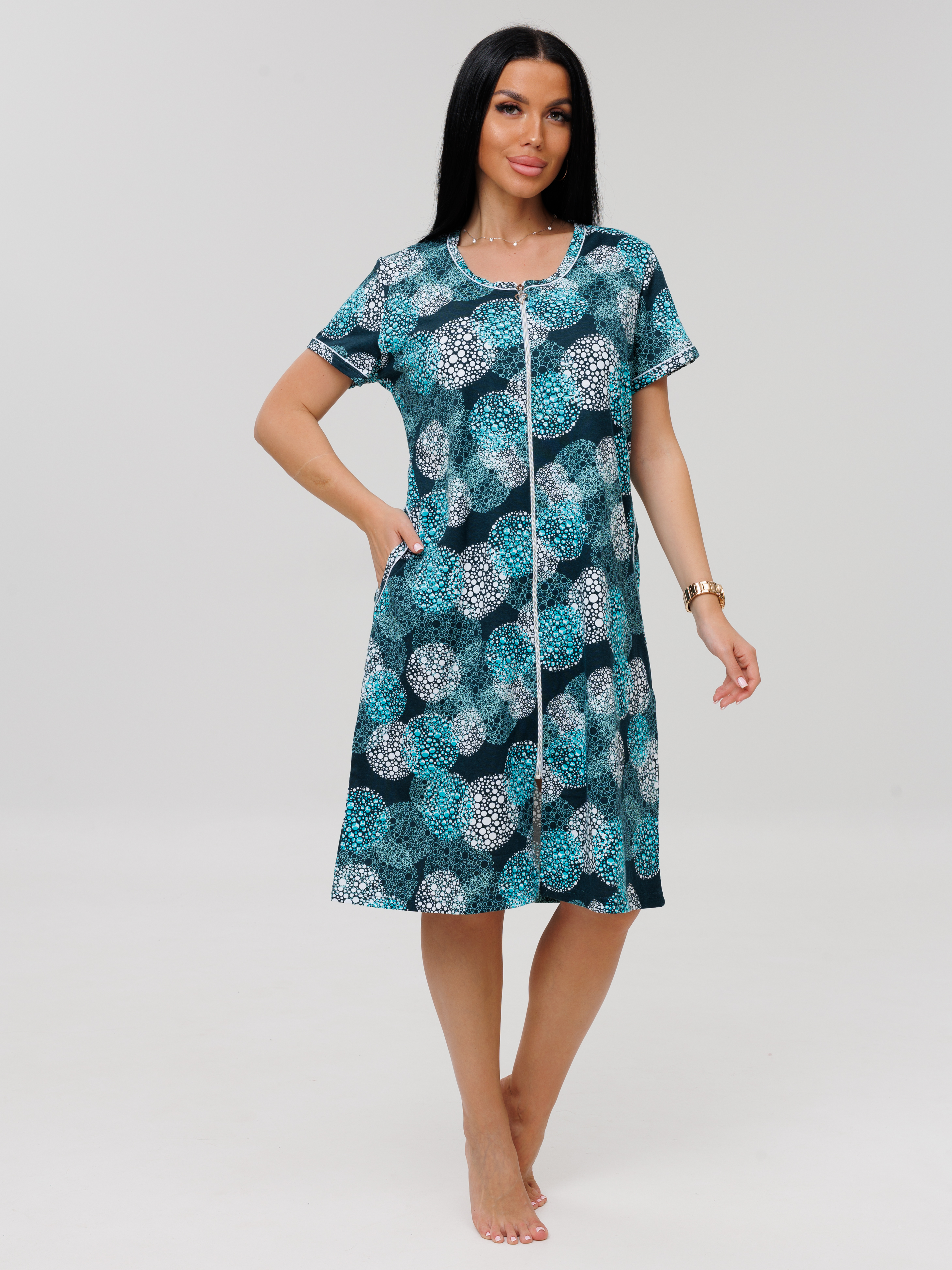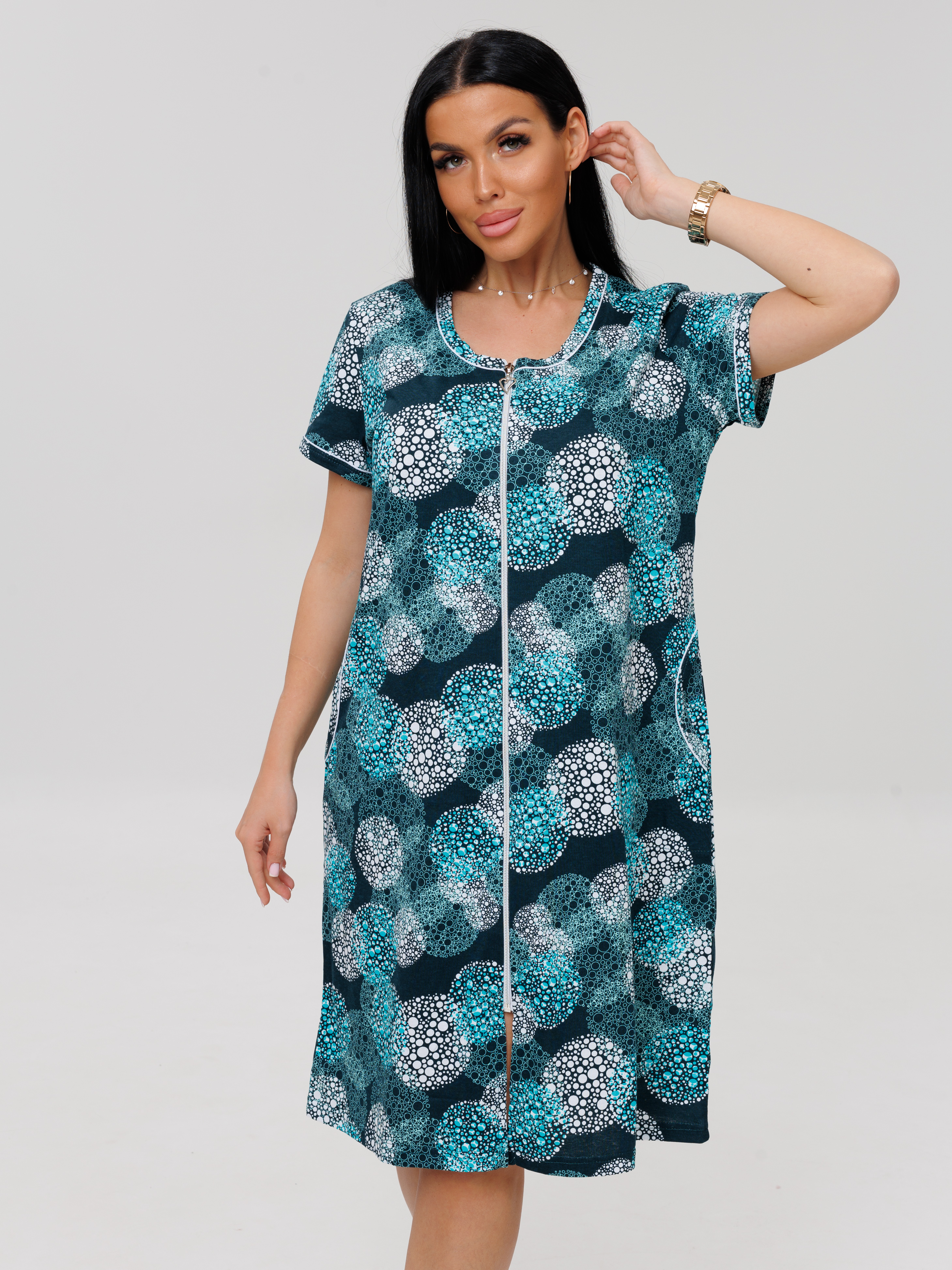 молнии, с короткими рукавами. Женский домашний халат из кулирки имеет широкий