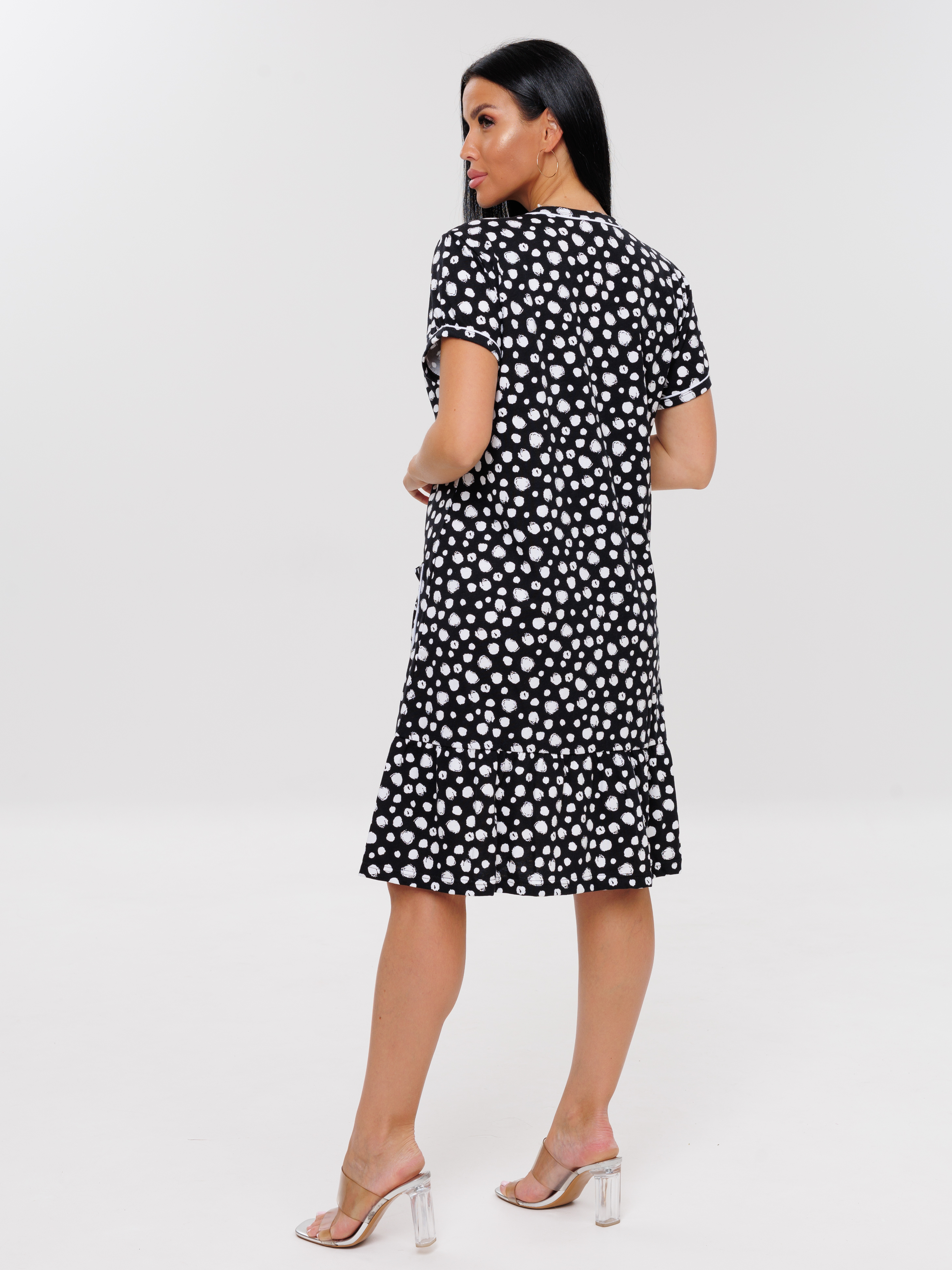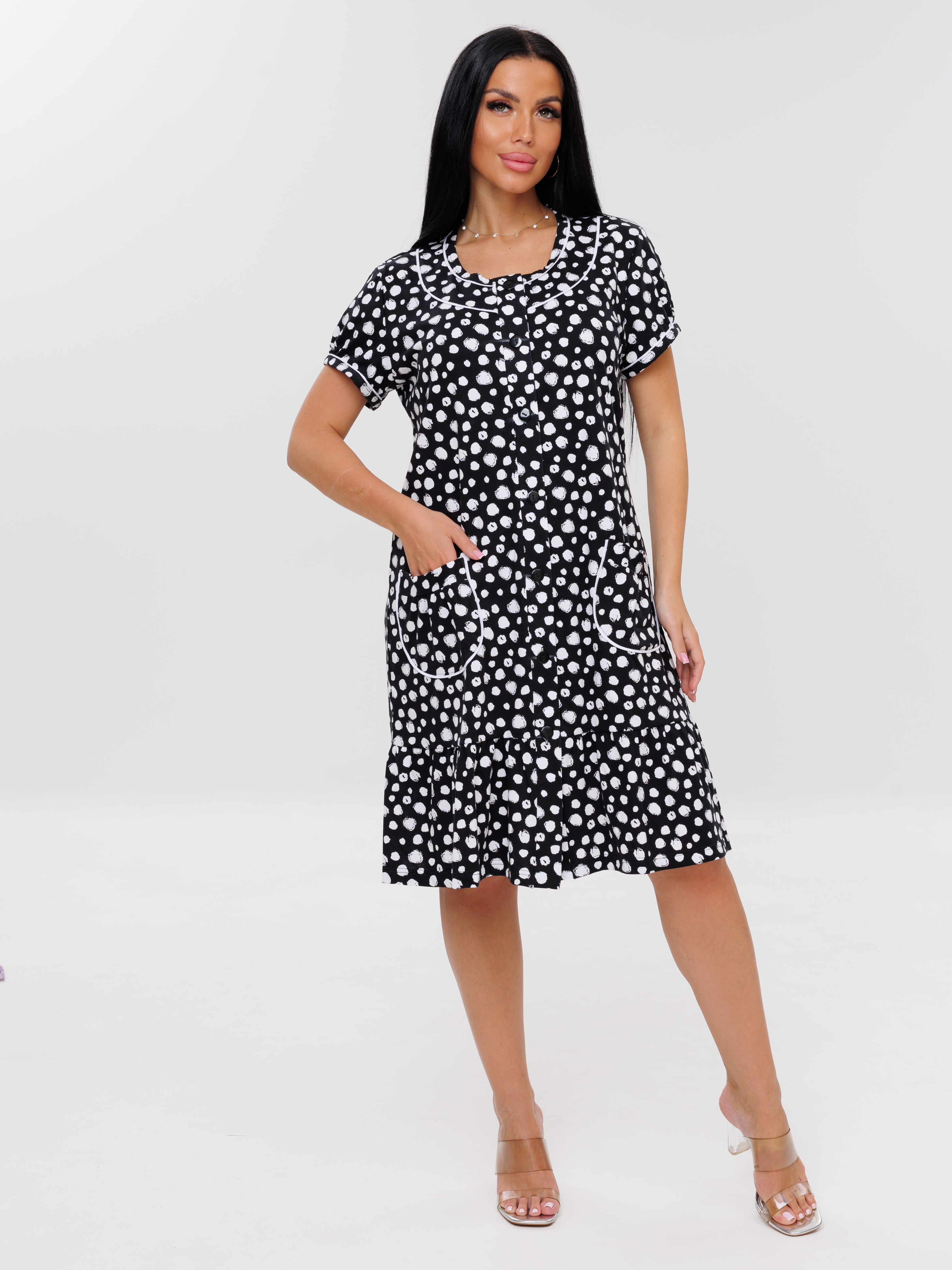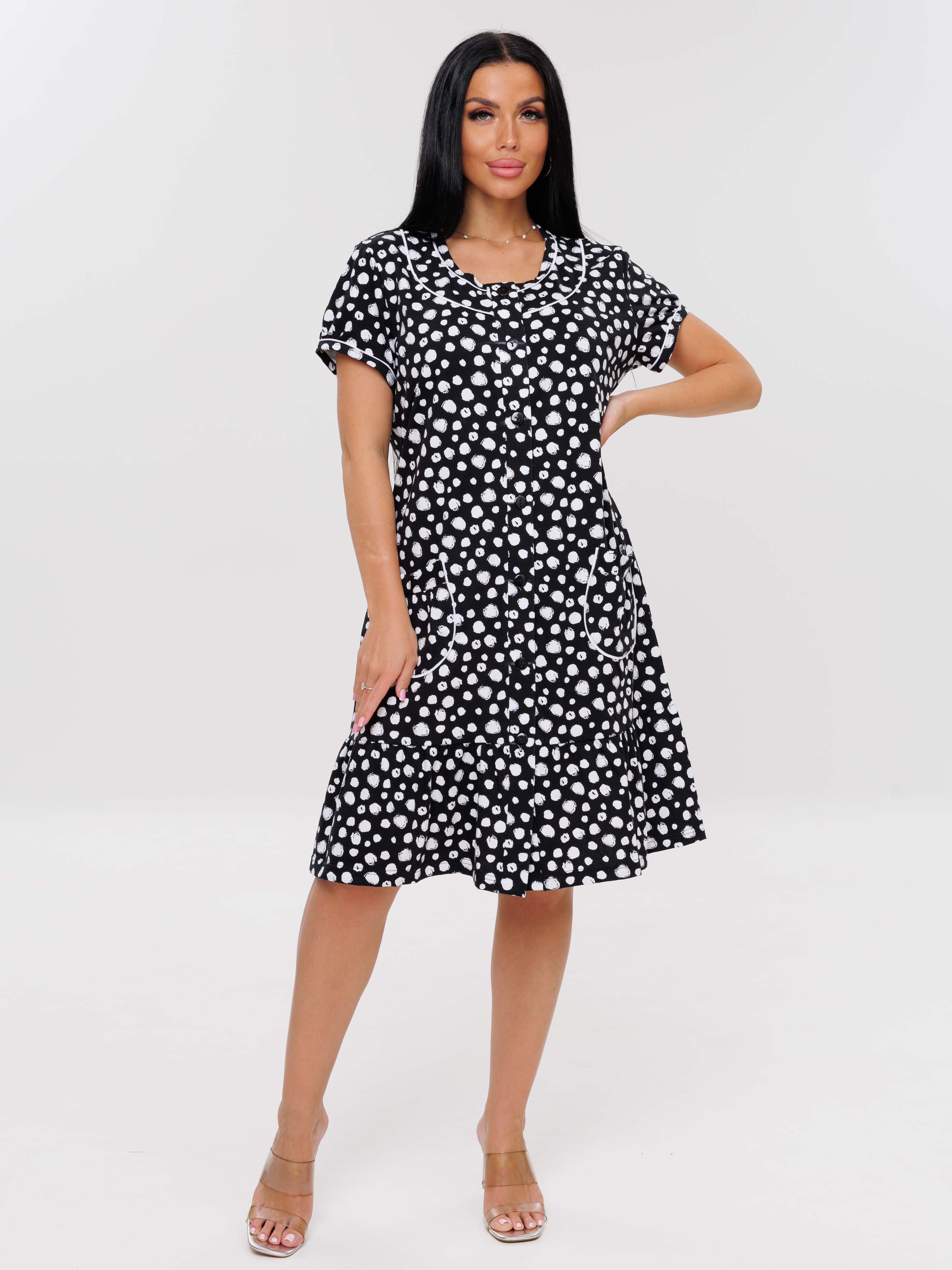 Женский легкий халат из 100% хлопка свободного силуэта. Модель на пуговицах с укороченным рукавом. Нежная оборка, карманы и рукава придают акцент принтом с горошком.