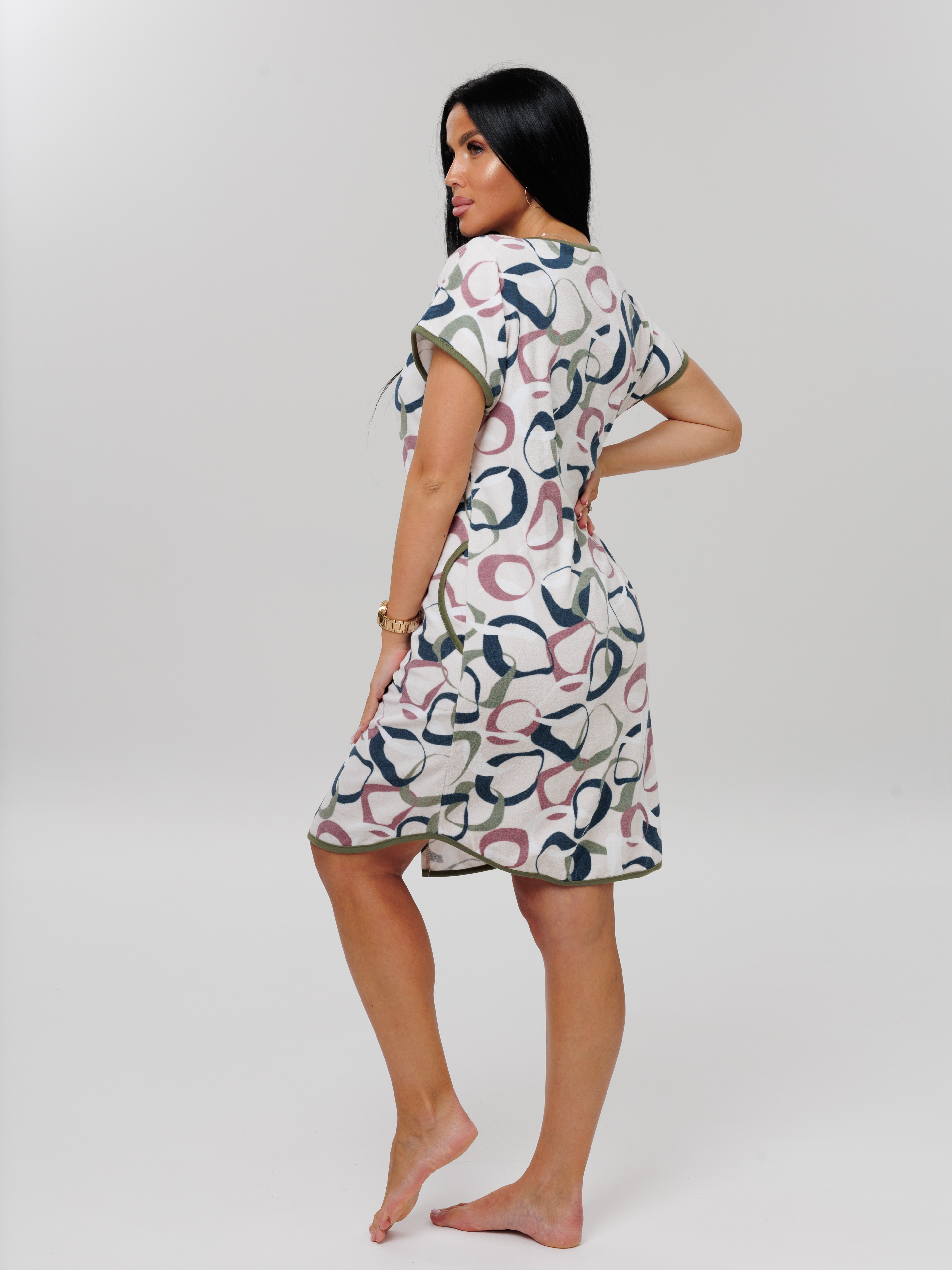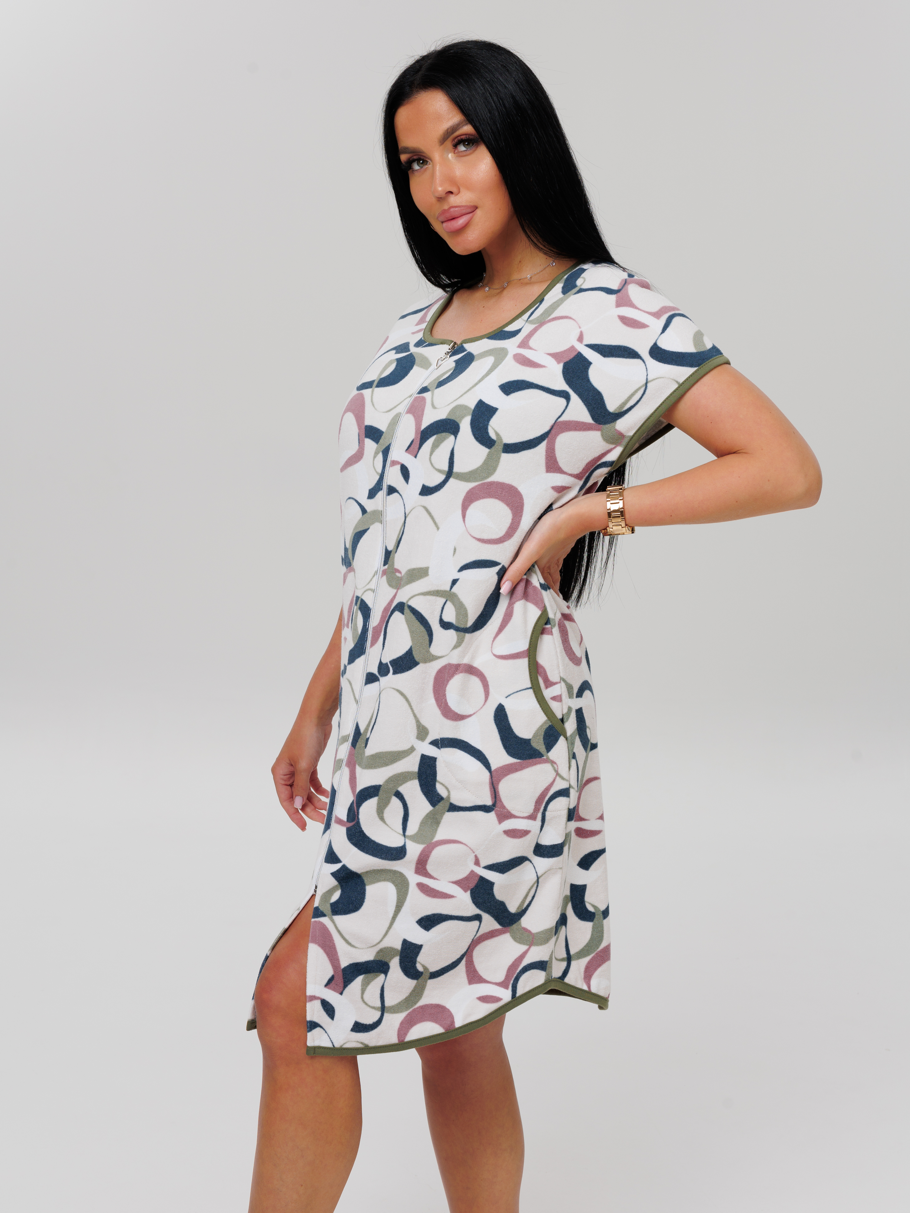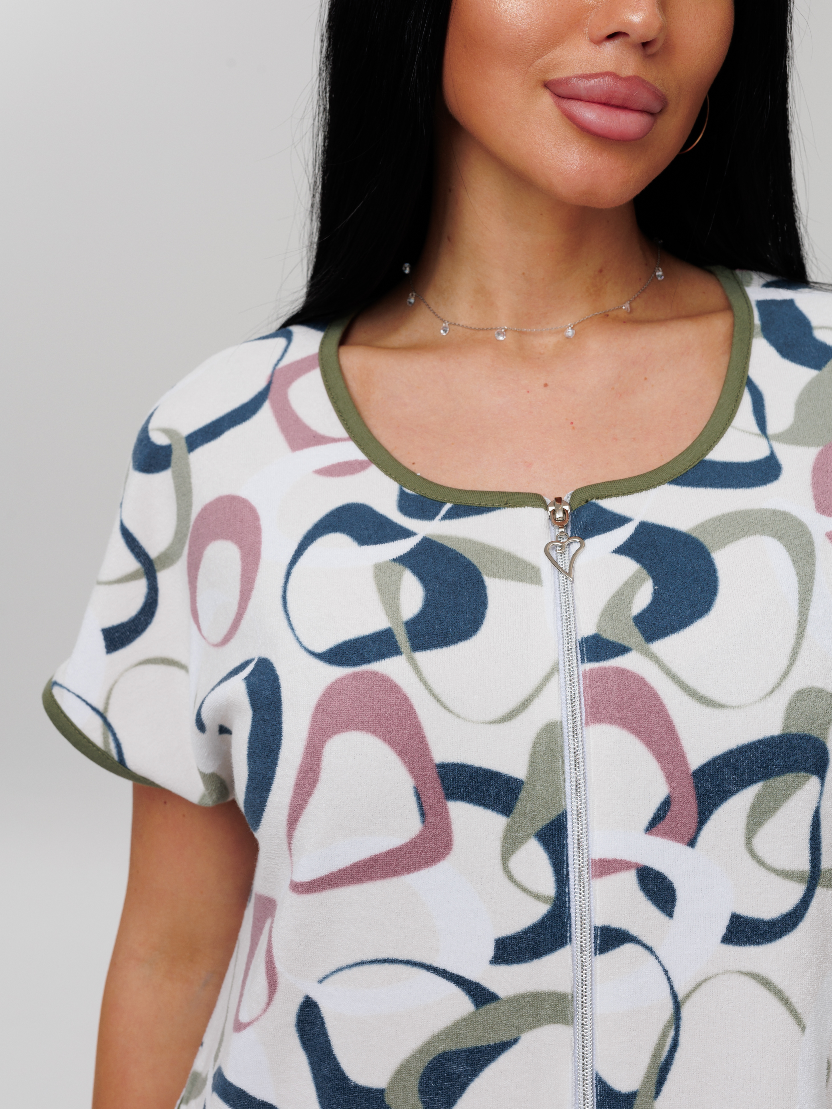 Женский халат Х-144(М) с короткими рукавами, из махровой хлопковой ткани. Домашний халат длиной по колено, на молнии, украшен окантовкой контрастного цвета.