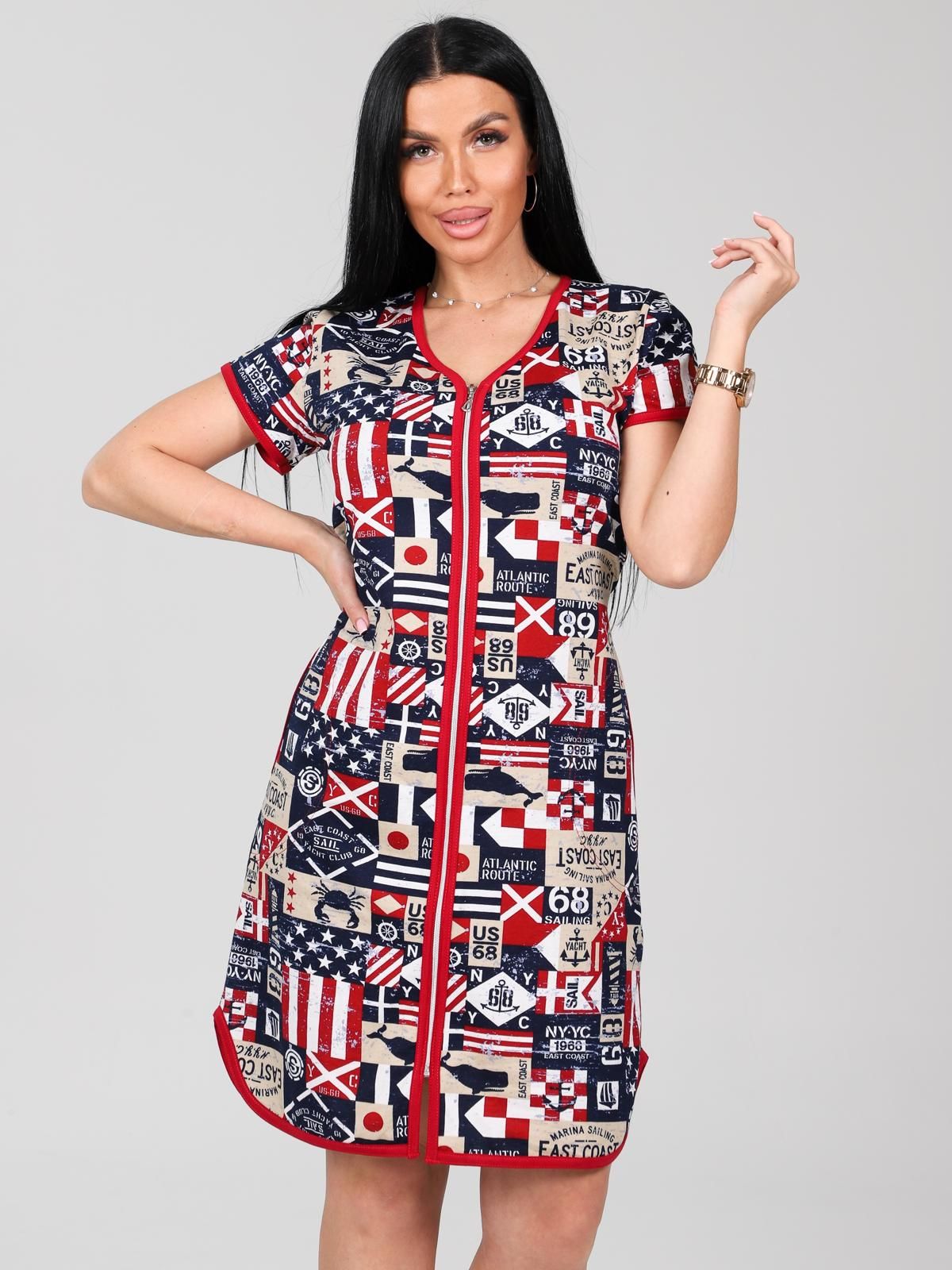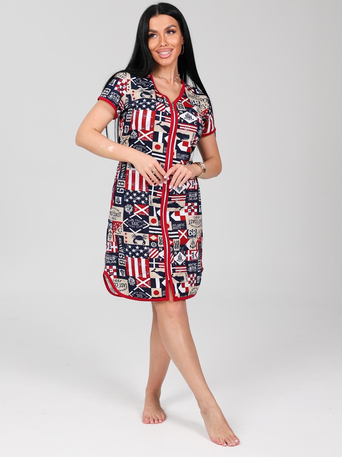Халат из набивной кулирки. Фигурная горловина, борта, низ короткого рукава и фигурный низ халата отделаны окантовкой. Застежка-молния халата отделочная, что дополнительно придает колорит изделию, придавая обладательнице отличное настроение.