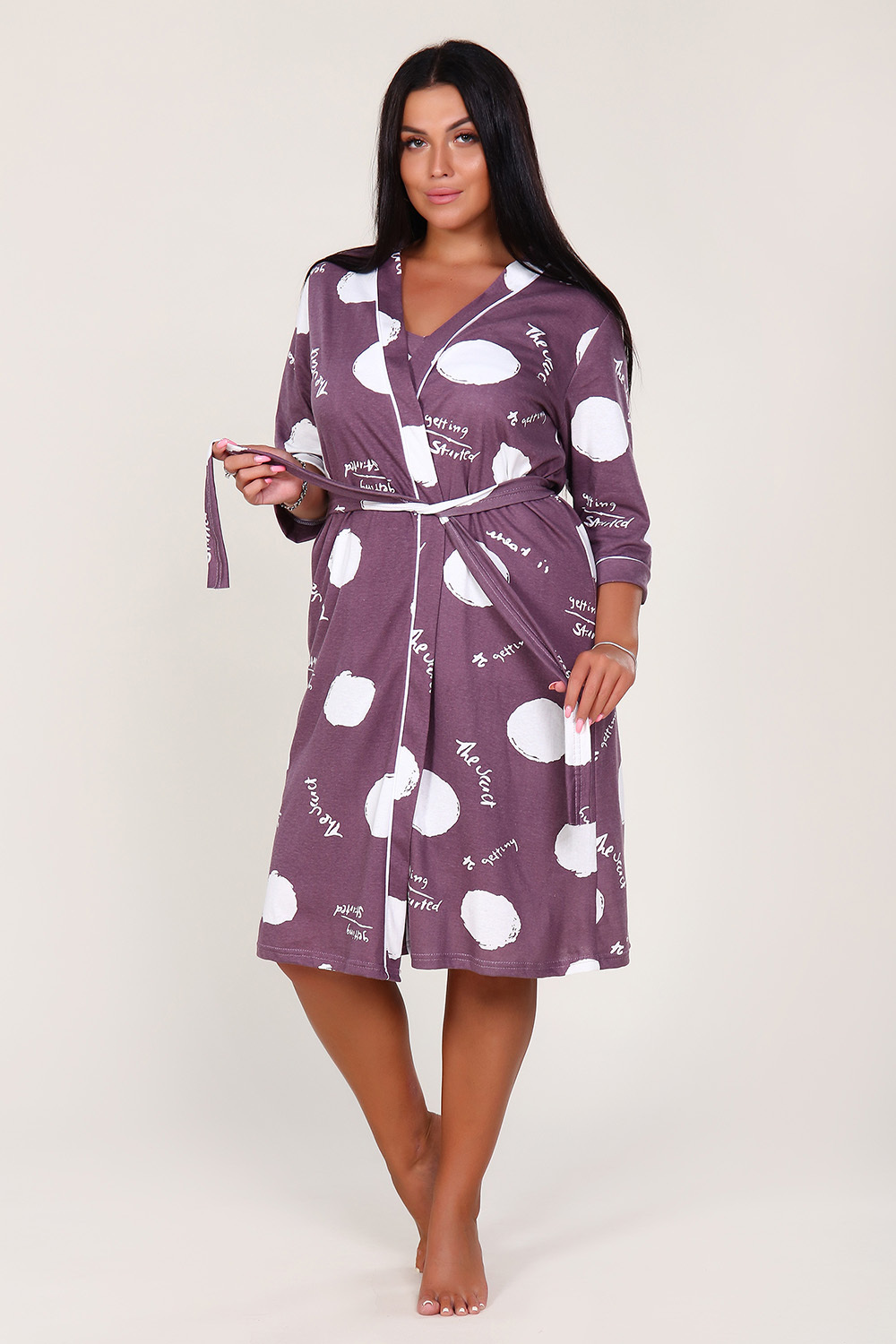 Женский комплект из халата, топа и шорт из кулирки — это домашняя одежда, которая сочетает комфорт и практичность. Кулирка — тонкое трикотажное полотно из 100% хлопка, которое хорошо тянется, не мнётся и позволяет коже дышать. Такие комплекты подходят для дома, отдыха, сна или использования в качестве пижамного комплекта.