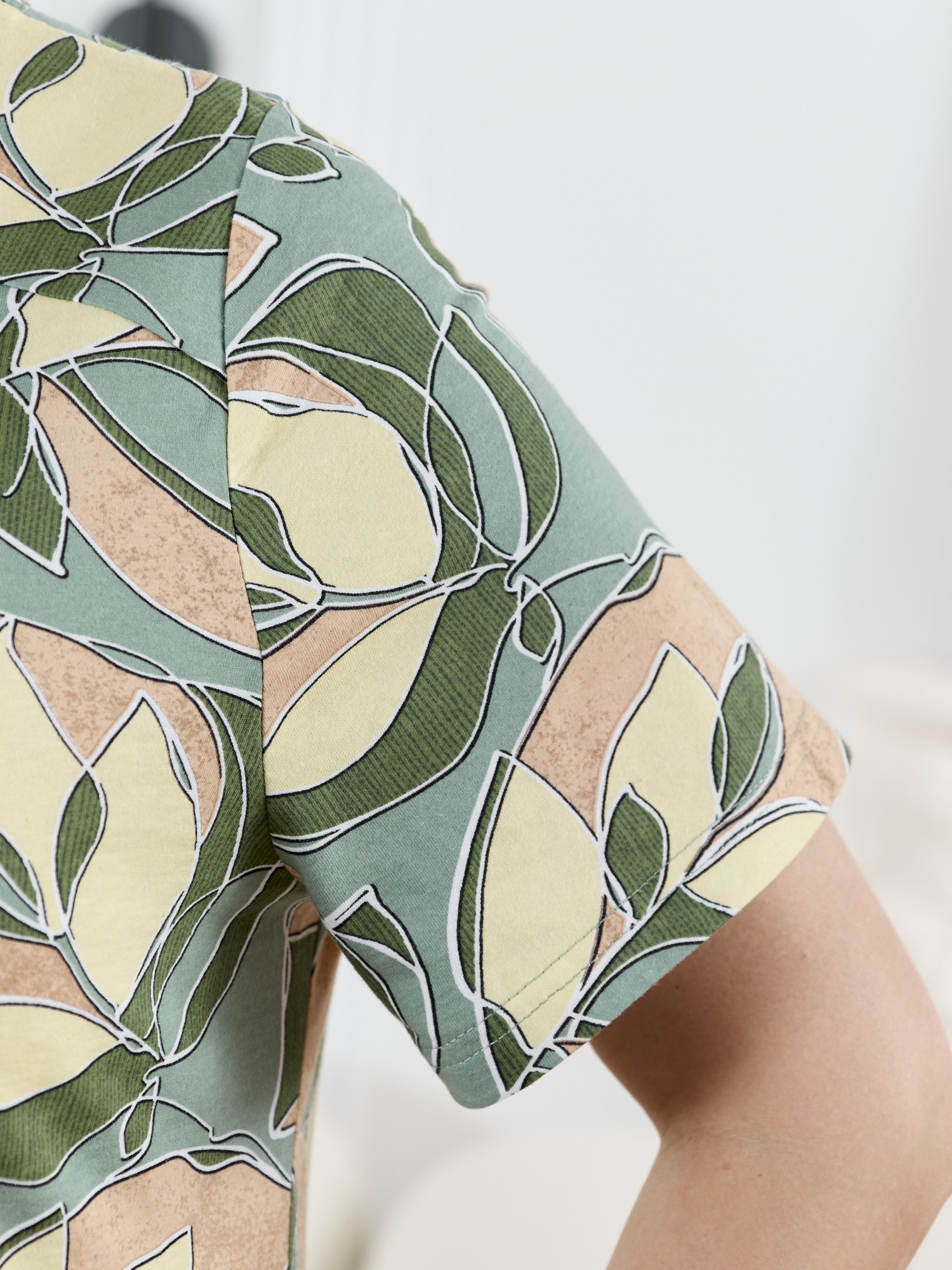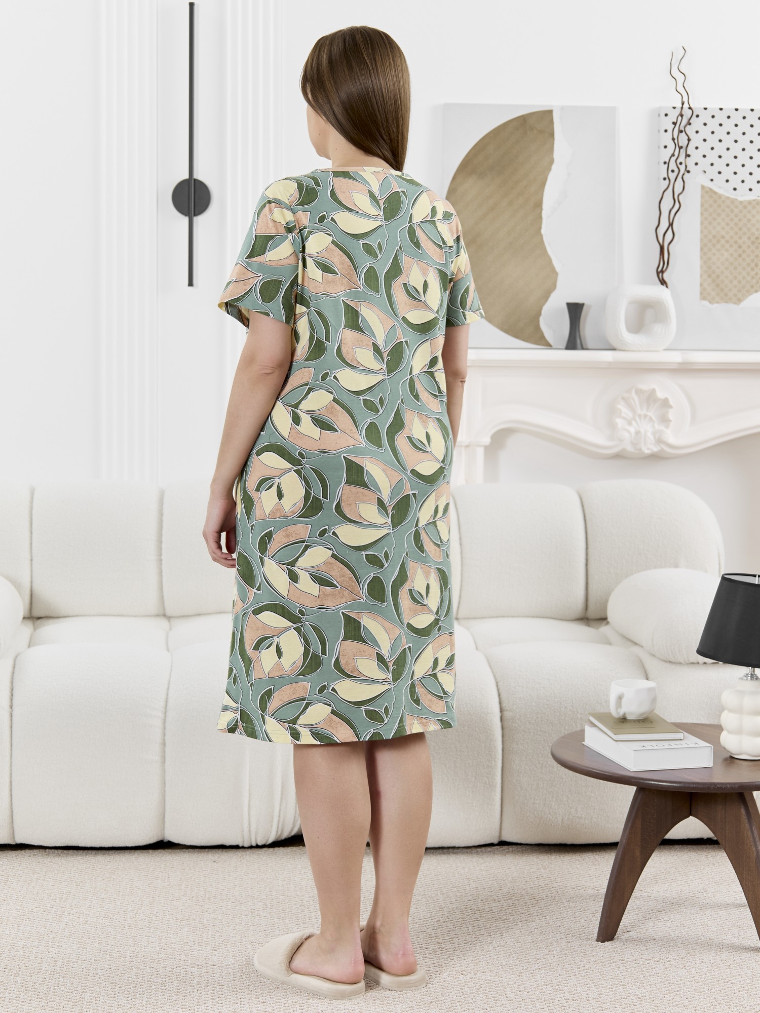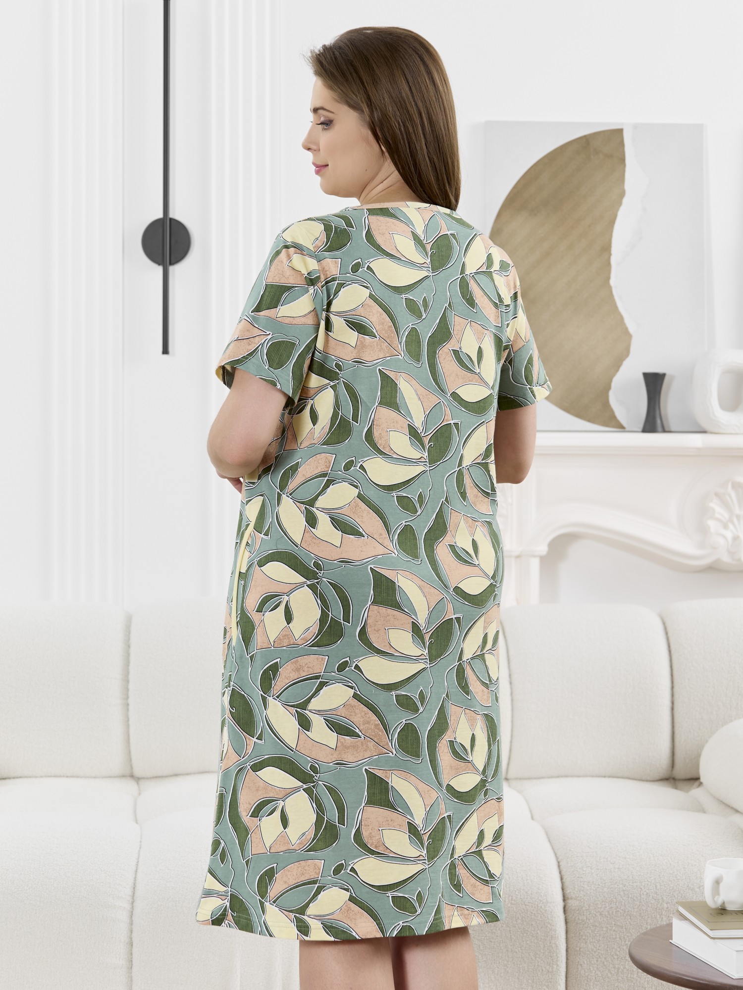 Халат женский из трикотажного полотна «кулирка» с набивным рисунком, прямого силуэта, с короткими втачными рукавами, горловиной V- образной формы, карманами в боковых швах и центральной бортовой застежкой на тесьму «молния». Полочка – с двумя небольшими двойными кокетками, выполненными по косой линии. Горловина переда, входы в карманы окантованы контрастным материалом.