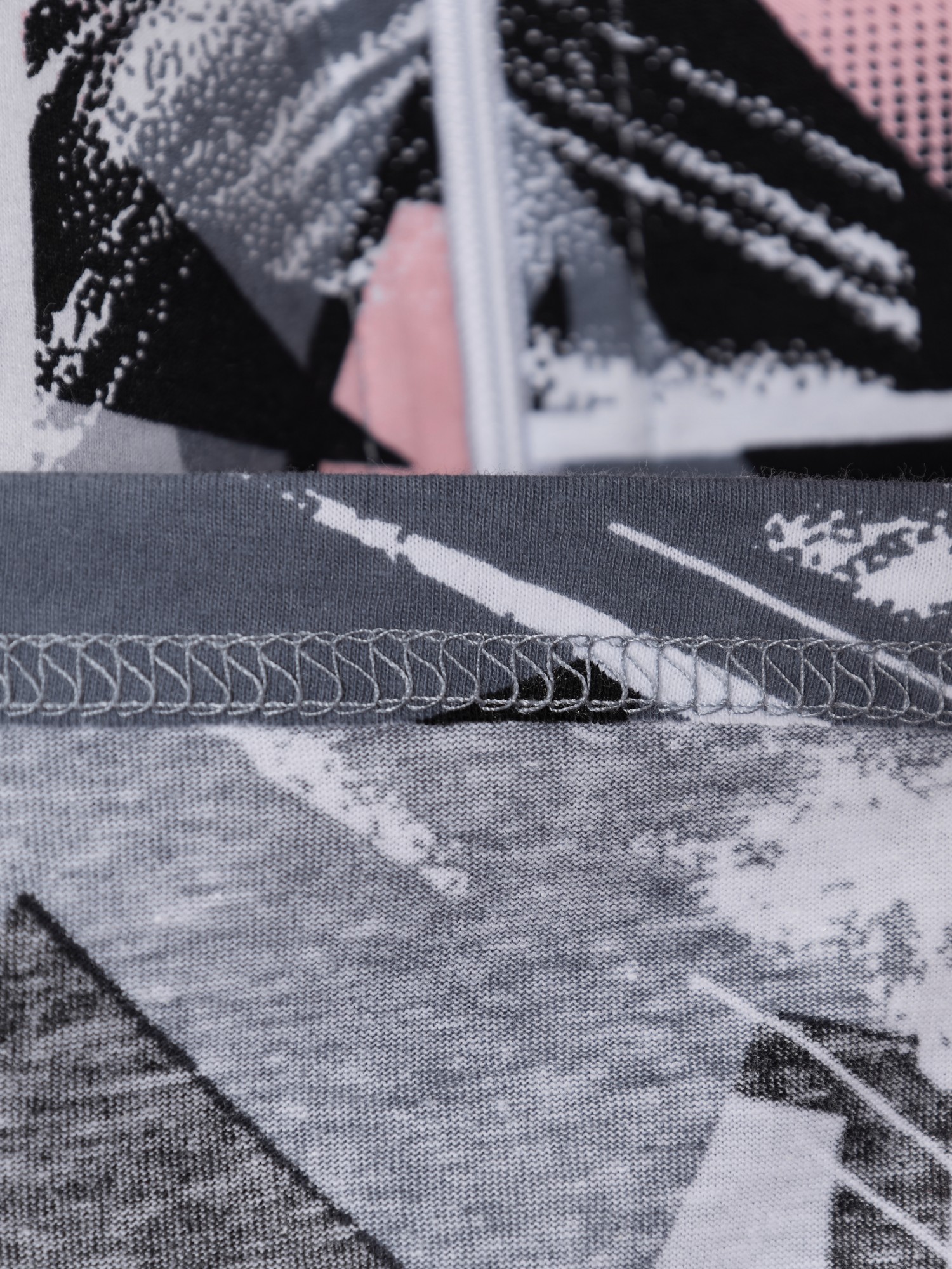 Халат женский из трикотажного полотна «кулирка» с набивным рисунком, прямого силуэта, с короткими втачными рукавами, горловиной V- образной формы, карманами в боковых швах и центральной бортовой застежкой на тесьму «молния». Полочка – с двумя небольшими двойными кокетками, выполненными по косой линии. Горловина переда, входы в карманы окантованы контрастным материалом.