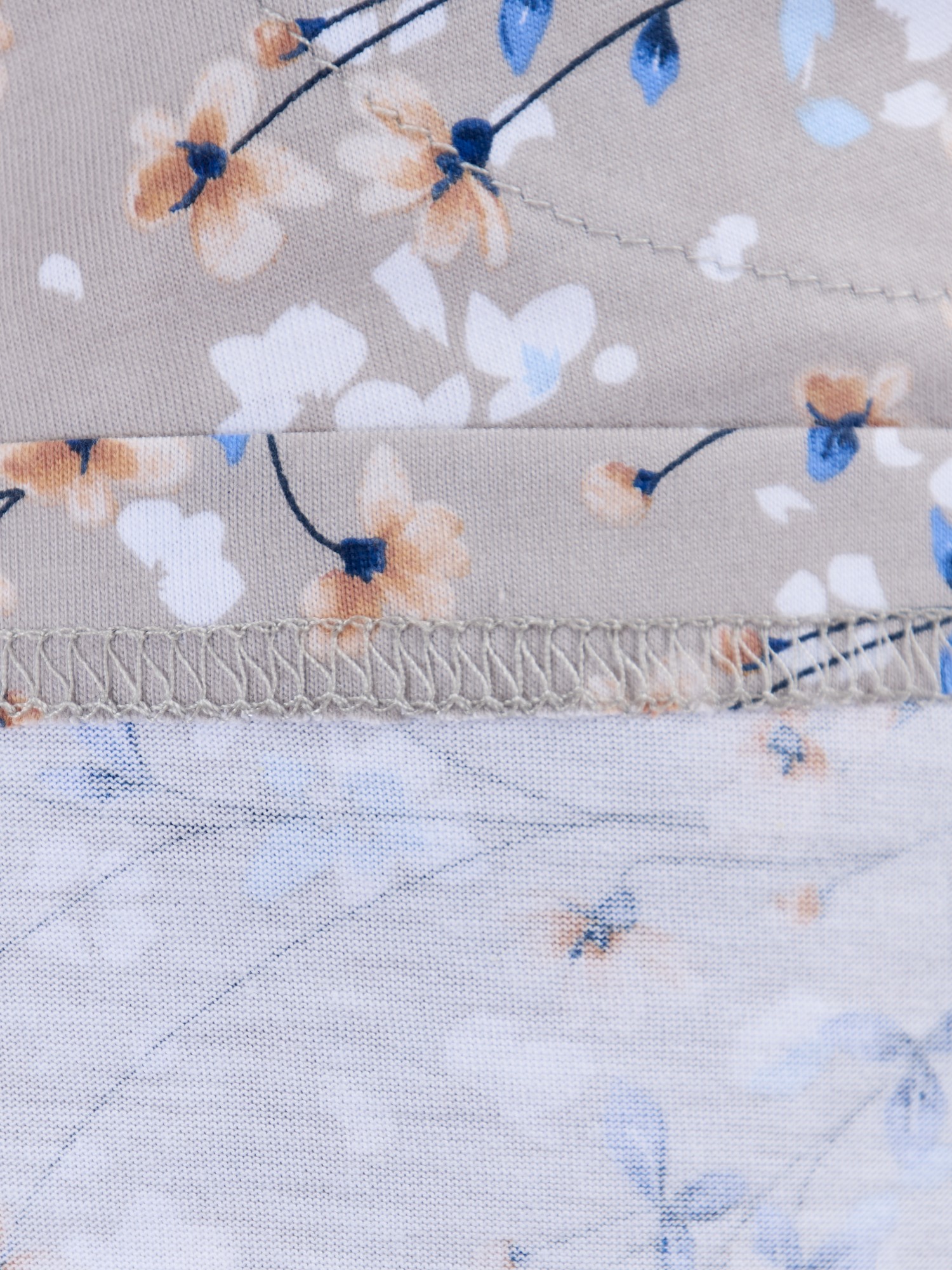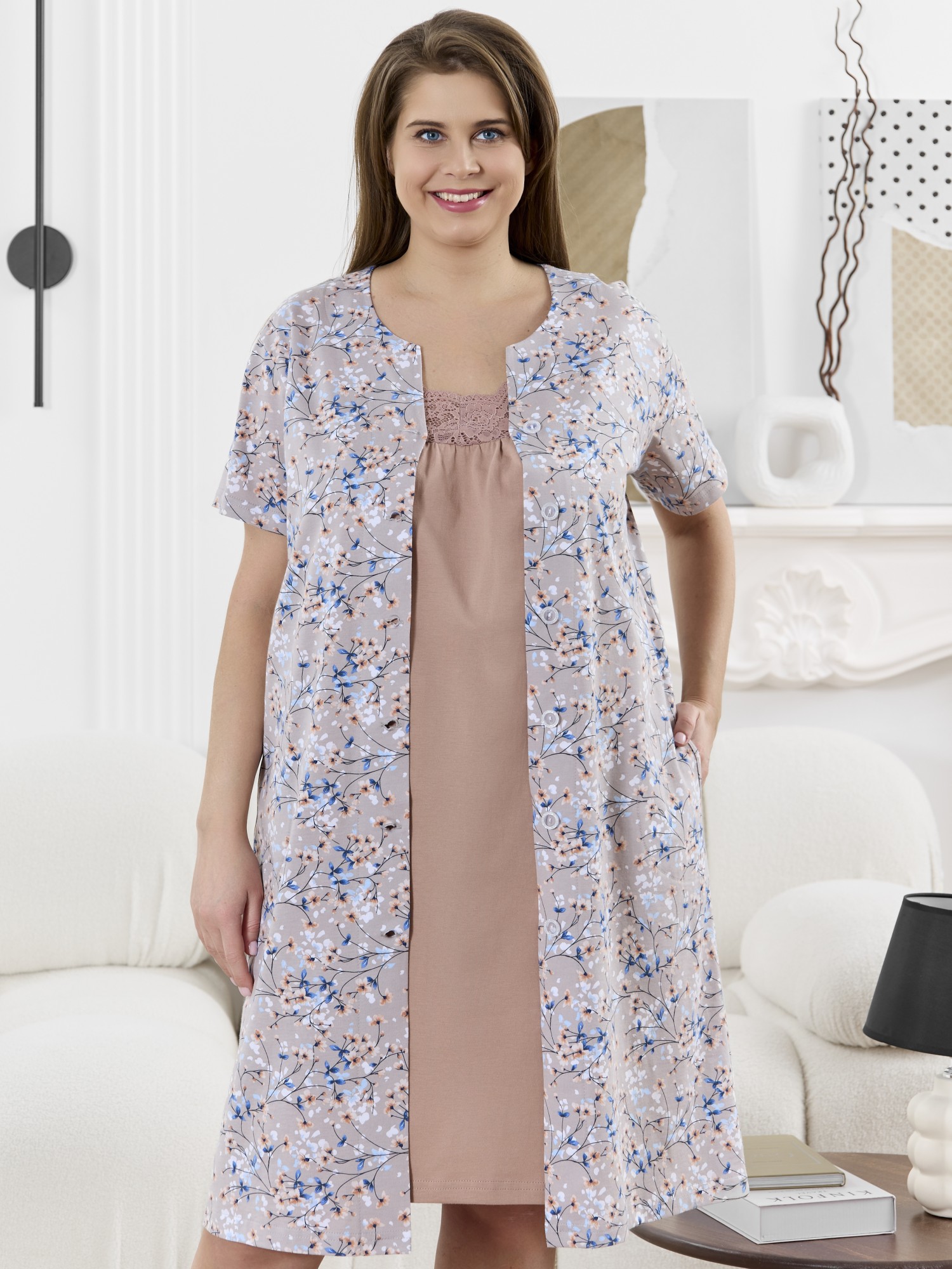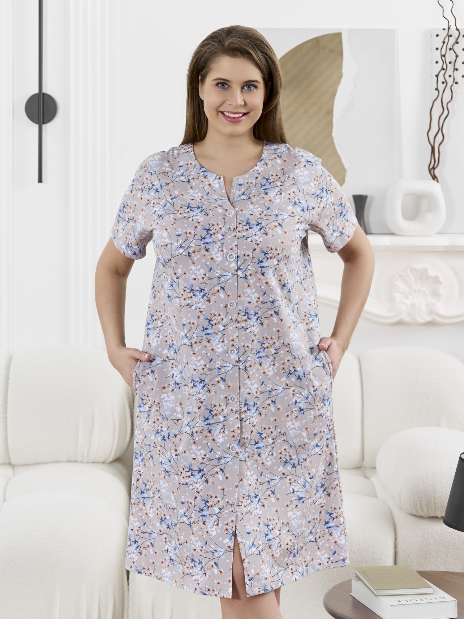 Халат женский из трикотажного полотна «кулирка» с набивным рисунком, прямого силуэта, с короткими втачными рукавами, карманами в боковых швах и центральной бортовой застежкой на обметанные петли и пуговицы. Горловина – овальной формы, переходящая в небольшой v-образный вырез выше верхней пуговицы. Входы в карманы и горловина спинки окантованы.