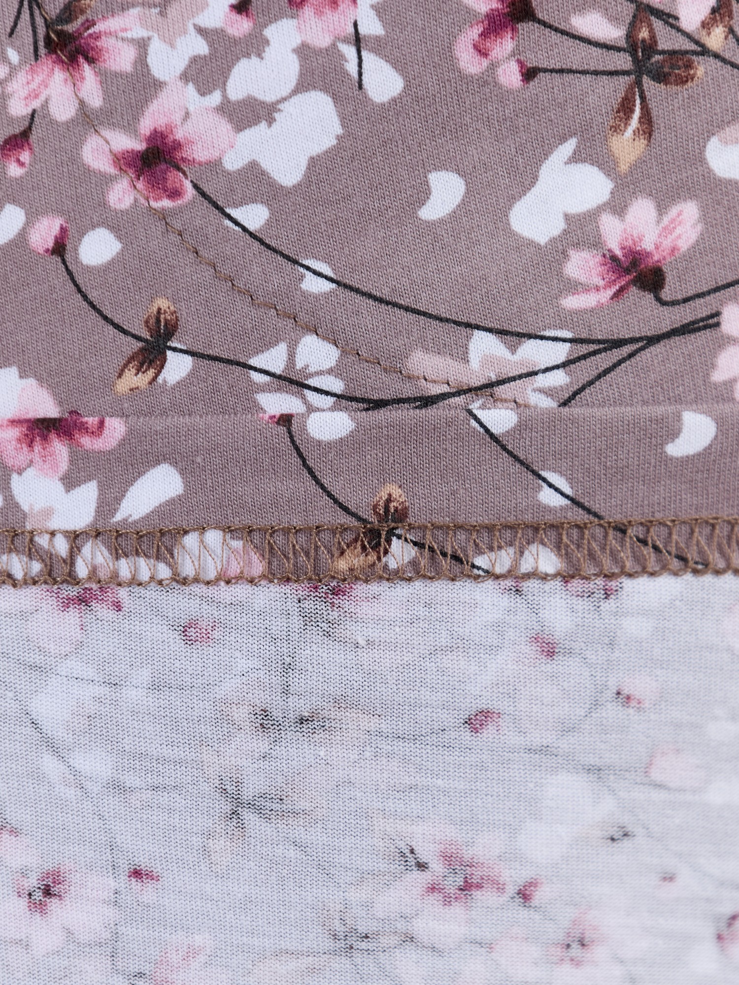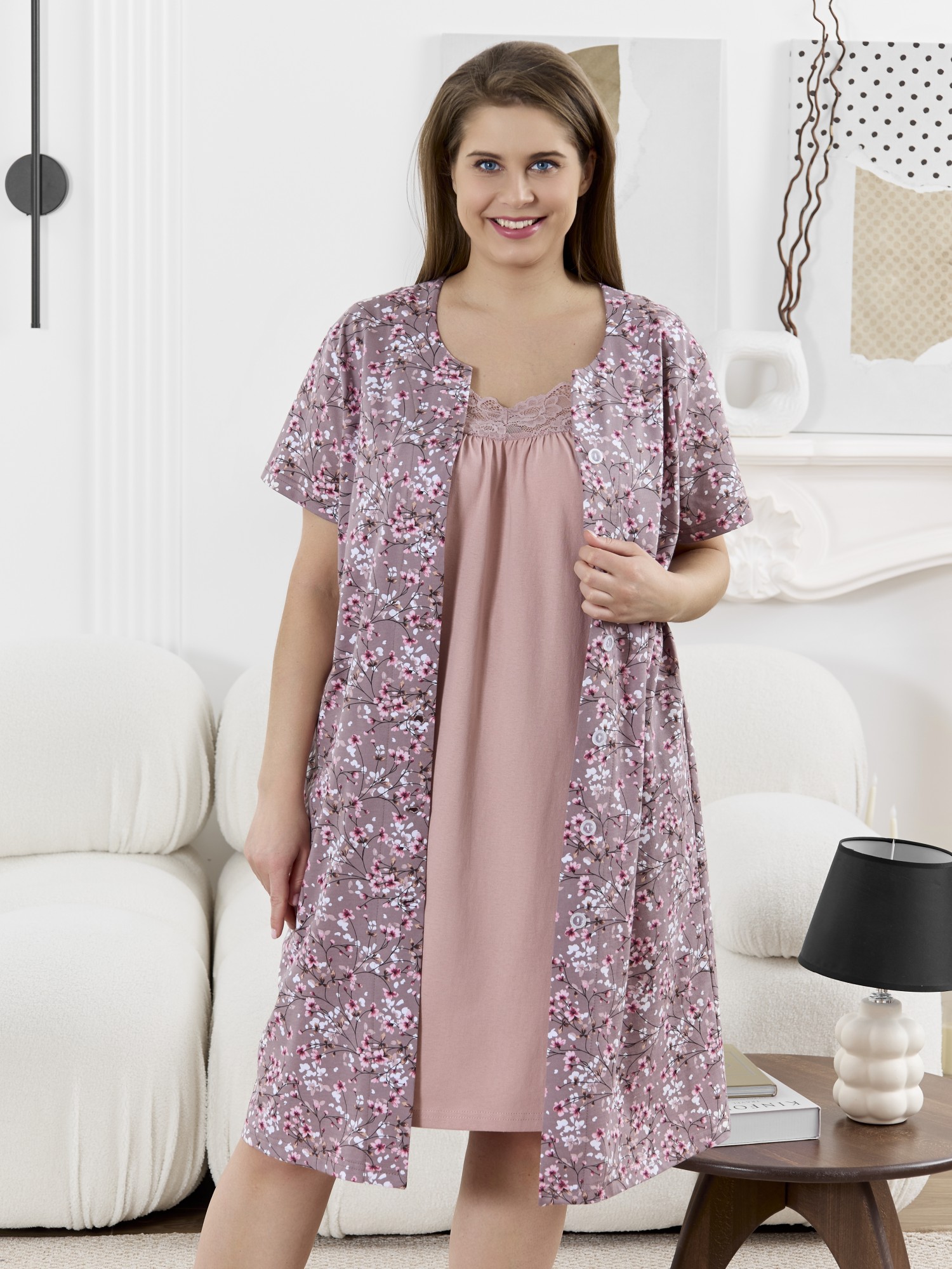 Халат женский из трикотажного полотна «кулирка» с набивным рисунком, прямого силуэта, с короткими втачными рукавами, карманами в боковых швах и центральной бортовой застежкой на обметанные петли и пуговицы. Горловина – овальной формы, переходящая в небольшой v-образный вырез выше верхней пуговицы. Входы в карманы и горловина спинки окантованы.
