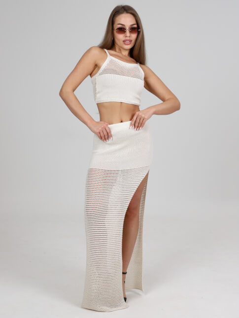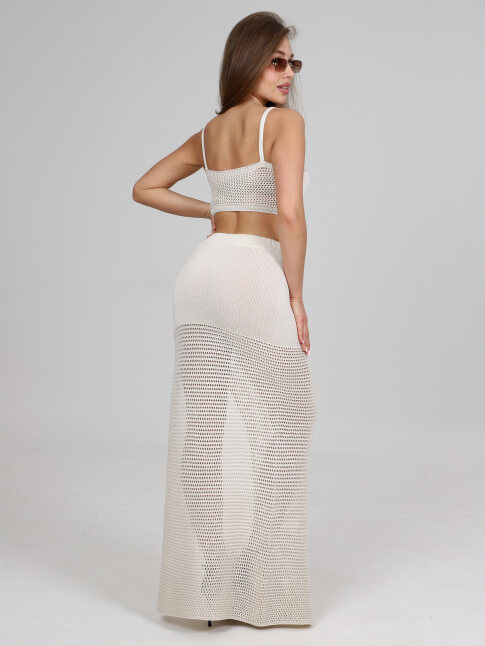 Полупрозрачный комплект, состоящий из длинной юбки в сетку и соблазнительного топа, перенесет вас в атмосферу летней безмятежности. Костюм интригует своей полупрозрачностью, создавая завораживающий эффект, который подчеркнет ваше очарование и добавит изюминку вашему пляжному образу.