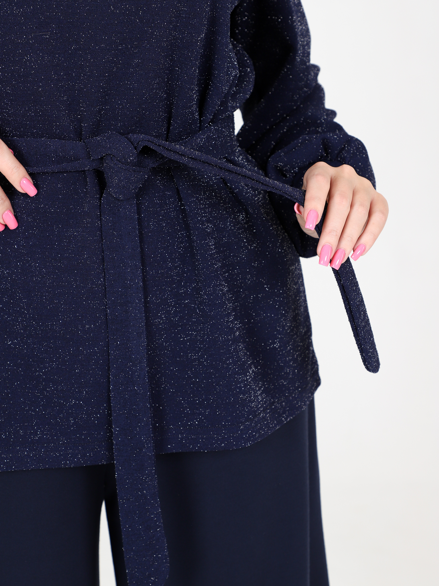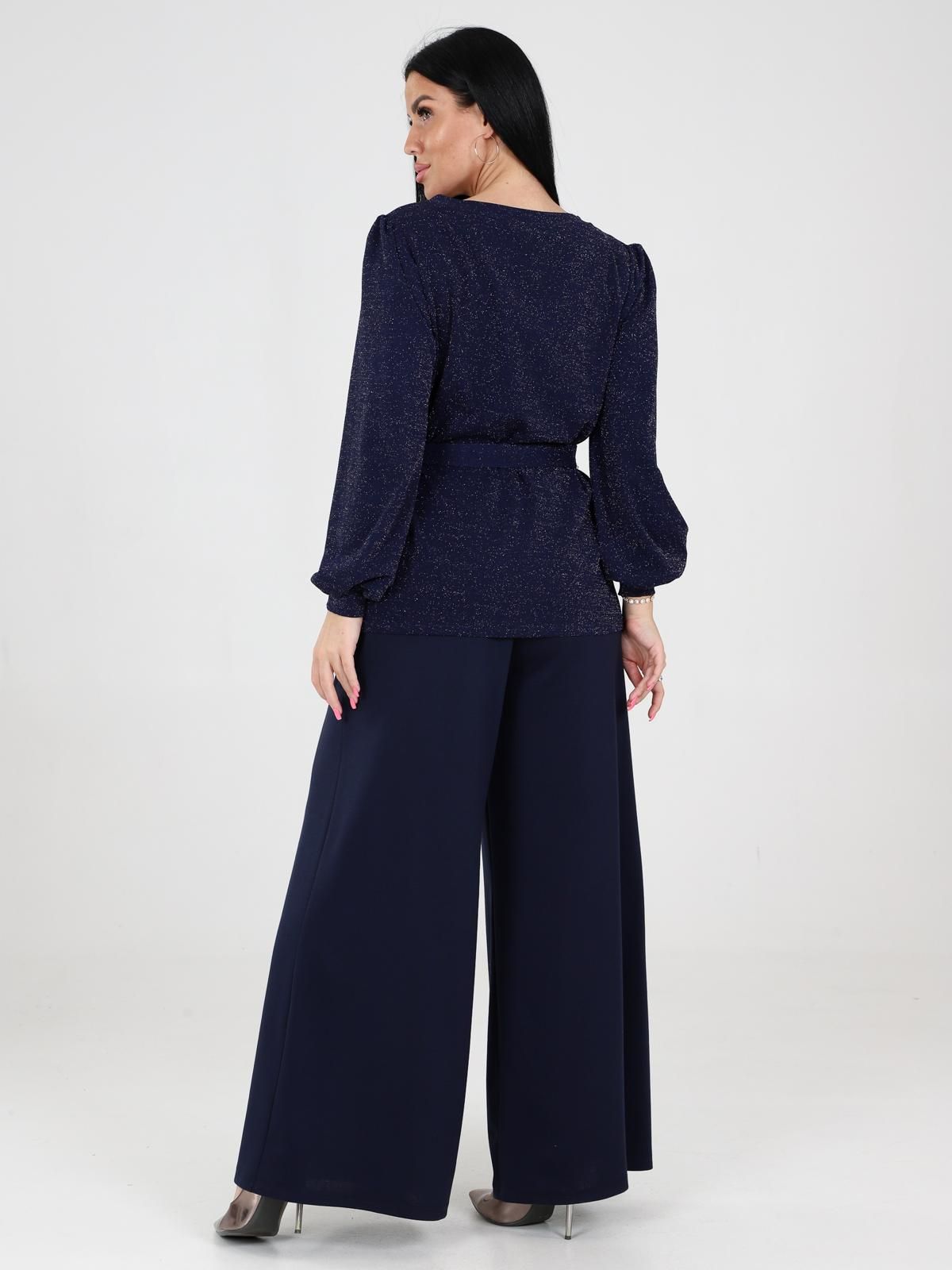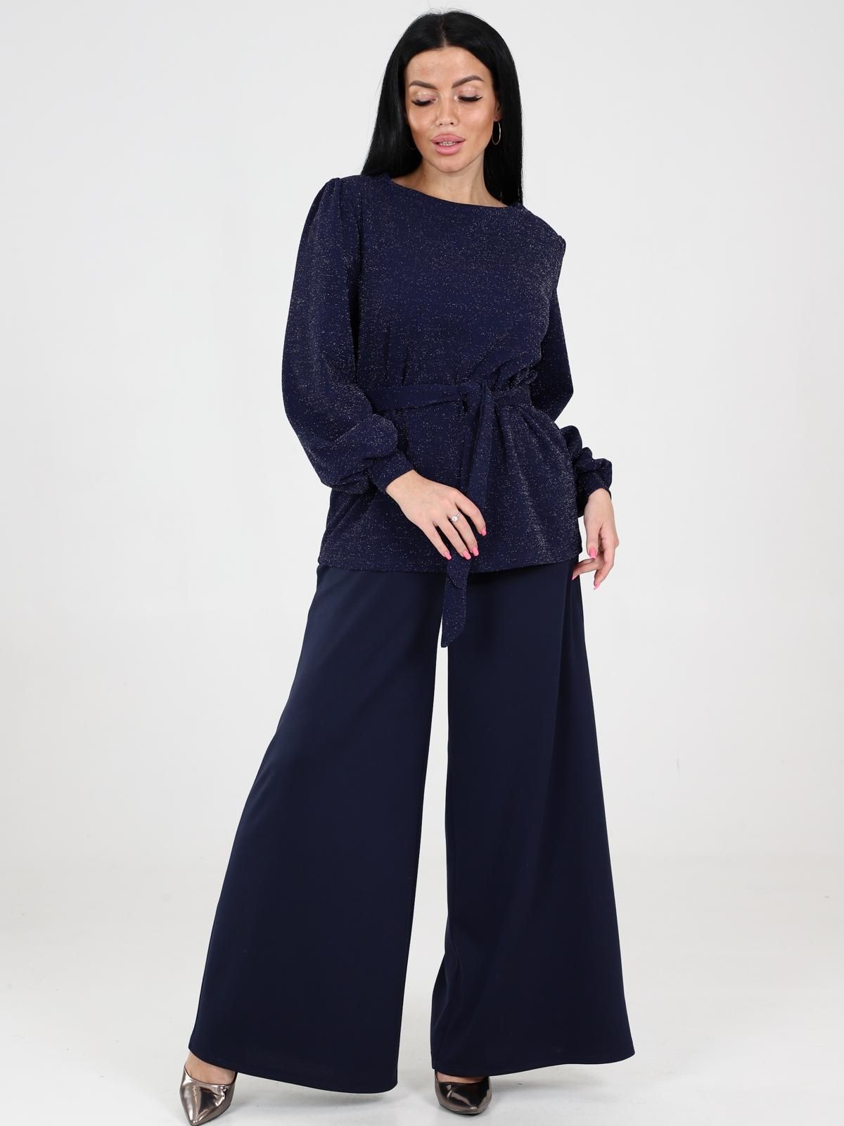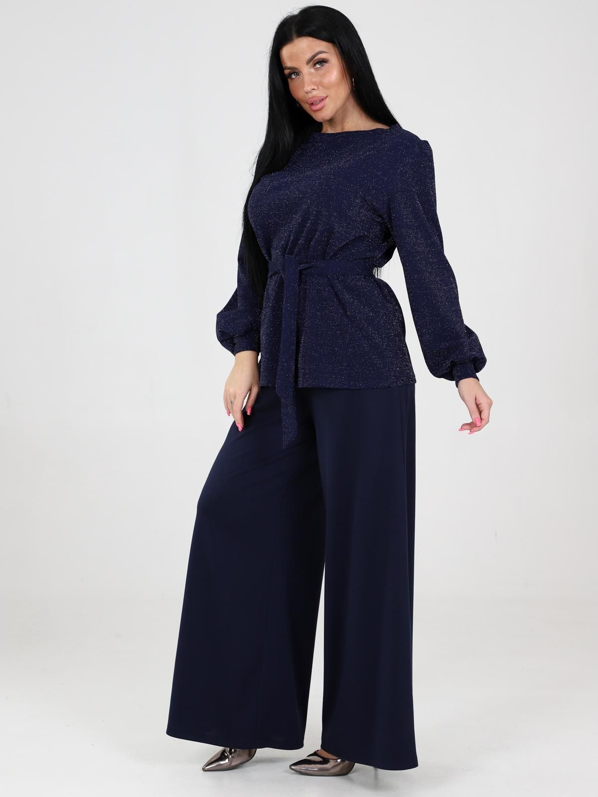 Костюм женский Цепочка состоит из блузы с длинными рукавами и широких брюк. Блуза с поясом, который подчеркивает талию. Рукава объемные, с манжетами, что добавляет образу элегантности. Брюки имеют прямой крой, широкие и длинные, что создает эффектный и стильный силуэт. Такой костюм идеально подходит для прогулок, встреч или даже праздничных мероприятий.