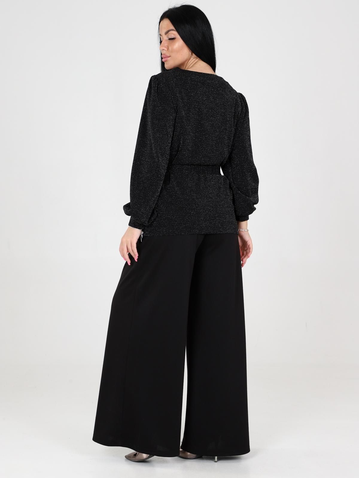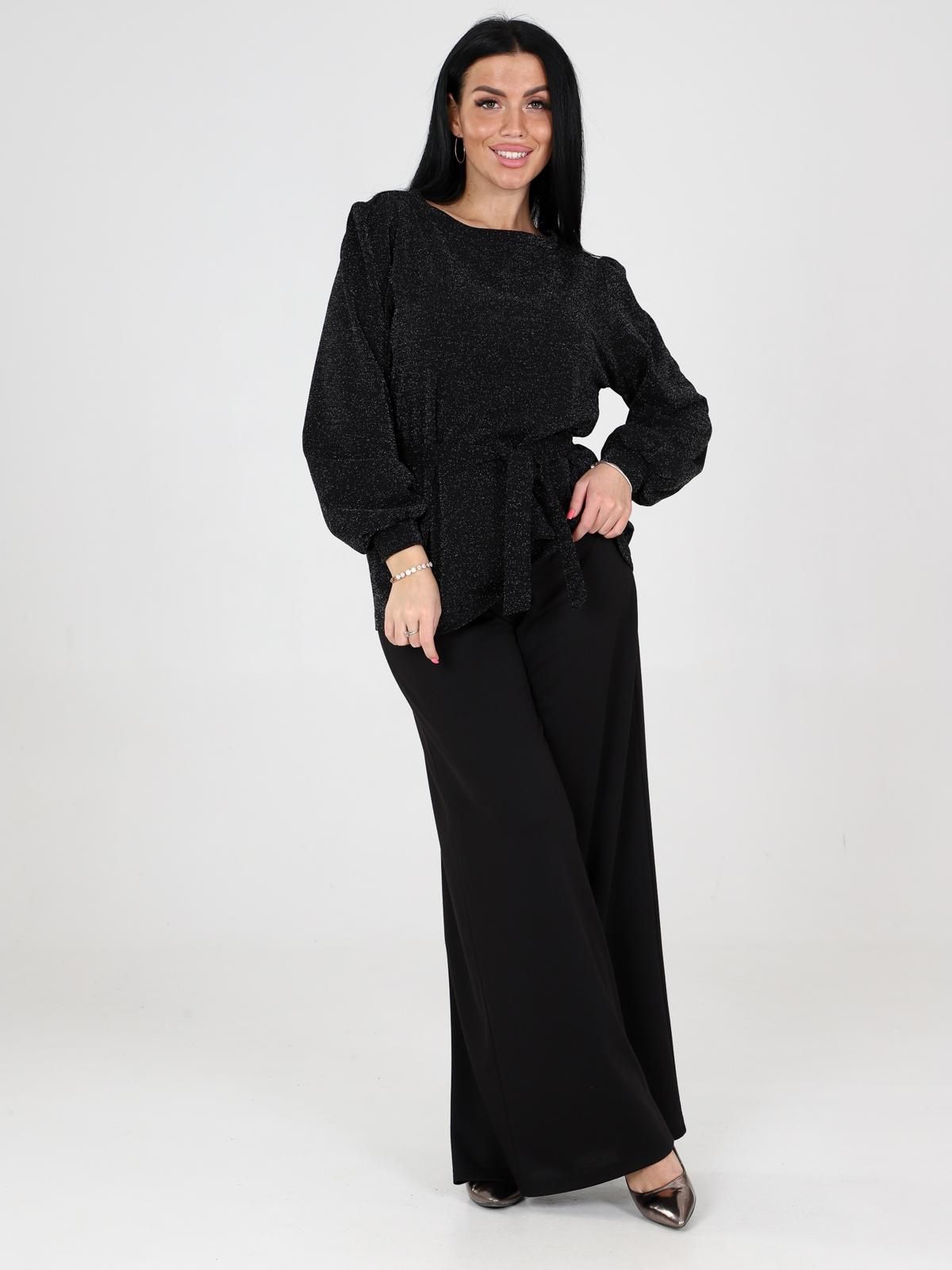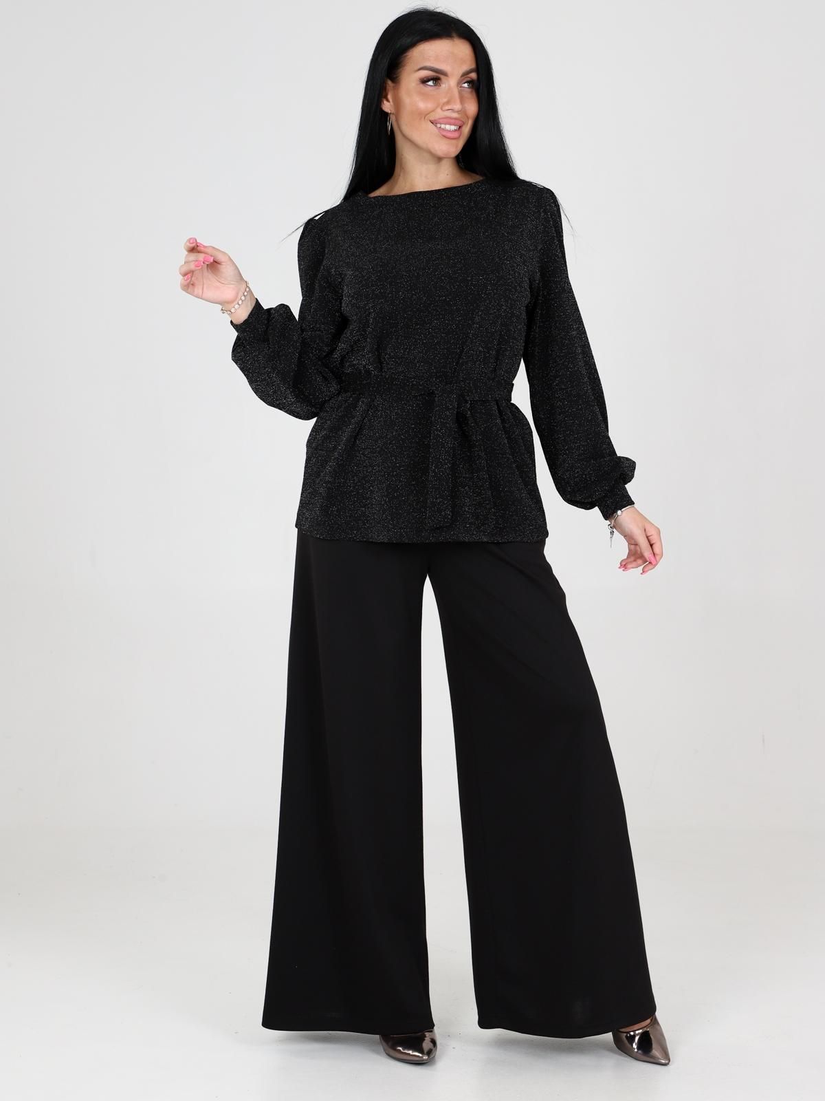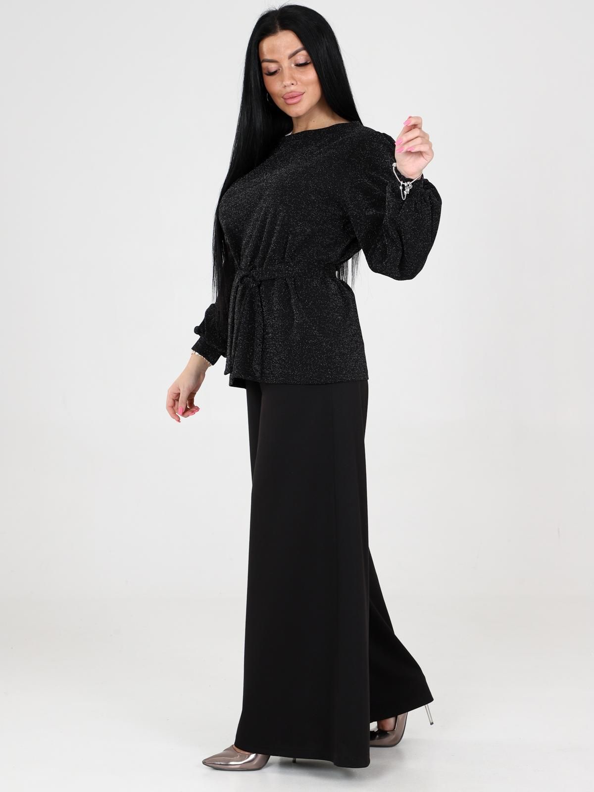 Костюм женский Цепочка состоит из блузы с длинными рукавами и широких брюк. Блуза с поясом, который подчеркивает талию. Рукава объемные, с манжетами, что добавляет образу элегантности. Брюки имеют прямой крой, широкие и длинные, что создает эффектный и стильный силуэт. Такой костюм идеально подходит для прогулок, встреч или даже праздничных мероприятий.