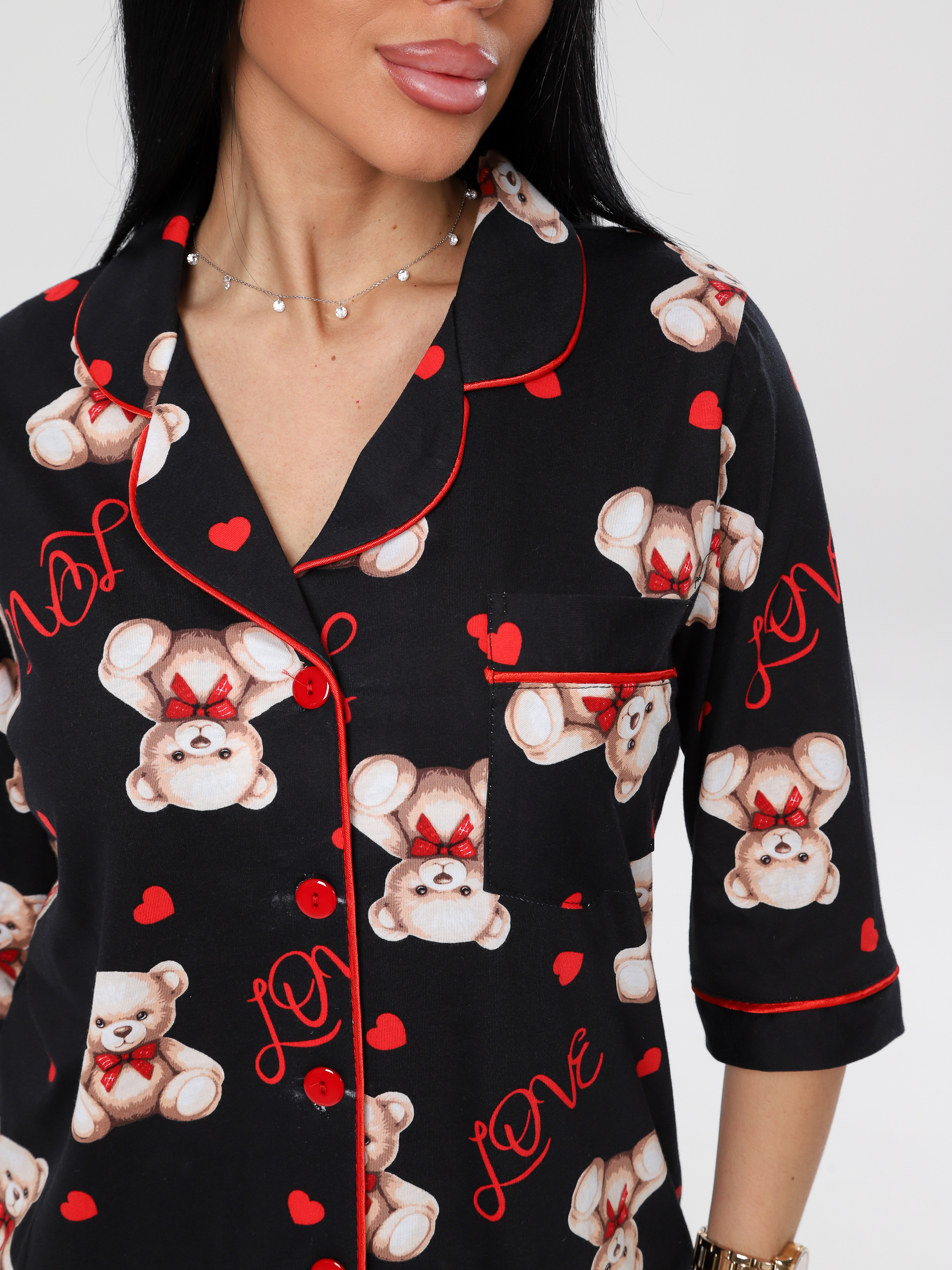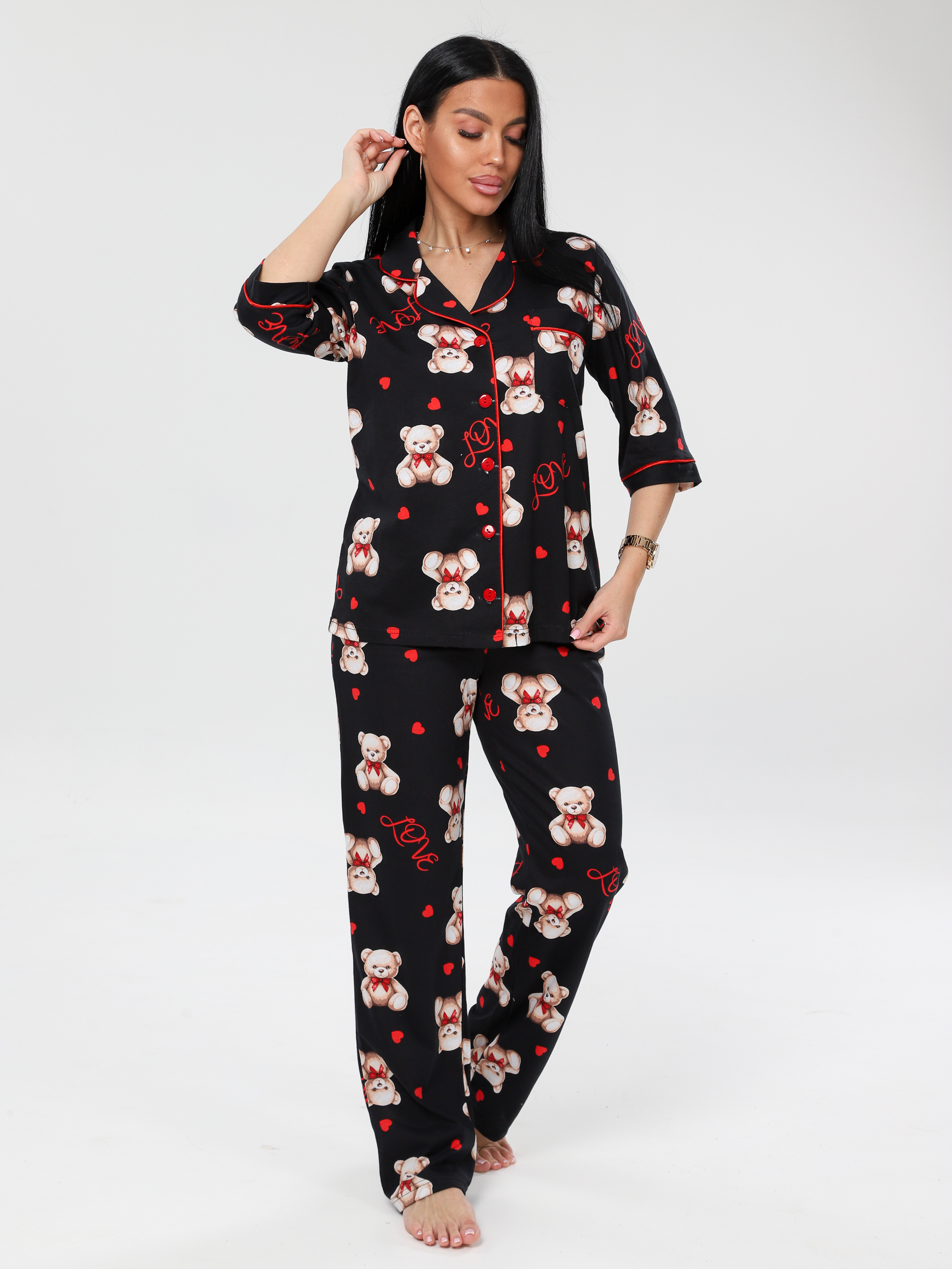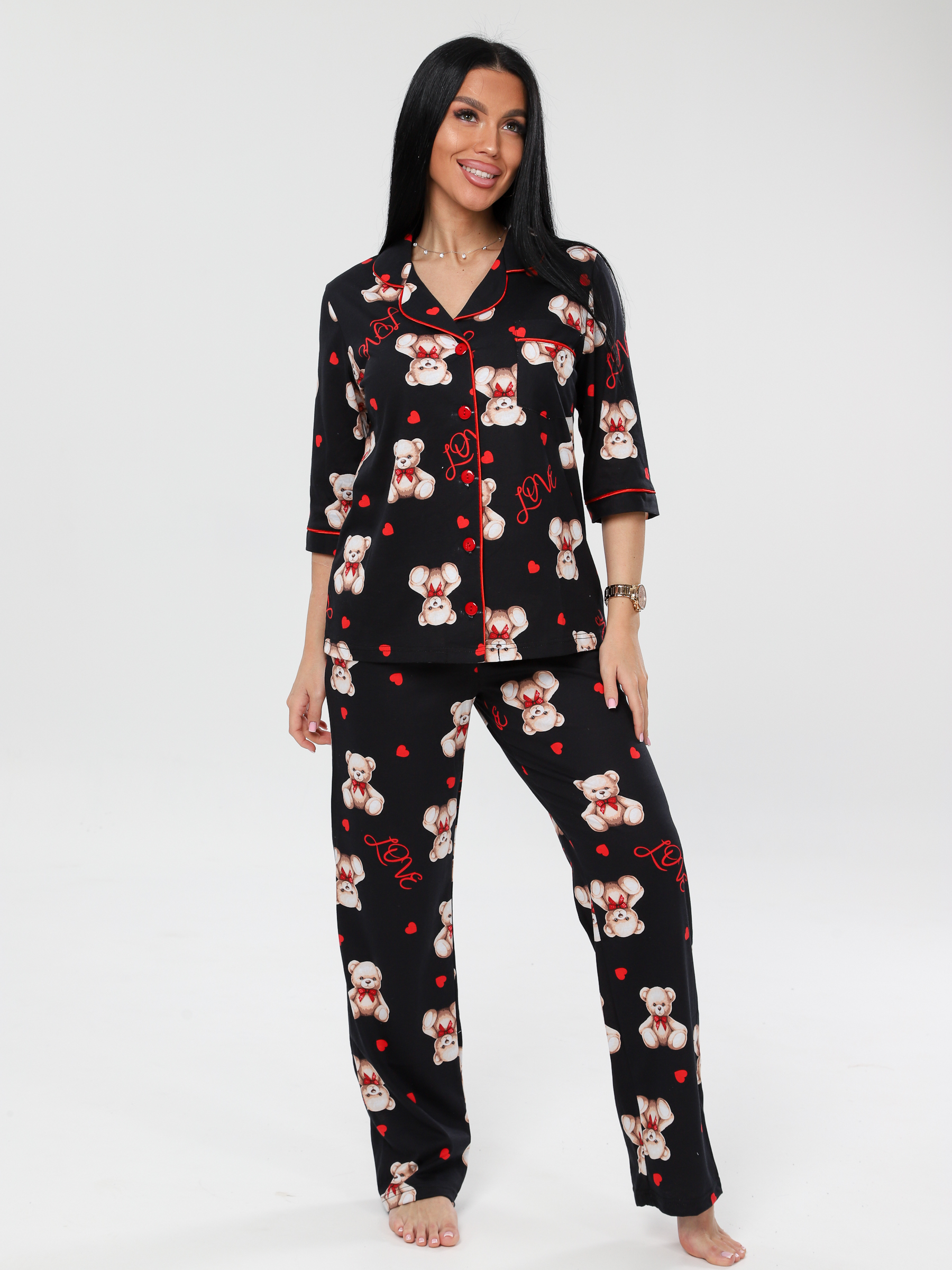 Женский костюм К-132(К) из кулирки, 100% хлопок. Женская пижама состоит из рубашки на пуговицах, с рукавами 3/4 и пижамных брюк.