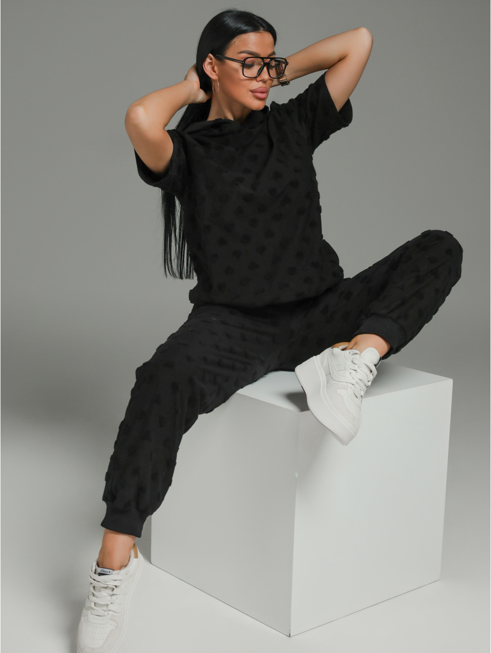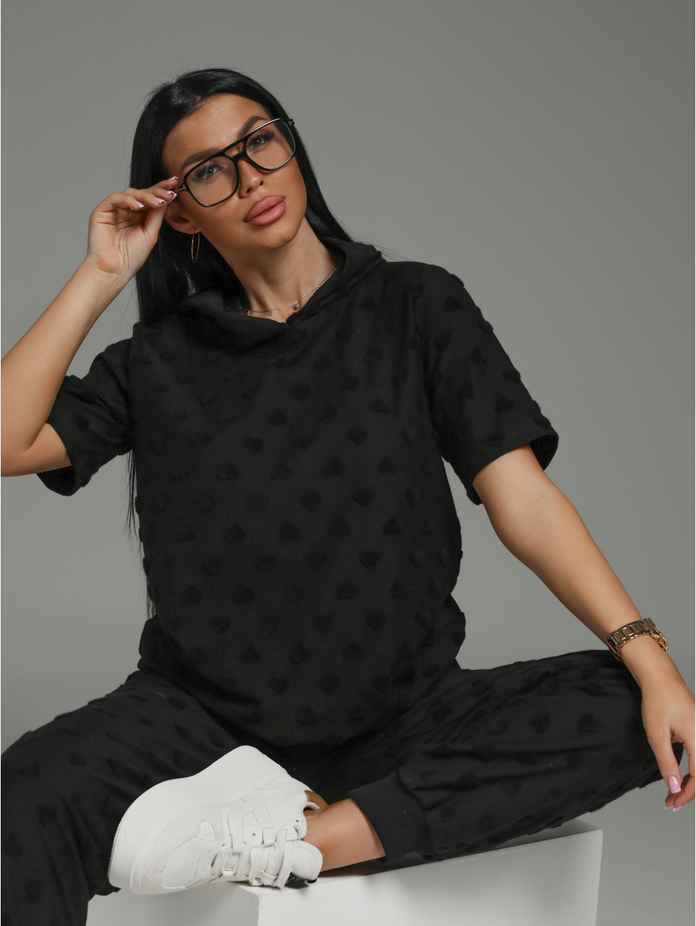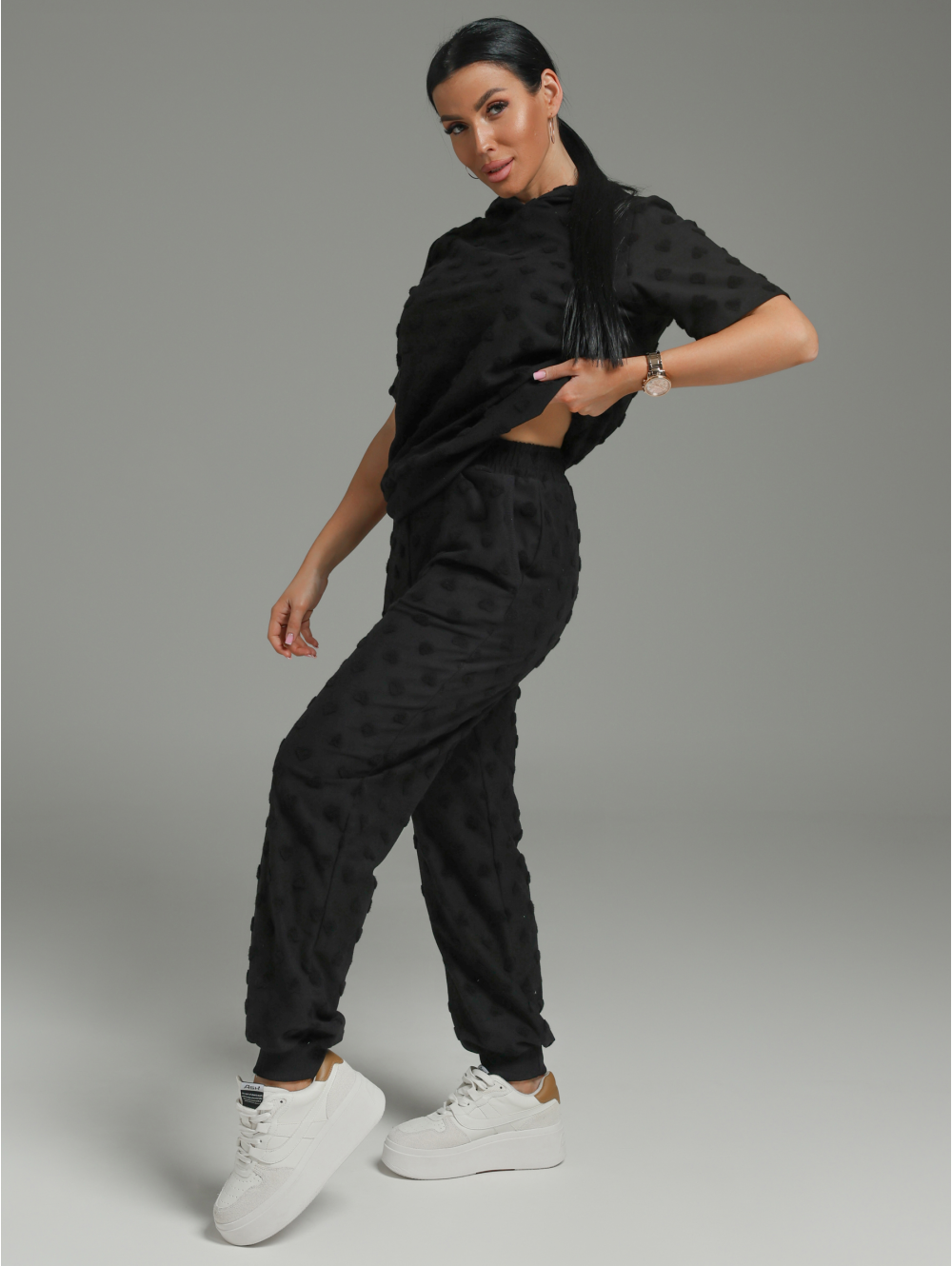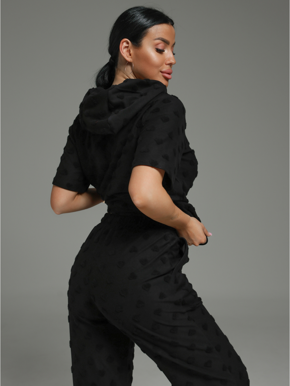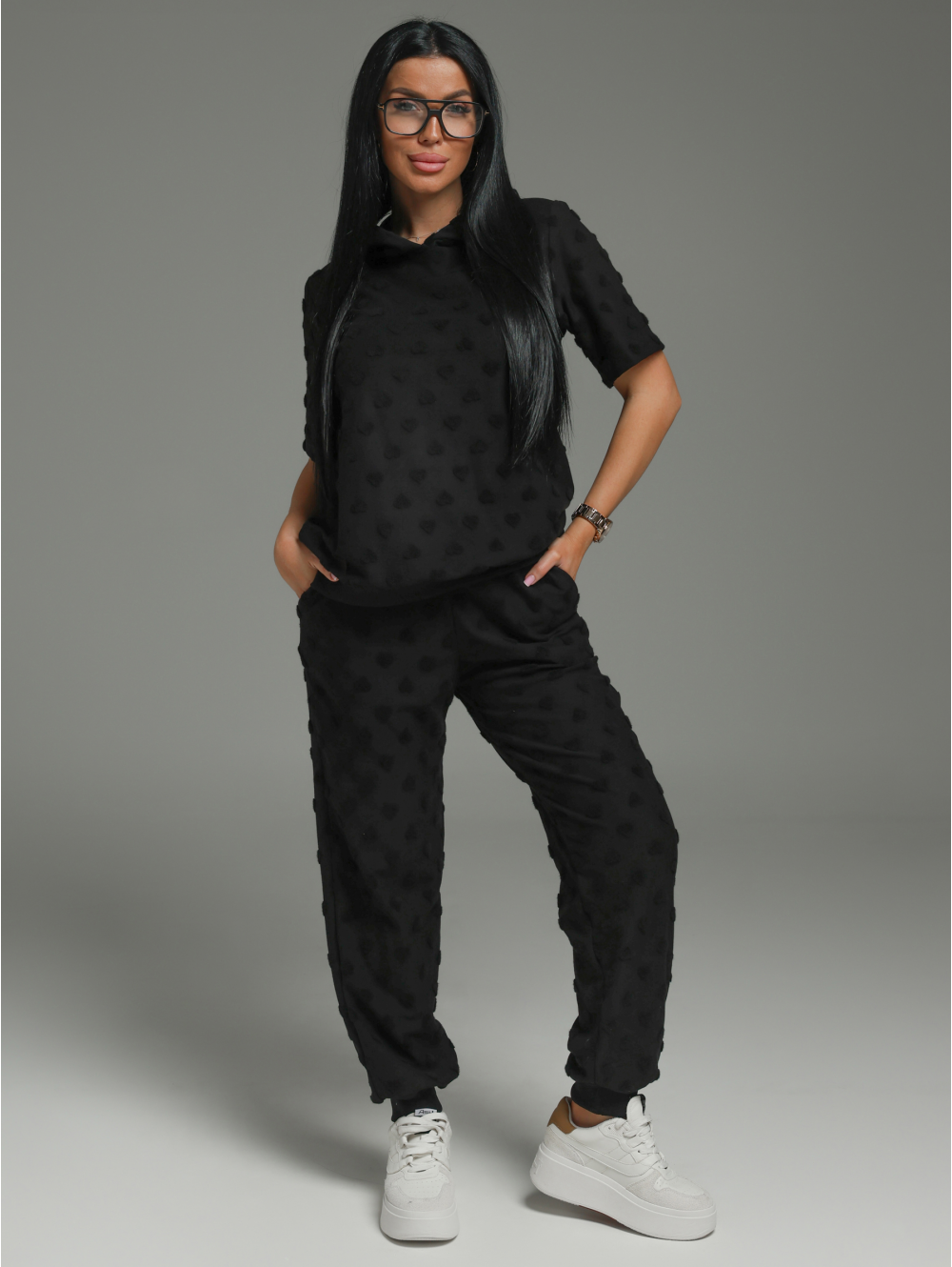 Костюм женский Суфле состоит из футболки и брюк. Футболка прямого силуэта с коротким рукавом и капюшоном. Брюки свободного силуэта с карманами.