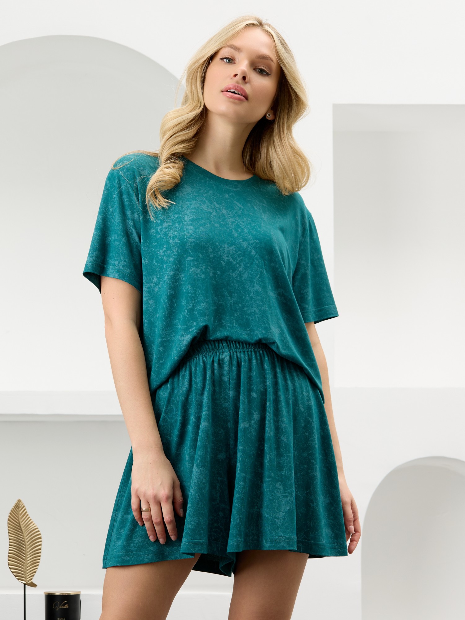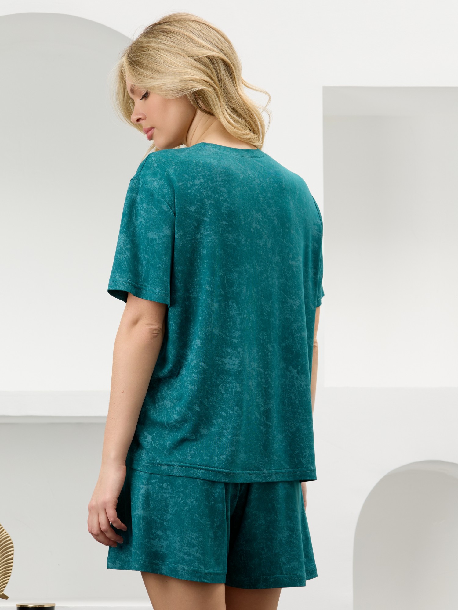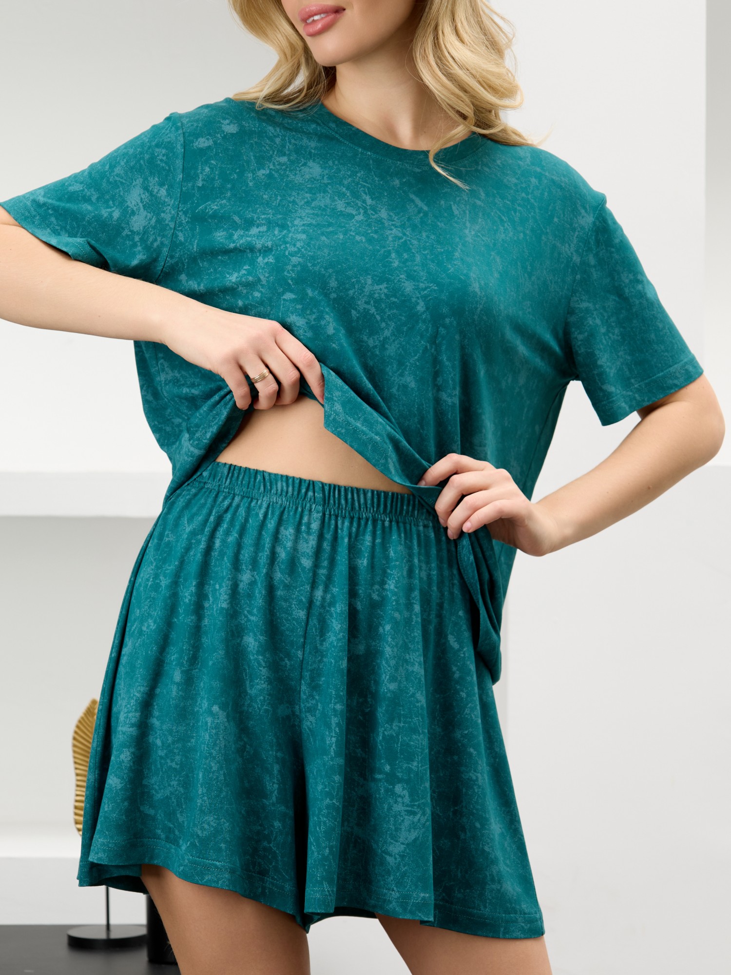 Костюм женский в комбинации двух видов полотен: из гладкокрашенного трикотажного вискозного полотна с эффектом «варенка», состоящий из футболки и шорт. Футболка - классического покроя, с короткими втачными рукавами, горловиной овальной формы, обработанной втачной планкой.Шорты – свободные, средней длины, с эластичной тесьмой по талии.