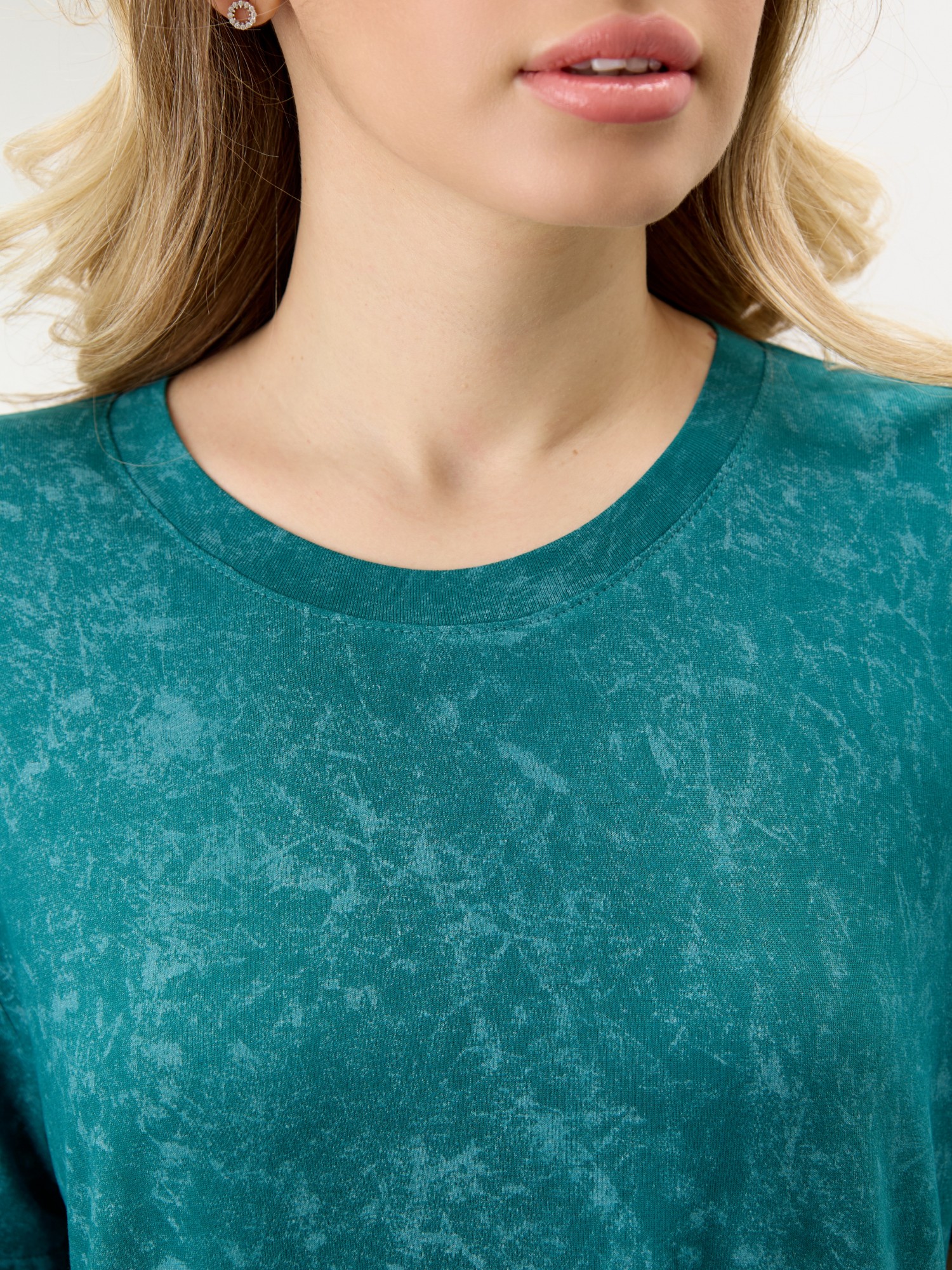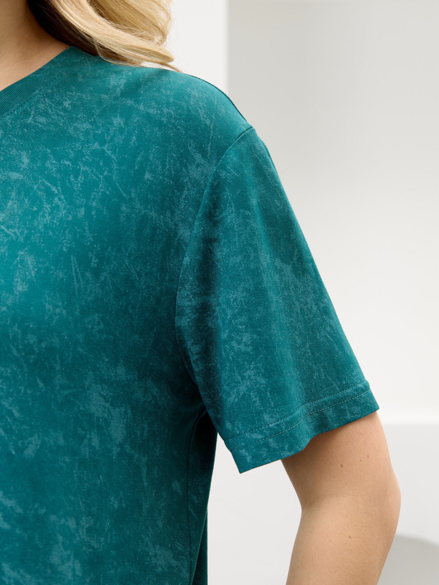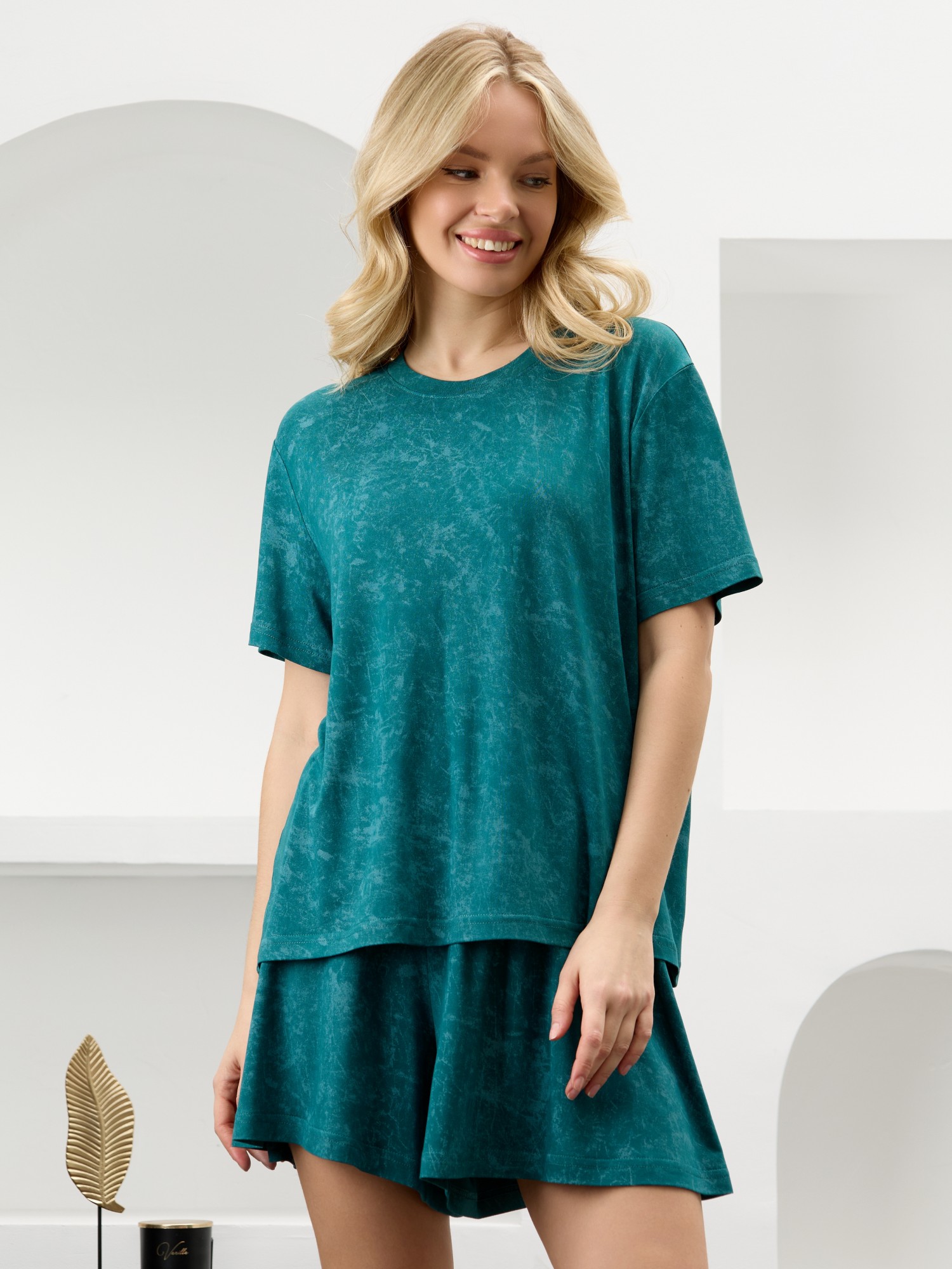 Костюм женский в комбинации двух видов полотен: из гладкокрашенного трикотажного вискозного полотна с эффектом «варенка», состоящий из футболки и шорт. Футболка - классического покроя, с короткими втачными рукавами, горловиной овальной формы, обработанной втачной планкой.Шорты – свободные, средней длины, с эластичной тесьмой по талии.