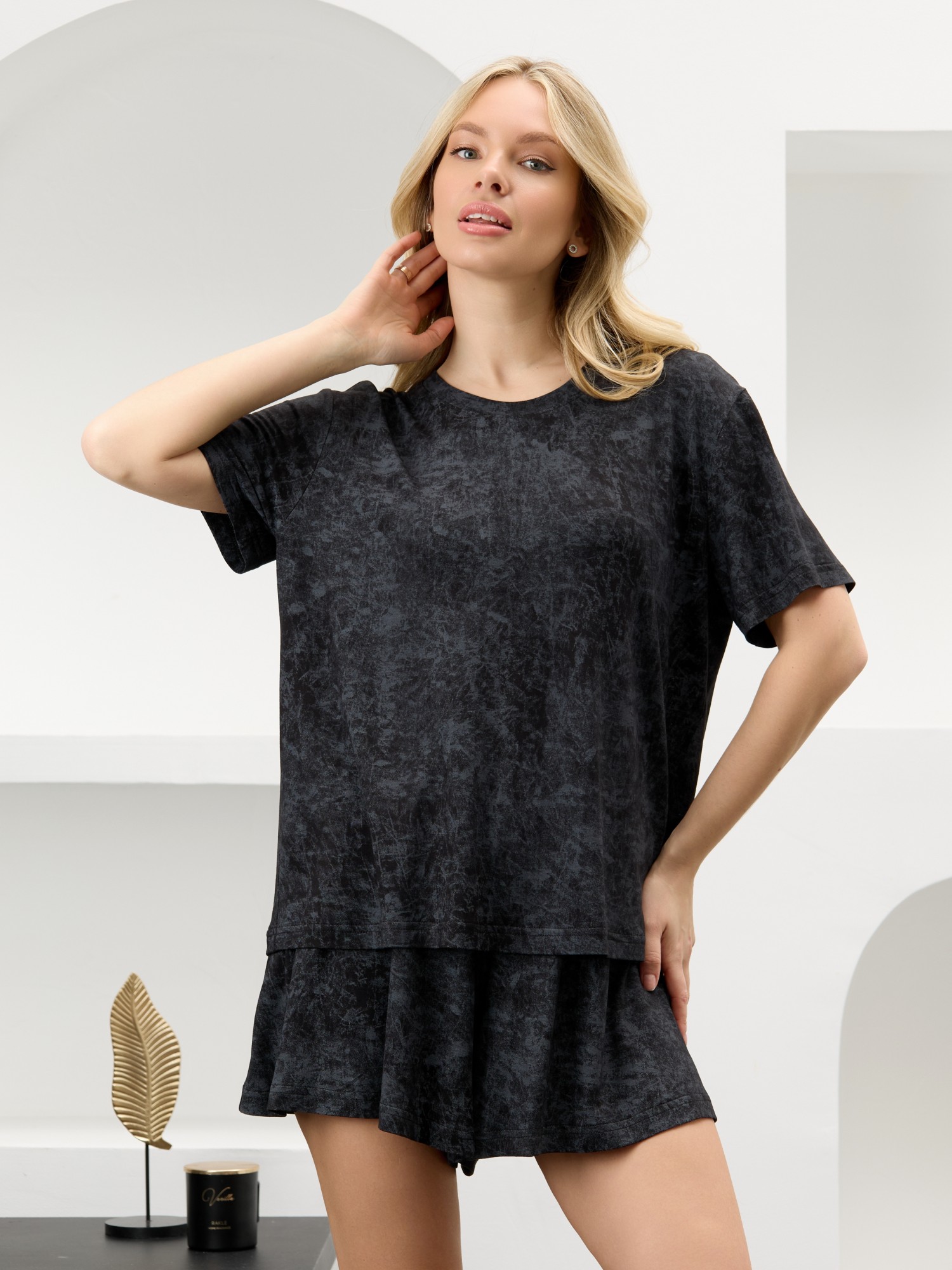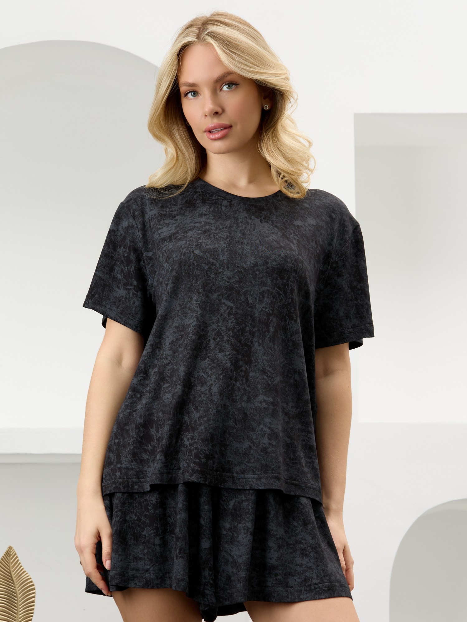 Костюм женский в комбинации двух видов полотен: из гладкокрашенного трикотажного вискозного полотна с эффектом «варенка», состоящий из футболки и шорт. Футболка - классического покроя, с короткими втачными рукавами, горловиной овальной формы, обработанной втачной планкой.Шорты – свободные, средней длины, с эластичной тесьмой по талии.