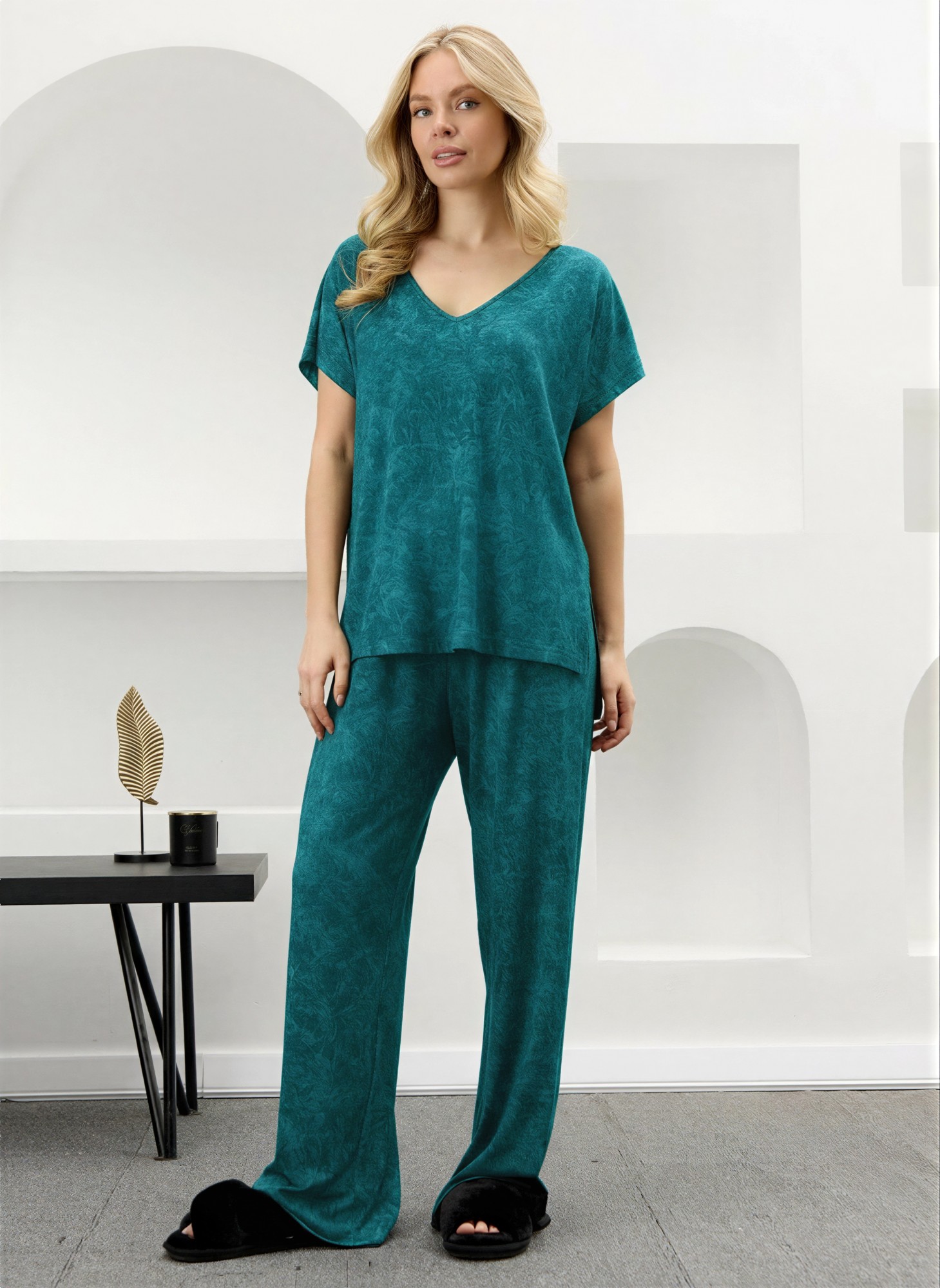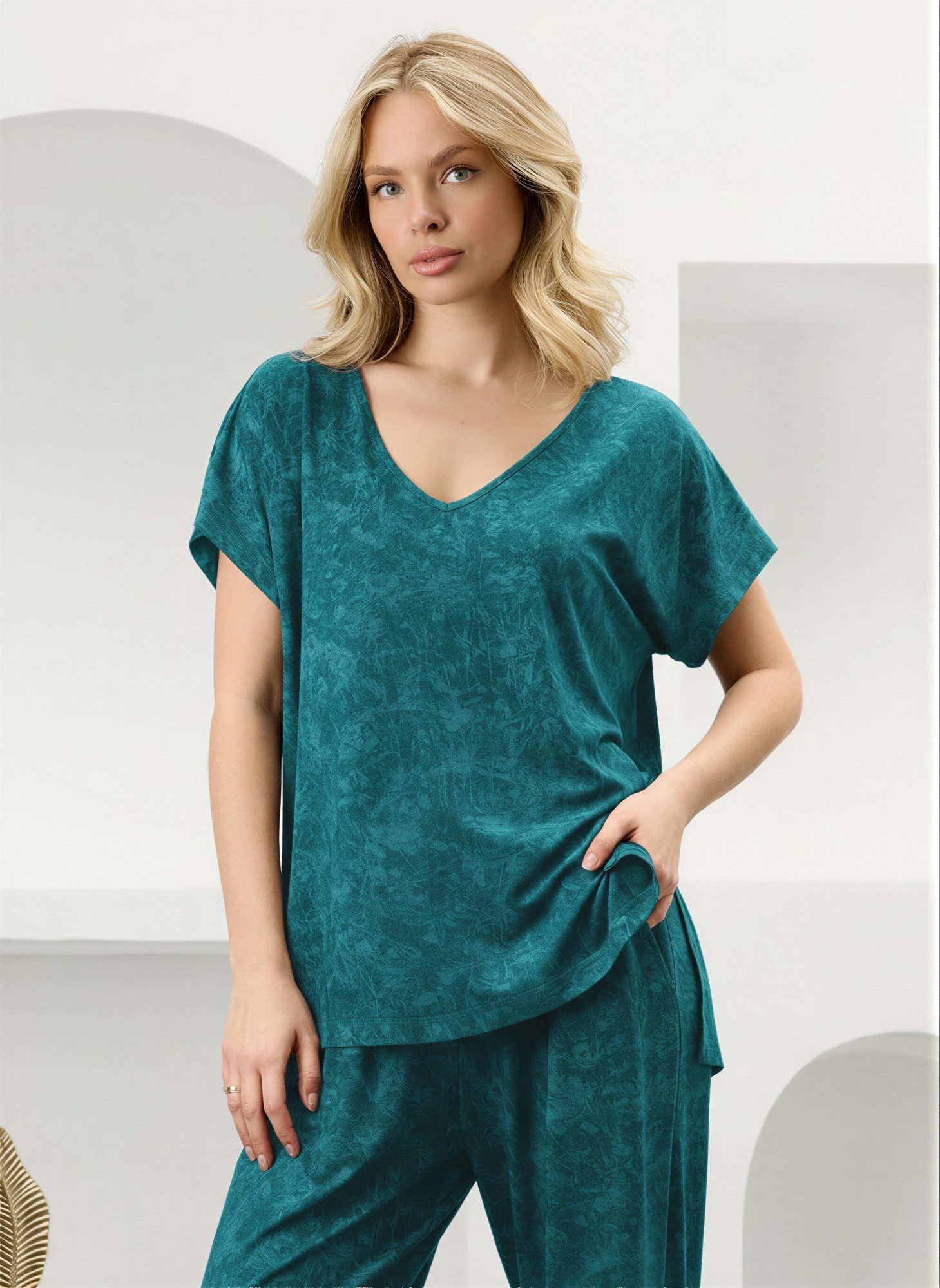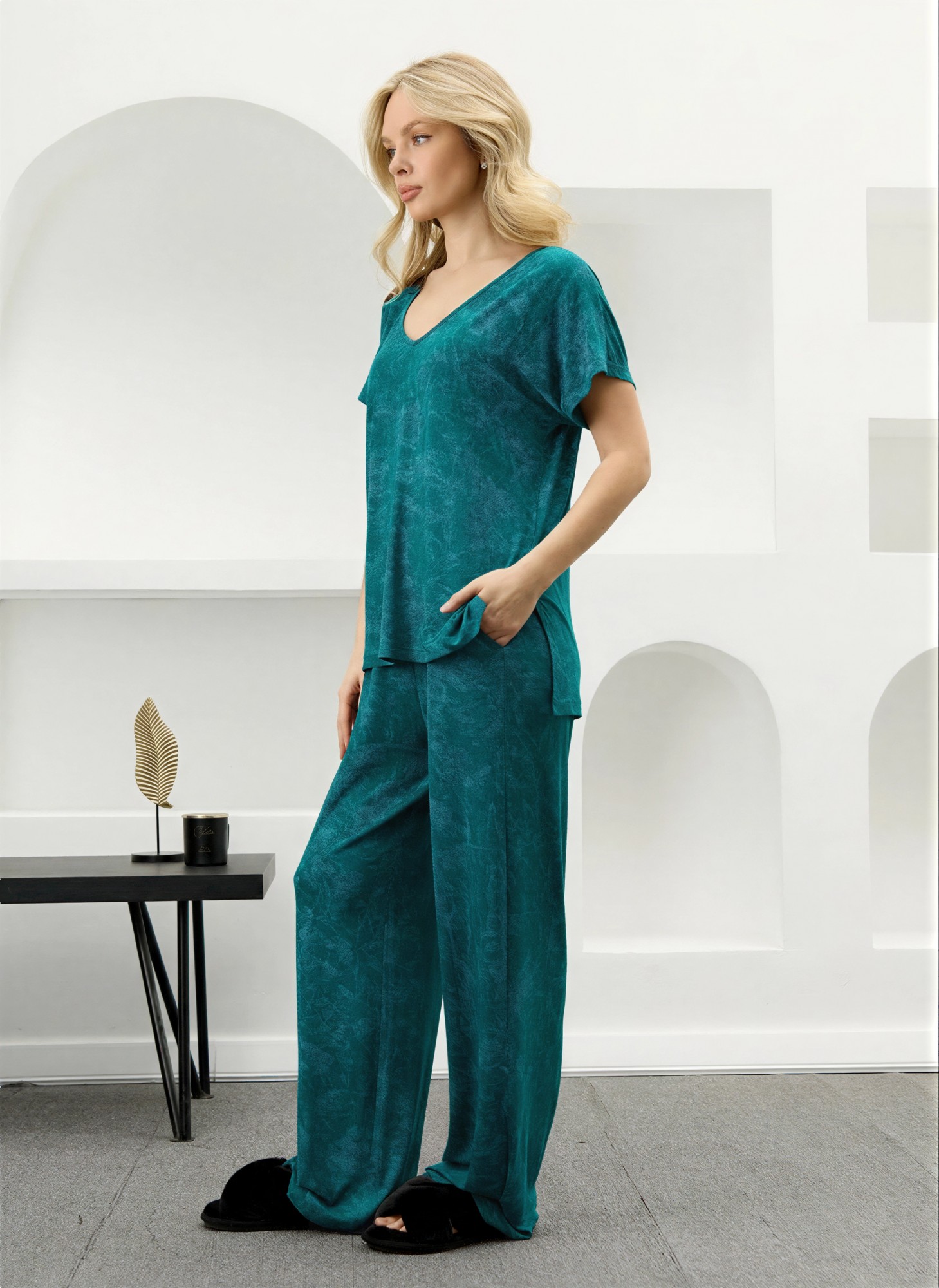 Костюм женский в комбинации двух видов полотен: из гладкокрашенного трикотажного вискозного полотна с эффектом «варенка», состоящий из футболки и брюк. Футболка - свободного покроя, с короткими цельнокроеными рукавами, горловиной V-образной формы, окантованной основным материалом и разрезами в боковых швах. Модной деталью является разница длин между полочкой и спинкой.Брюки – длинные, свободные, на притачном поясе с эластичной тесьмой внутри.