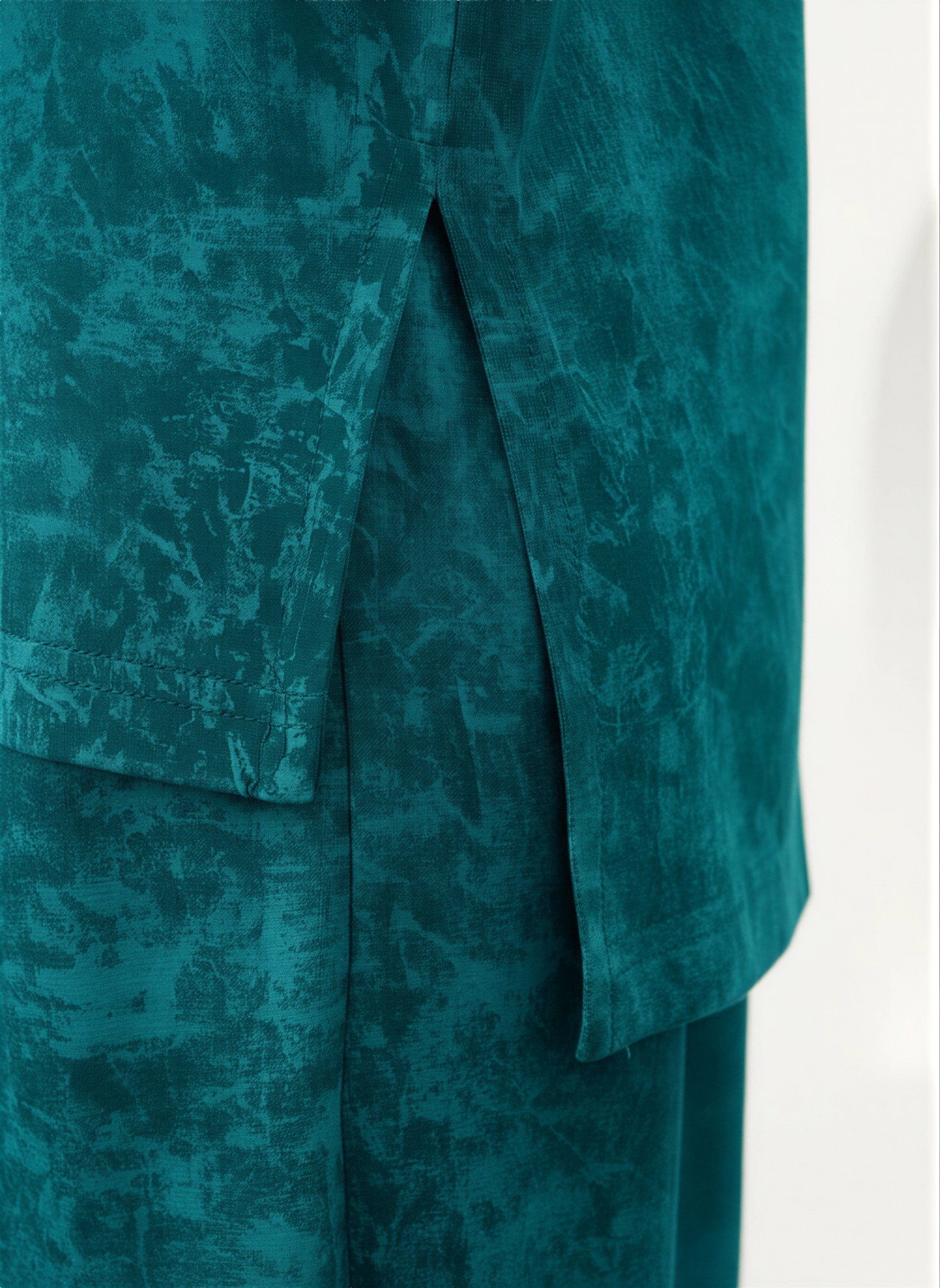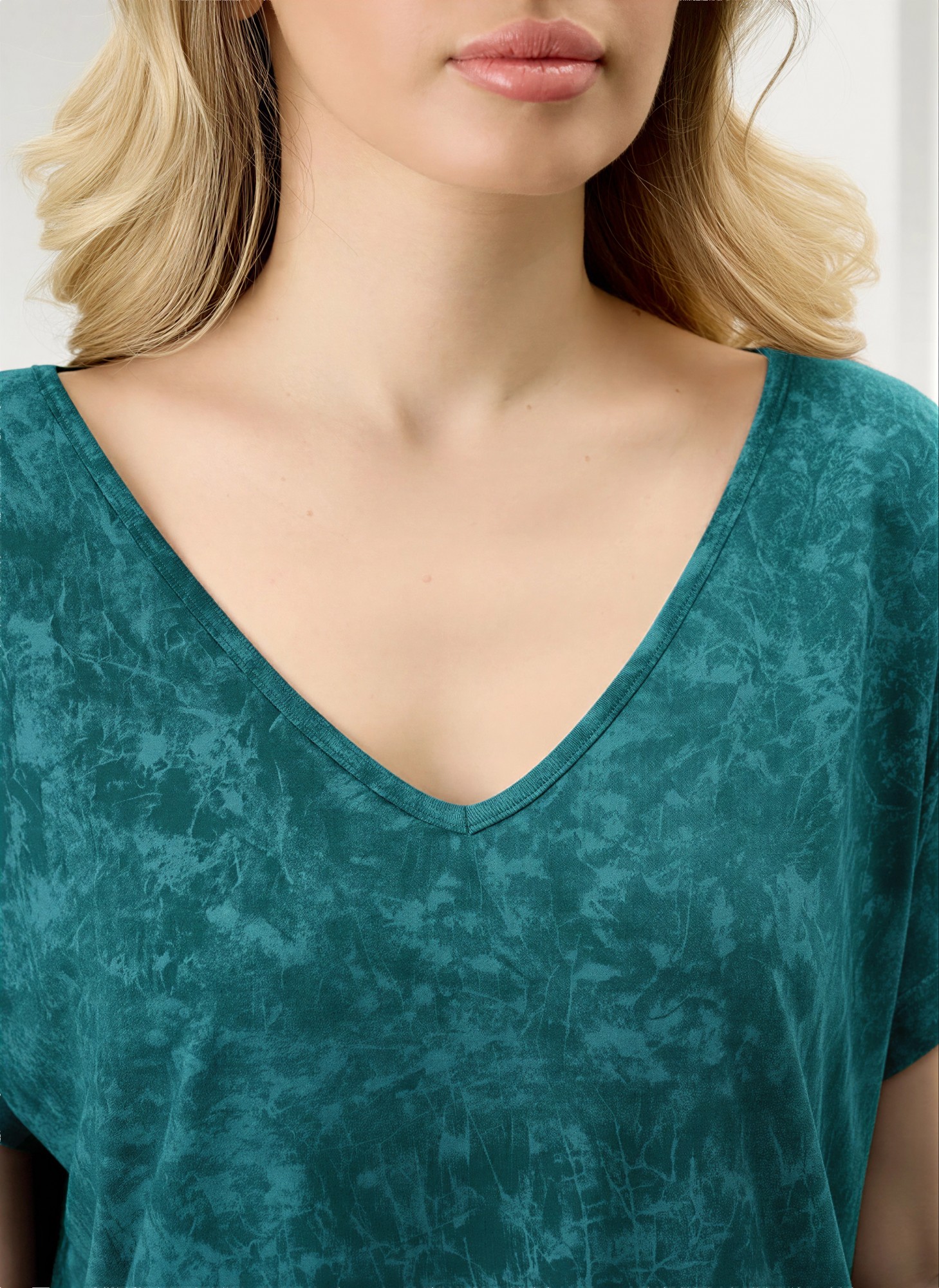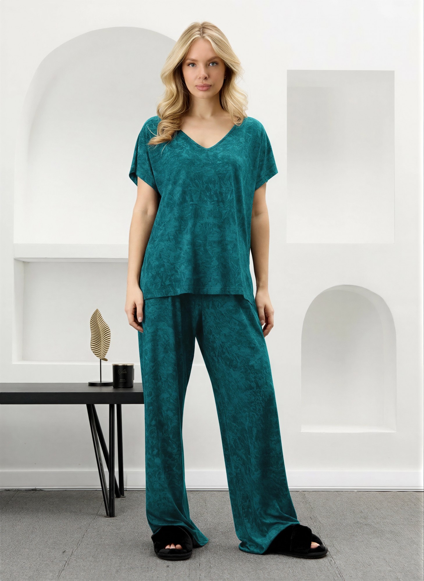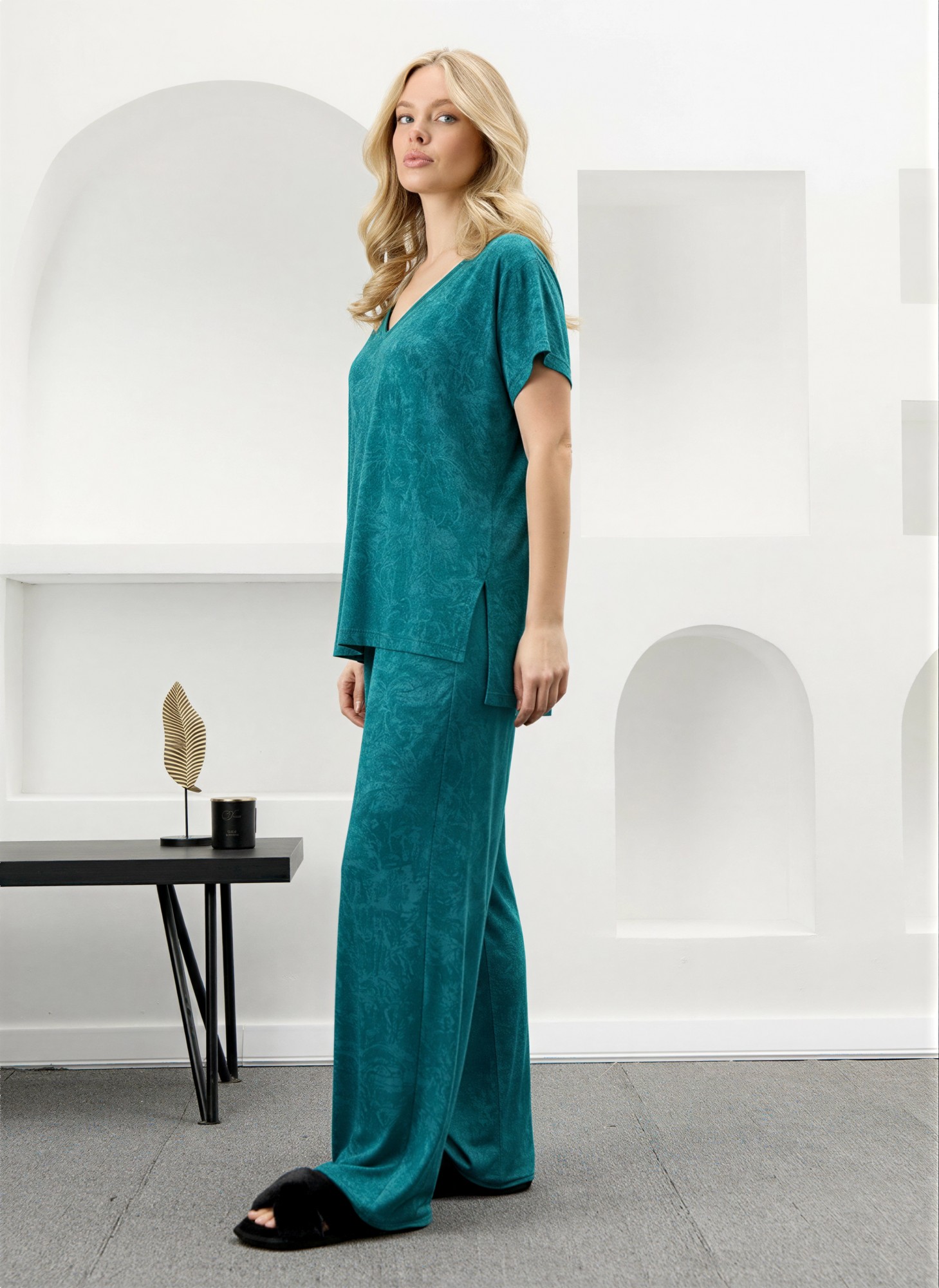 Костюм женский в комбинации двух видов полотен: из гладкокрашенного трикотажного вискозного полотна с эффектом «варенка», состоящий из футболки и брюк. Футболка - свободного покроя, с короткими цельнокроеными рукавами, горловиной V-образной формы, окантованной основным материалом и разрезами в боковых швах. Модной деталью является разница длин между полочкой и спинкой.Брюки – длинные, свободные, на притачном поясе с эластичной тесьмой внутри.