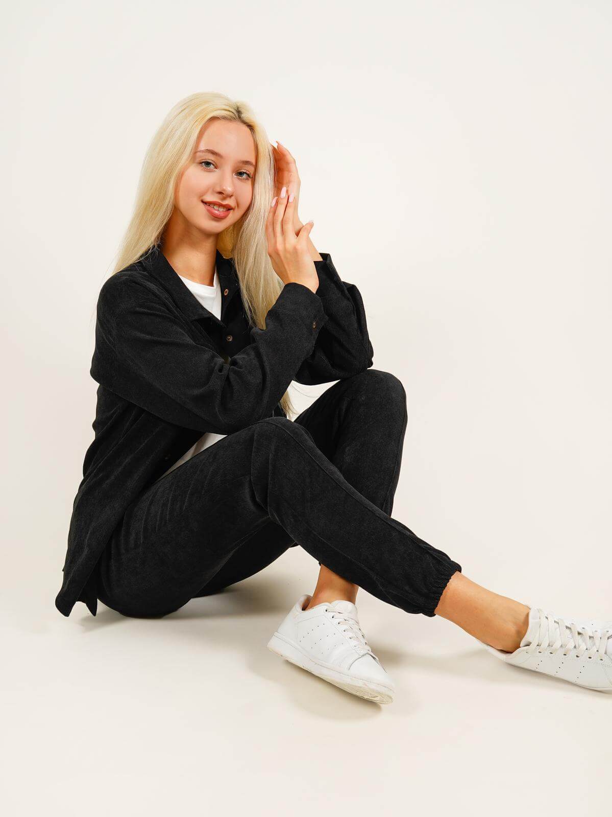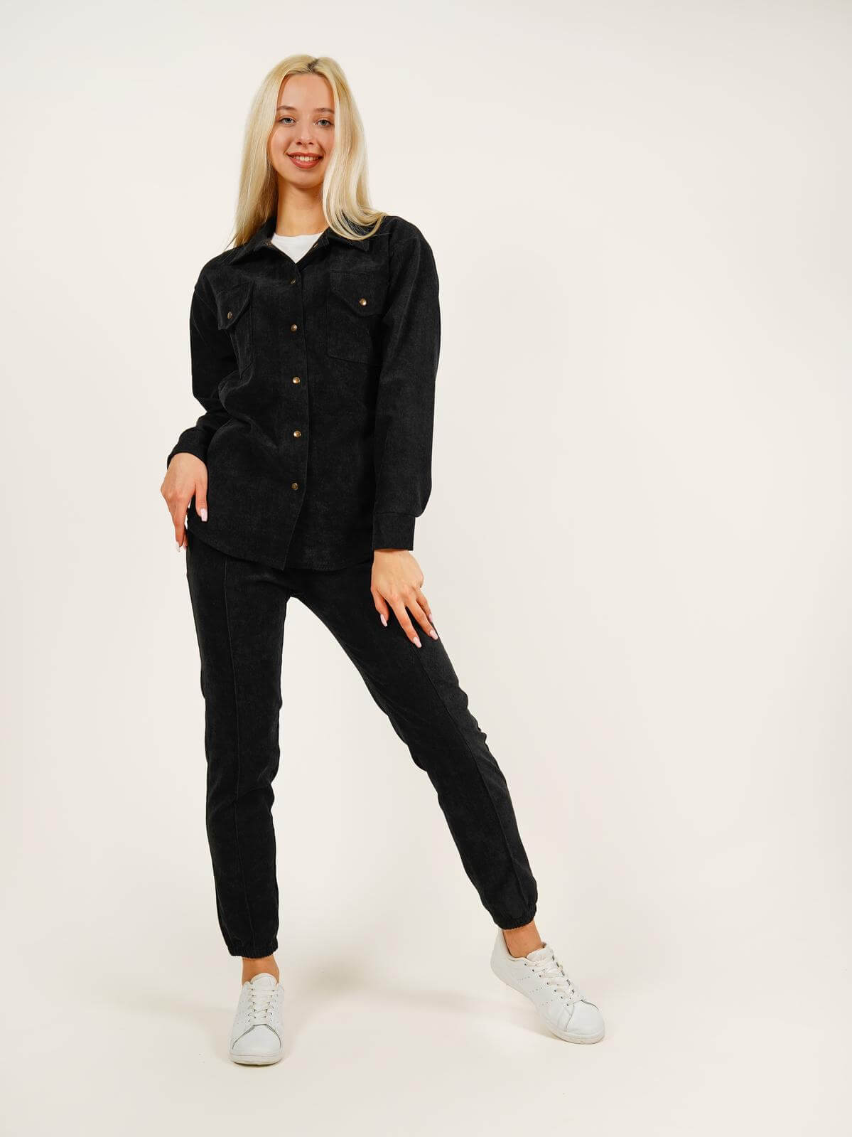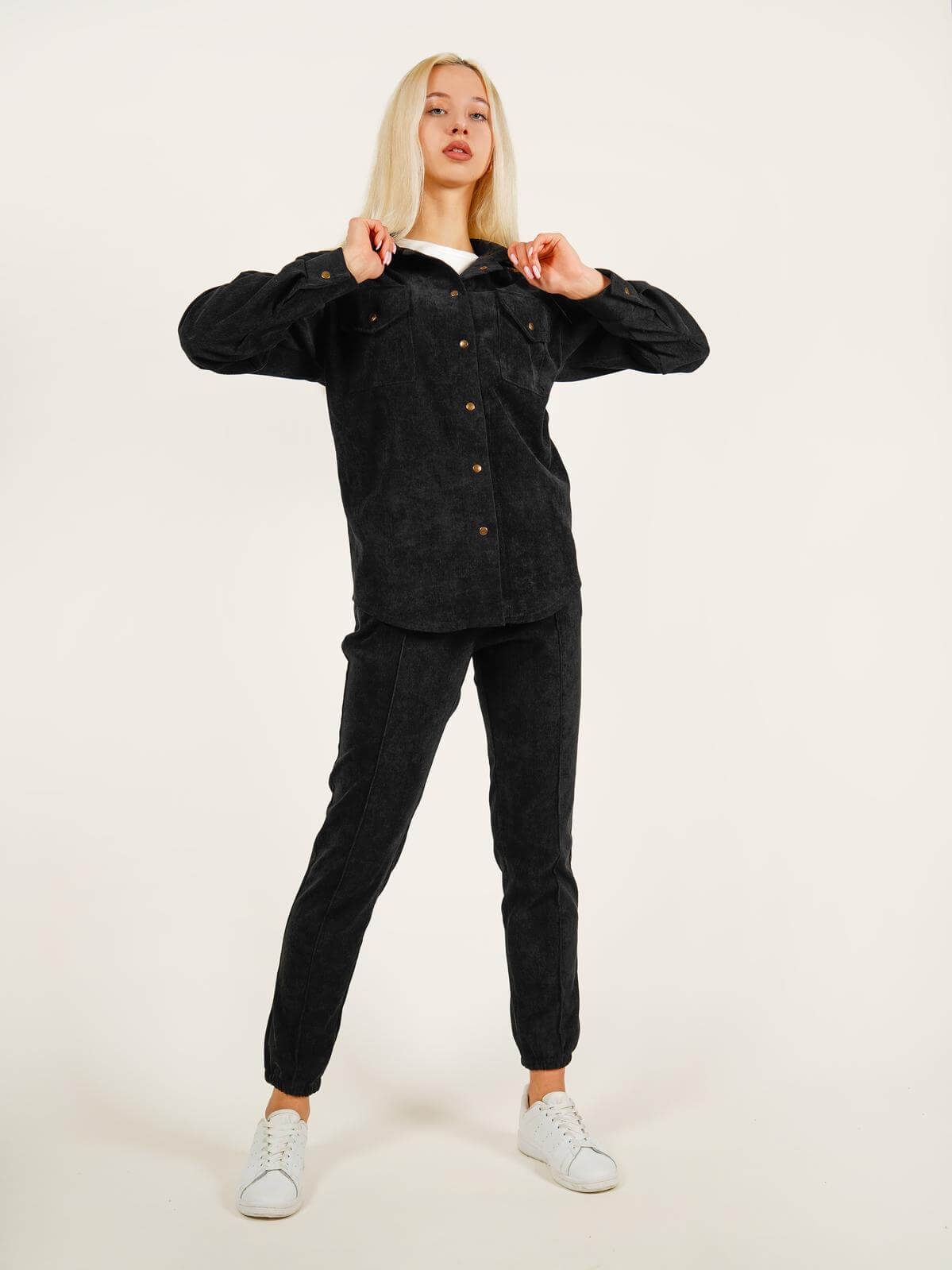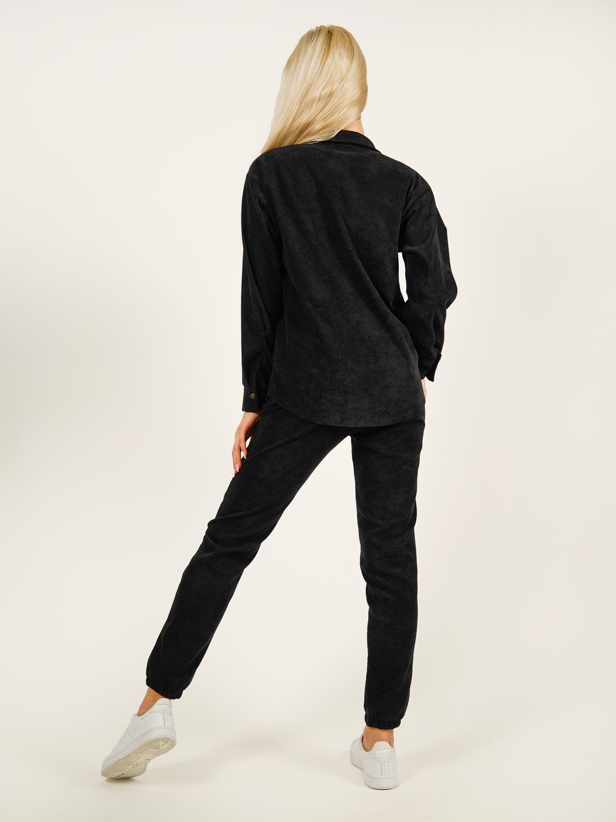 Костюм из вельвета состоит из рубашки на кнопках с длинным рукавом и брюк.