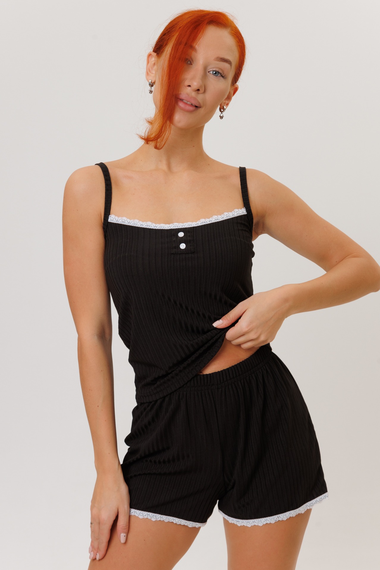 Женский костюм с шортами из трикотажной лапши — это комплект домашней или повседневной одежды, состоящий из топа и шорт, изготовленных из особого вида трикотажа с рельефной поверхностью, напоминающей лапшу. Такой материал отличается эластичностью, мягкостью и хорошей воздухопроницаемостью.