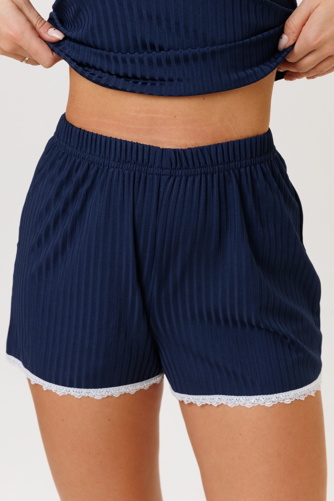 Женский костюм с шортами из трикотажной лапши — это комплект домашней или повседневной одежды, состоящий из топа и шорт, изготовленных из особого вида трикотажа с рельефной поверхностью, напоминающей лапшу. Такой материал отличается эластичностью, мягкостью и хорошей воздухопроницаемостью.