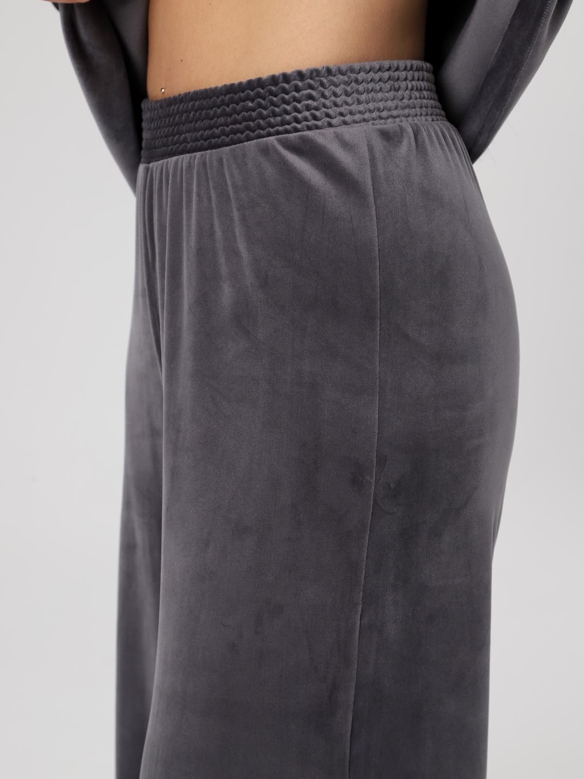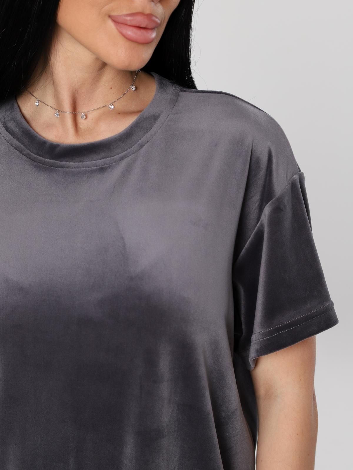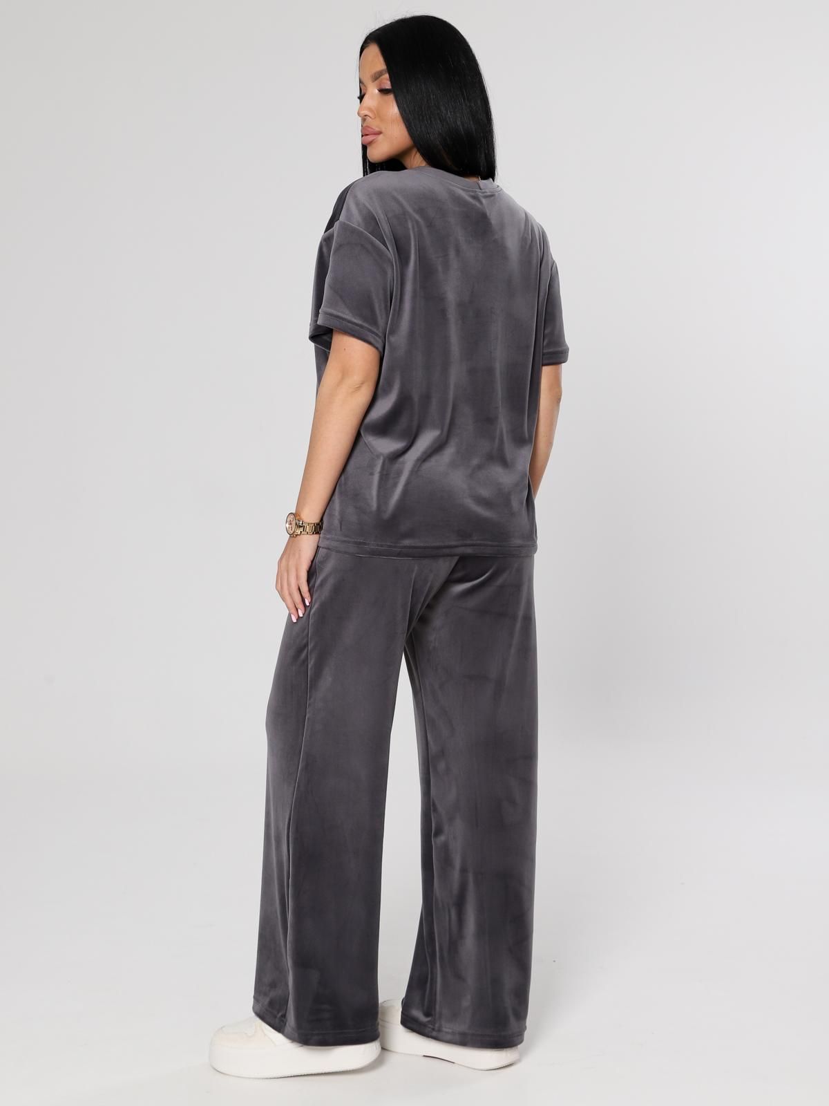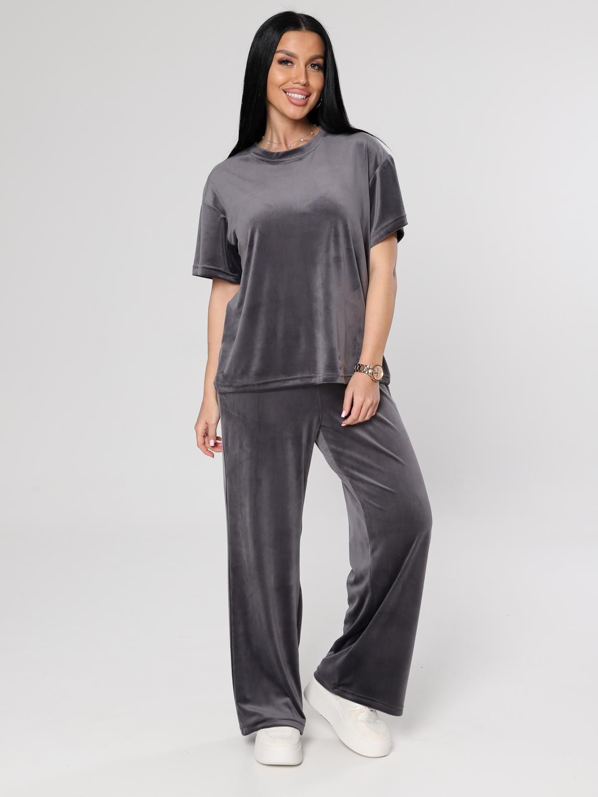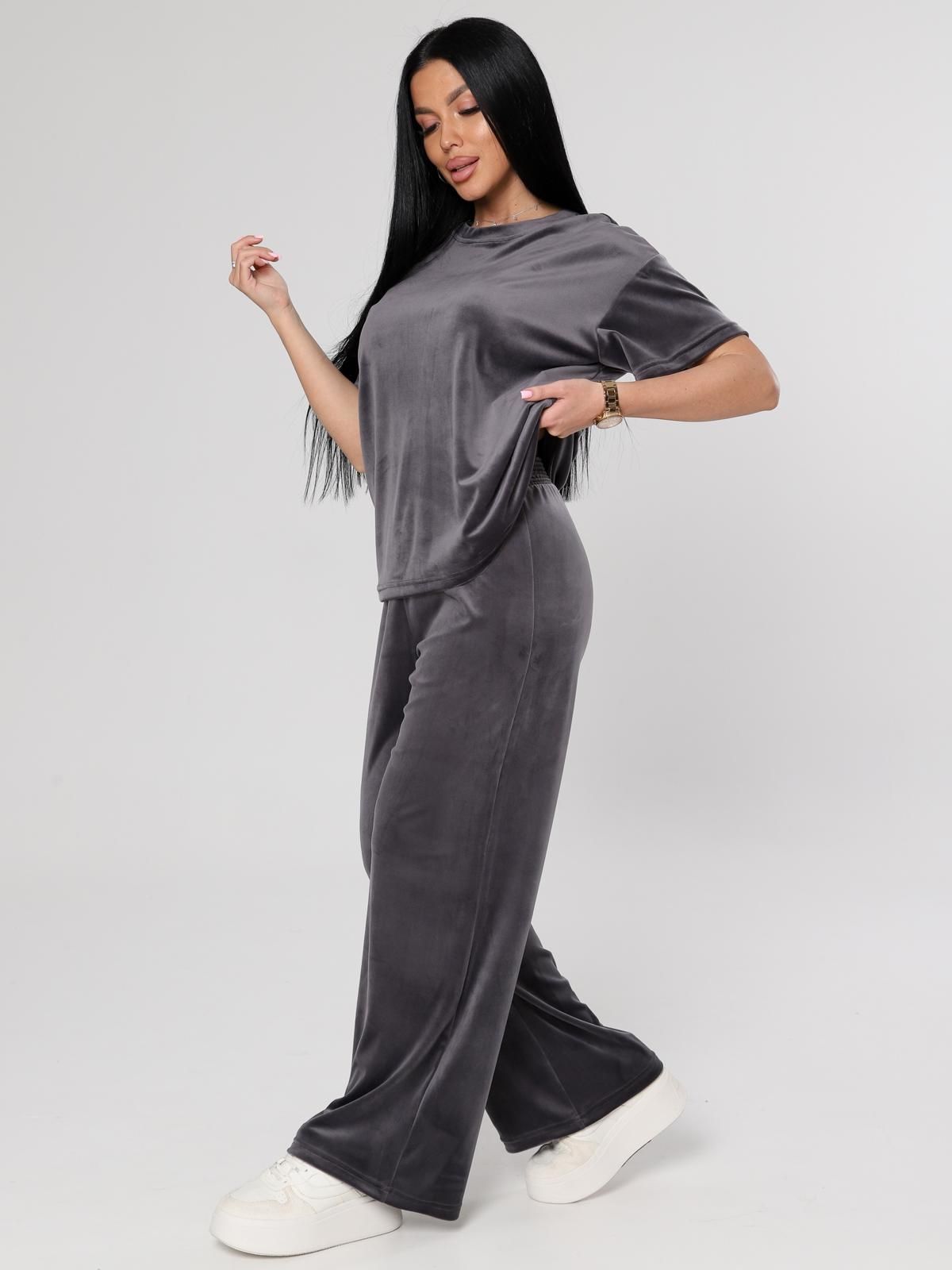 Женский велюровый костюм, состоящий из свободного свитшота и брюк прямого кроя. Костюм выполнен из мягкого велюра, что делает его комфортным для повседневной носки, прогулок или домашнего отдыха.
