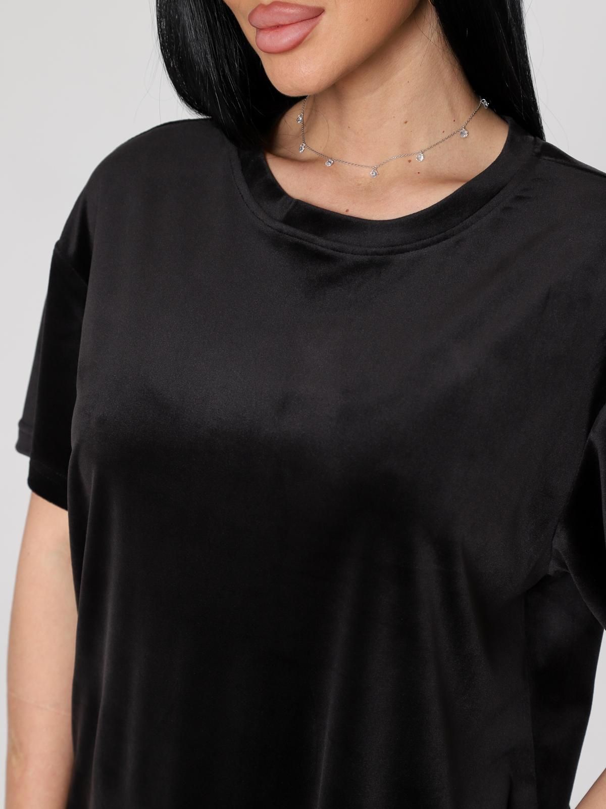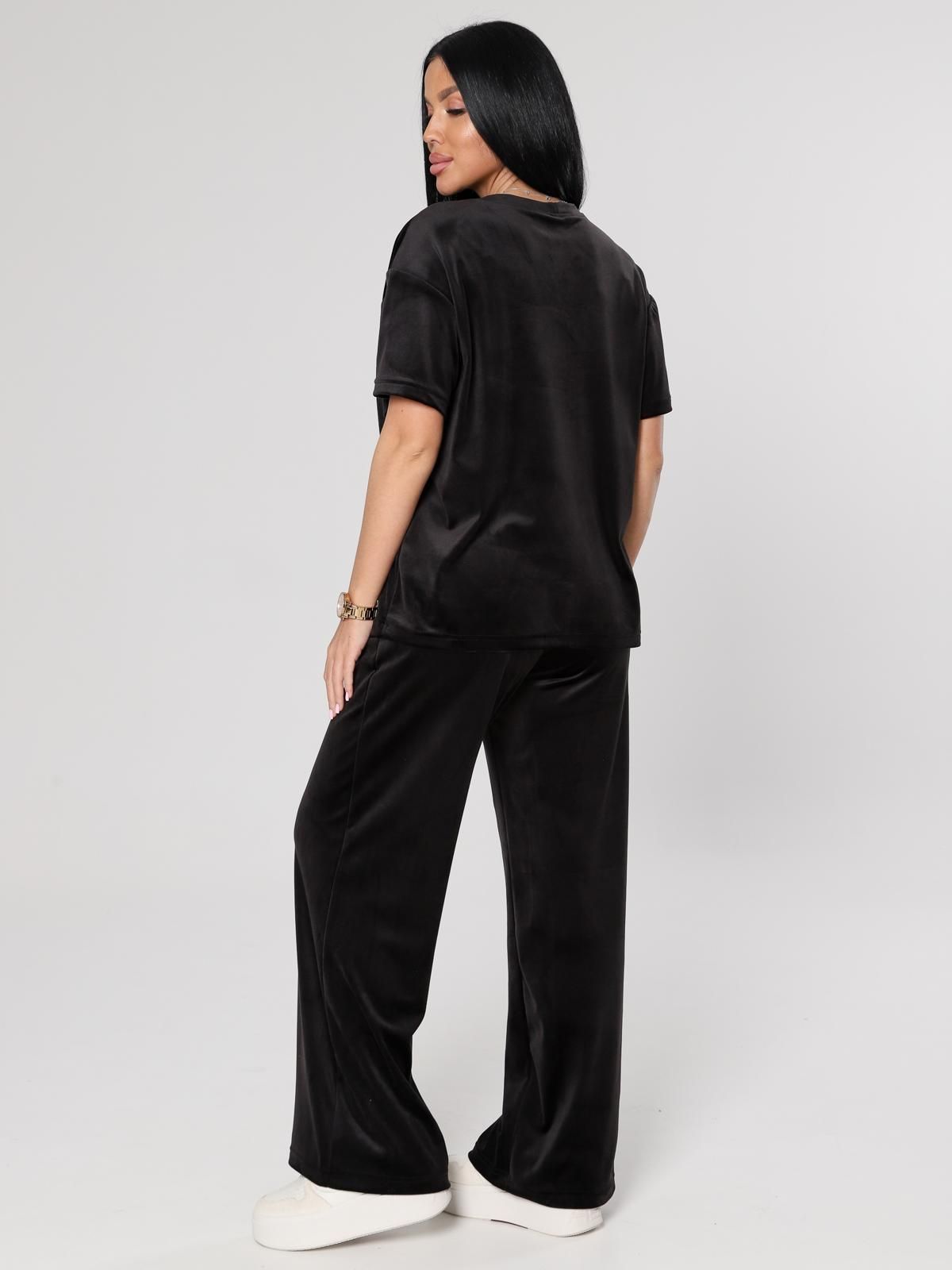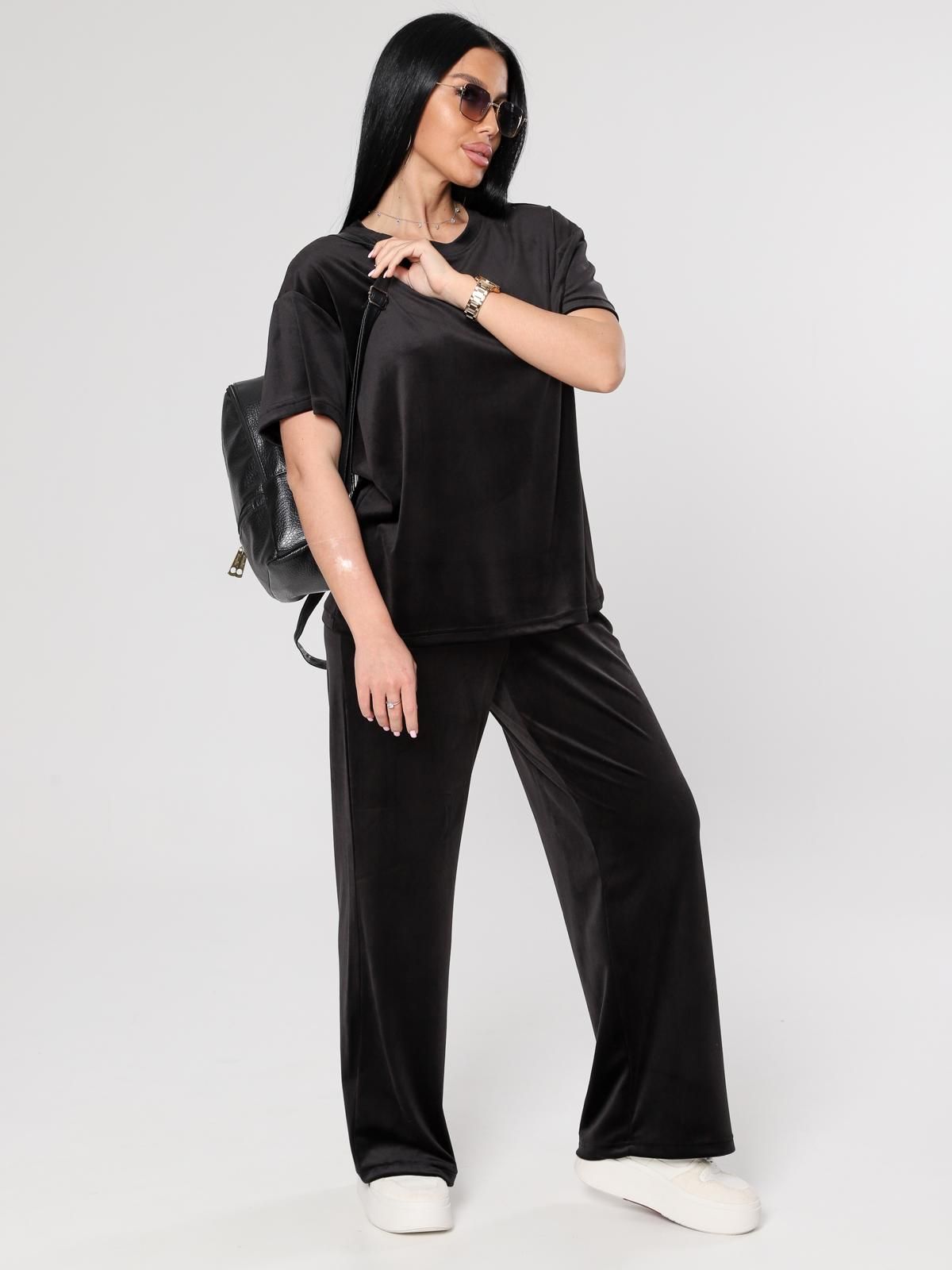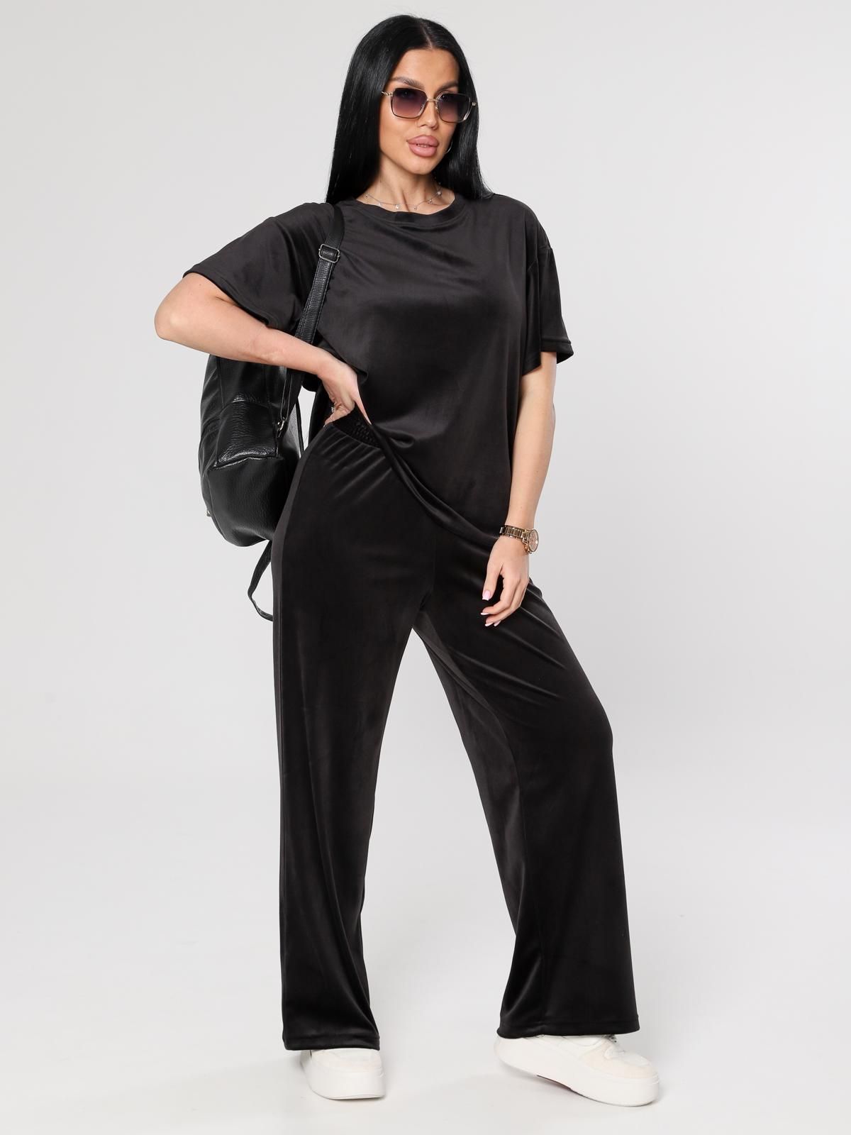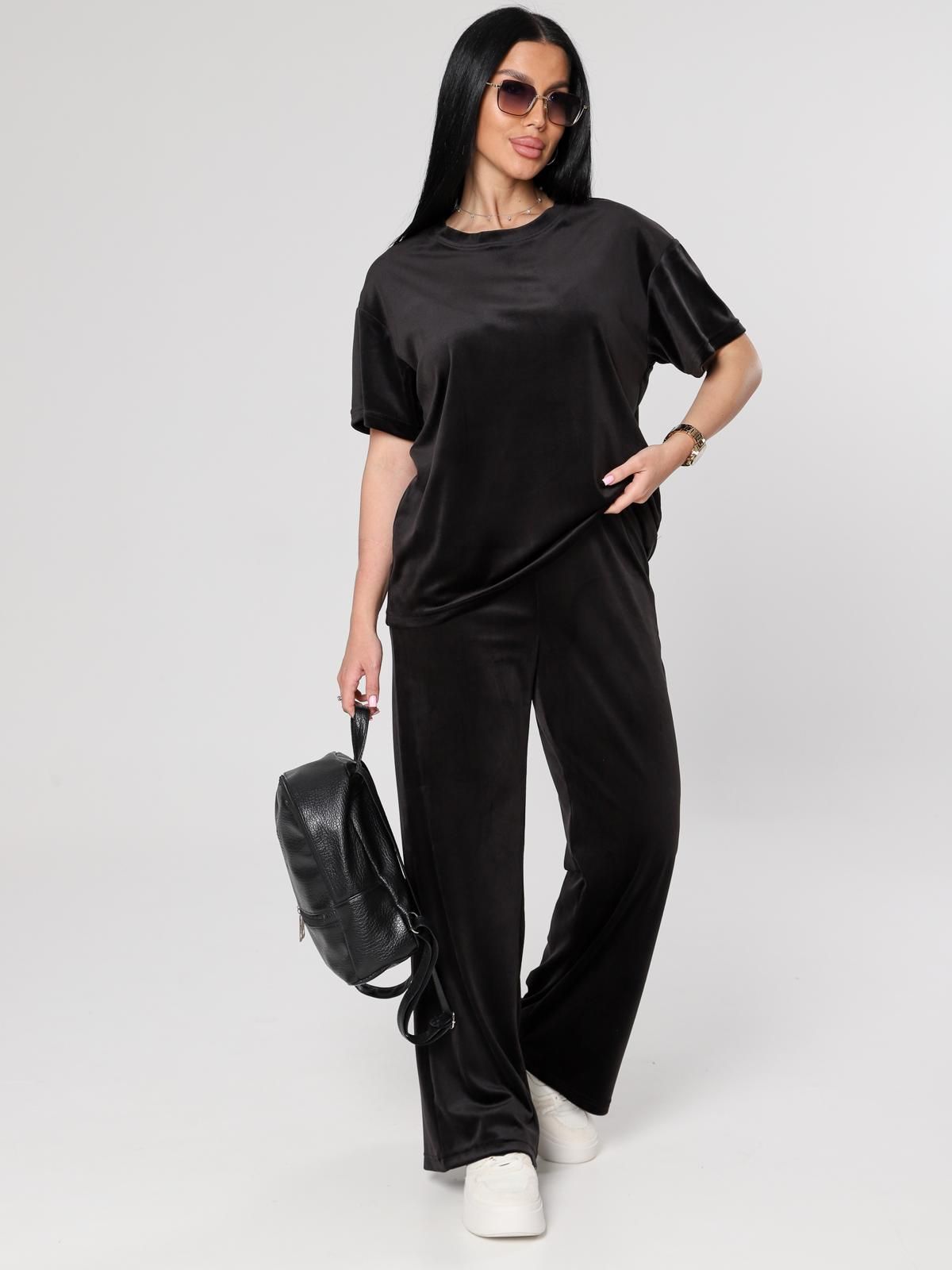 Женский велюровый костюм, состоящий из свободного свитшота и брюк прямого кроя. Костюм выполнен из мягкого велюра, что делает его комфортным для повседневной носки, прогулок или домашнего отдыха.
