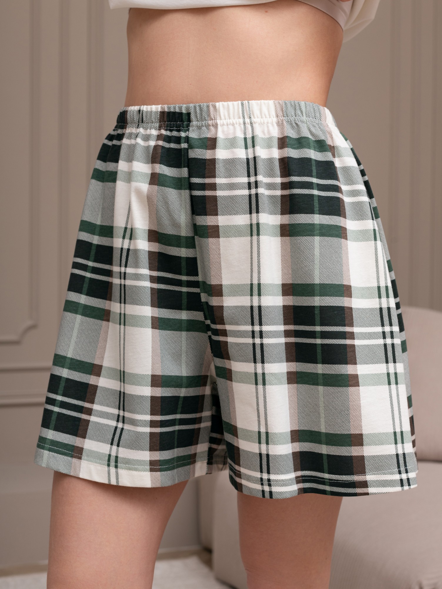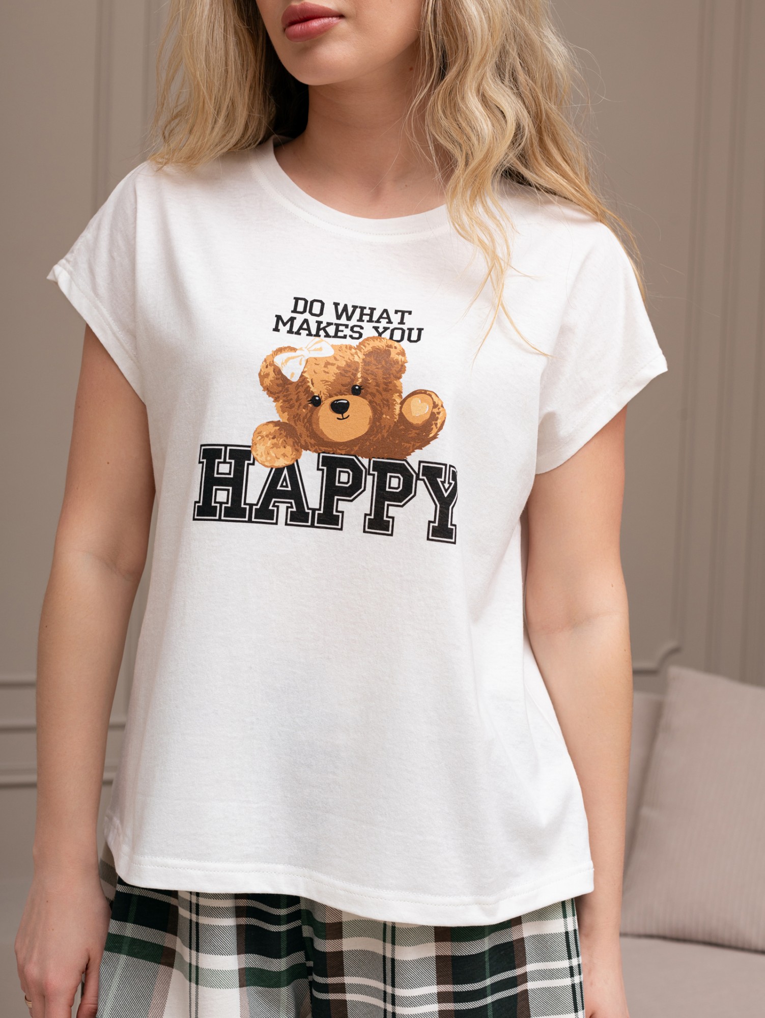 Костюм женский из трикотажного полотна "кулирка" в комбинации двух видов: гладкокрашеного и набивного с тематическим рисунком, состоящий из футболки и шорт. Футболка из гладкокрашеного полотна, с цельнокроеными короткими рукавами, горловиной овальной формы, обработанной втачной планкой и отделочной строчкой. В центре переда - принт, выполненный в технике шелкографии. Шорты из полотна с набивным рисунком, свободного силуэта, на цельнокроеном поясе с эластичной тесьмой внутри.
