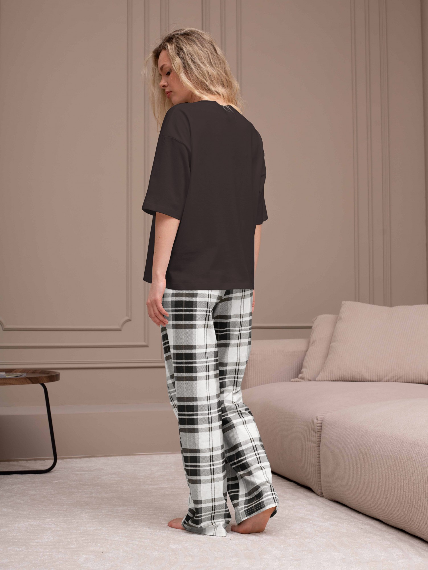 Костюм женский из трикотажного полотна "кулирка" в комбинации двух видов: гладкокрашеного и набивного с тематическим рисунком, состоящий из футболки и брюк. Футболка из гладкокрашеного полотна, свободного силуэта, со спущенной линией плеч и втачными короткими рукавами, горловиной овальной формы, обработанной втачной планкой и отделочной строчкой. В центре переда - принт, выполненный в технике шелкографии. Брюки из полотна с набивным рисунком длинные, прямые, на притачном поясе с эластичной тесьмой внутри и карманами в боковых швах.