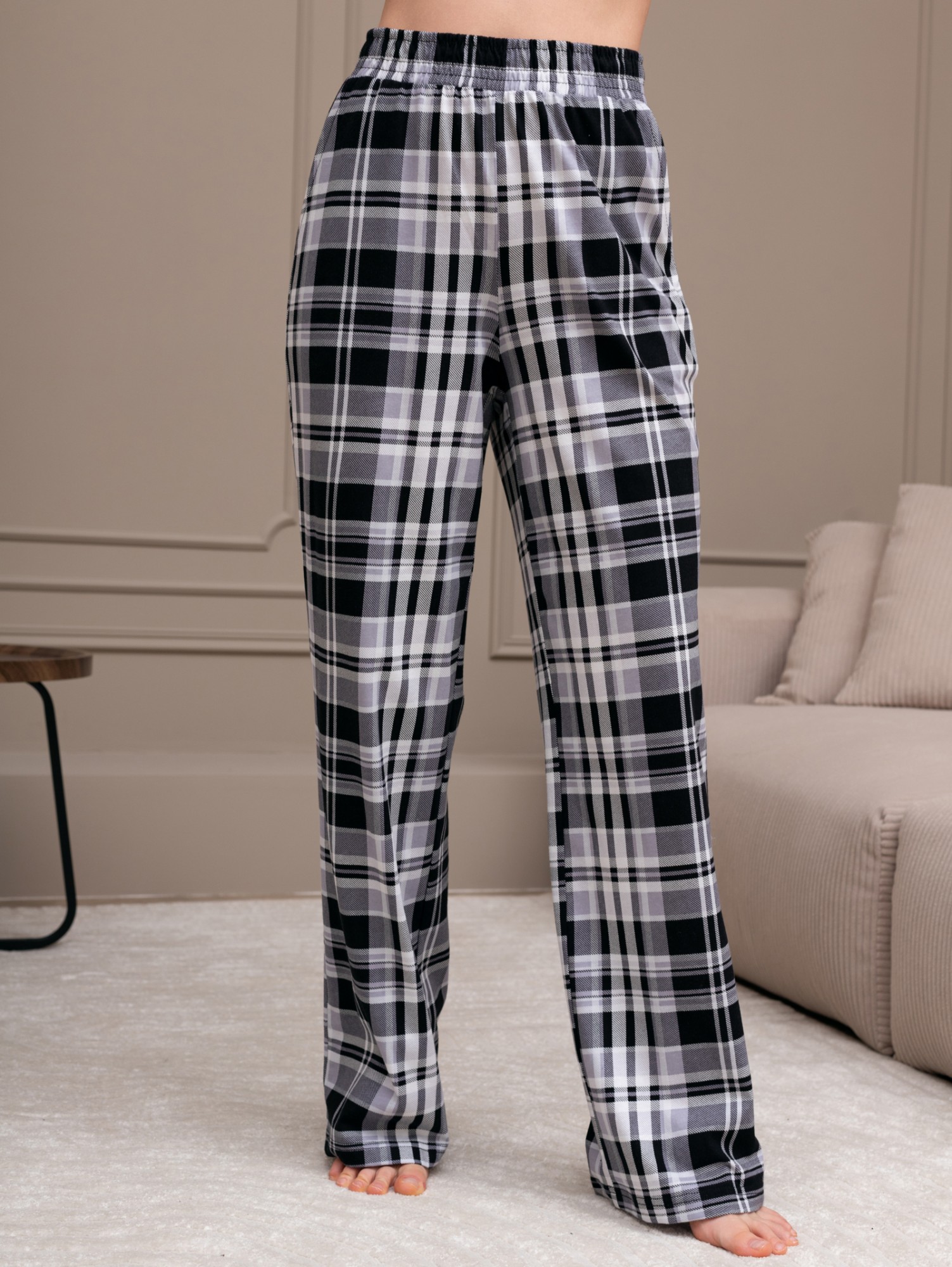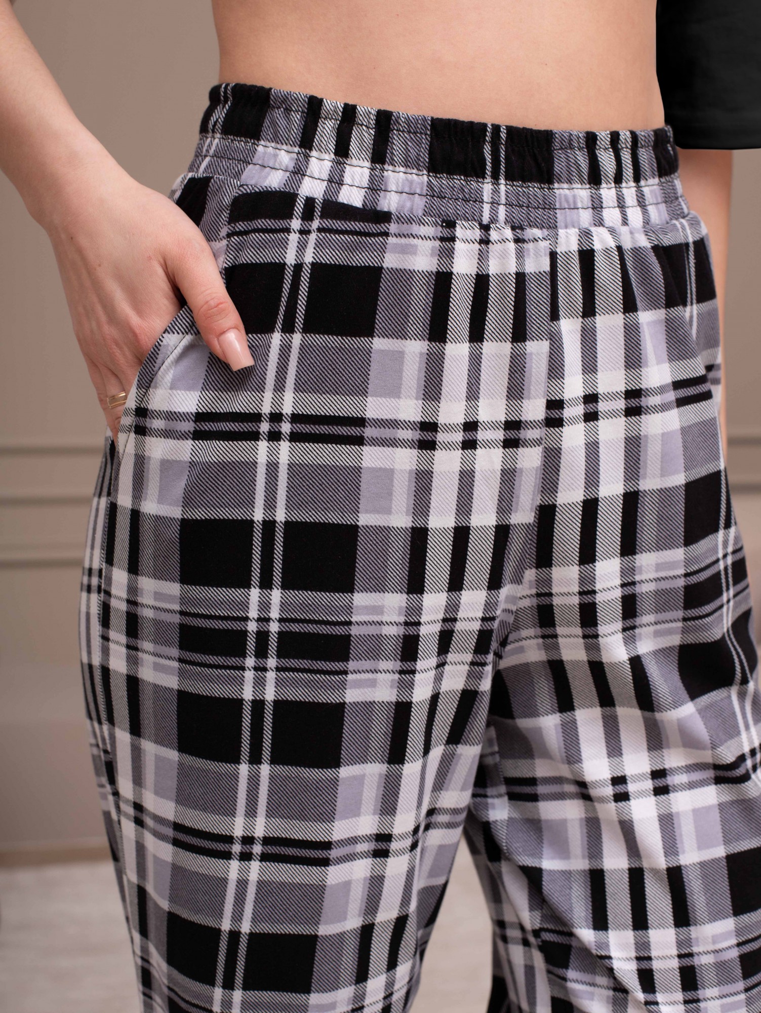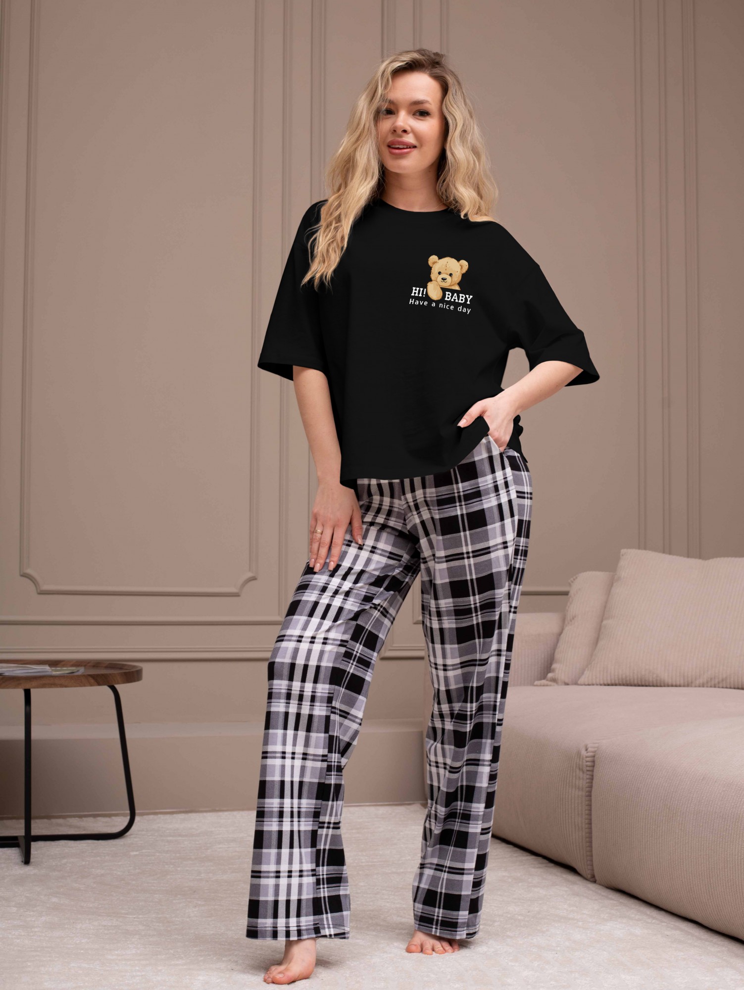 Костюм женский из трикотажного полотна "кулирка" в комбинации двух видов: гладкокрашеного и набивного с тематическим рисунком, состоящий из футболки и брюк. Футболка из гладкокрашеного полотна, свободного силуэта, со спущенной линией плеч и втачными короткими рукавами, горловиной овальной формы, обработанной втачной планкой и отделочной строчкой. В центре переда - принт, выполненный в технике шелкографии. Брюки из полотна с набивным рисунком длинные, прямые, на притачном поясе с эластичной тесьмой внутри и карманами в боковых швах.