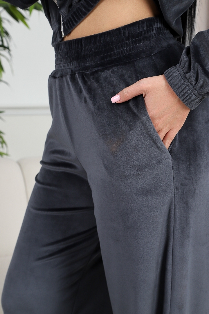 Женский костюм с брюками из велюра — это комплект одежды, состоящий из верха (джемпера, толстовки или свитшота) и брюк, изготовленный из мягкой ворсистой ткани. Велюр — это группа тканей с ворсистой лицевой поверхностью и гладкой изнанкой.