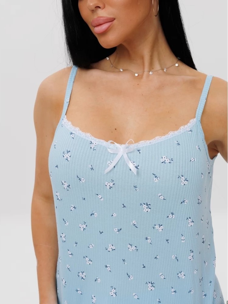 Женская пижама П-96(Каш) / Голубой (мелкие цветы) состоит из майки на тонких бретелях и пижамных шорт. Женский домашний костюм отшивается из трикотажного хлопкового полотна, приятен к телу.