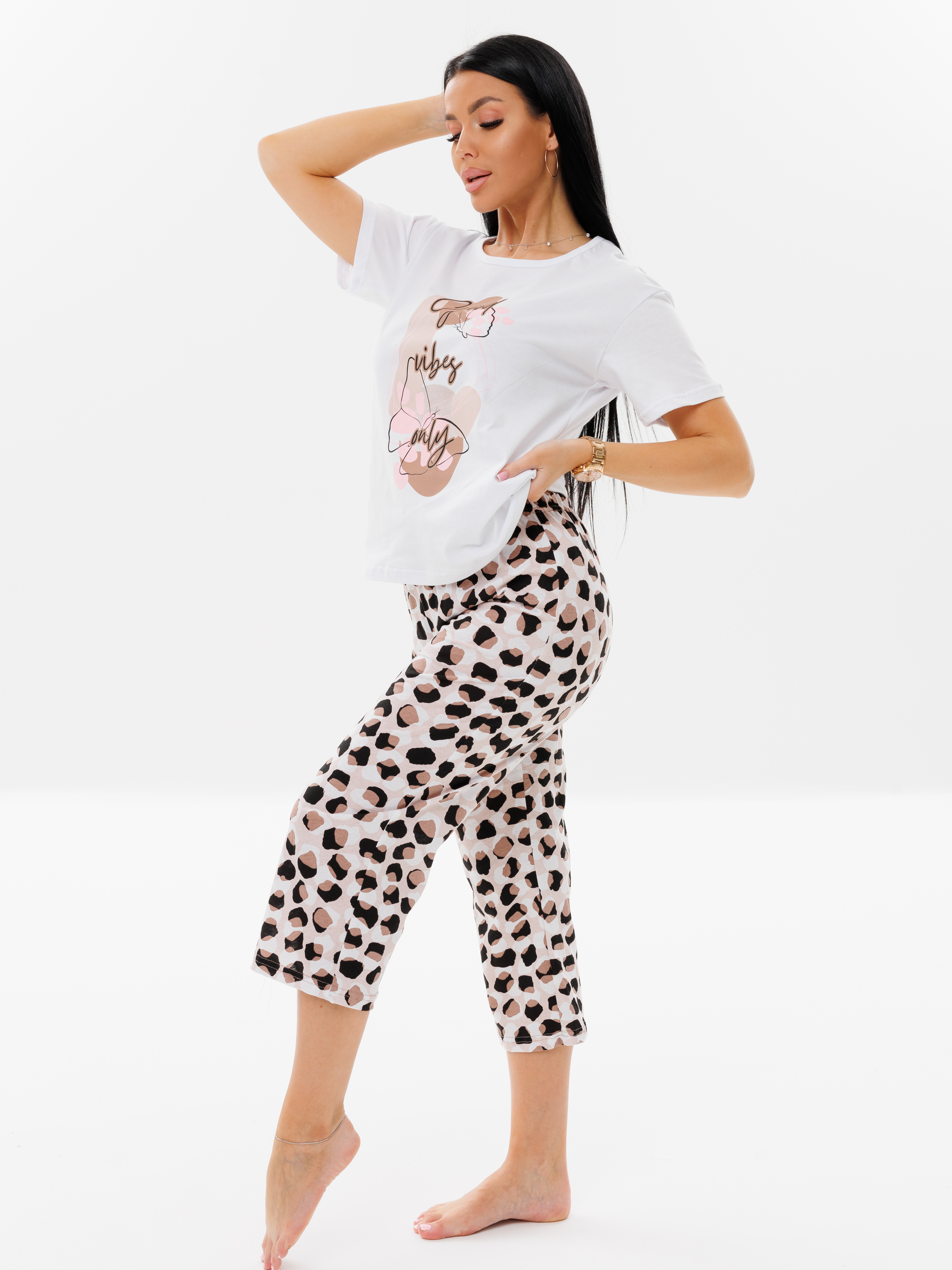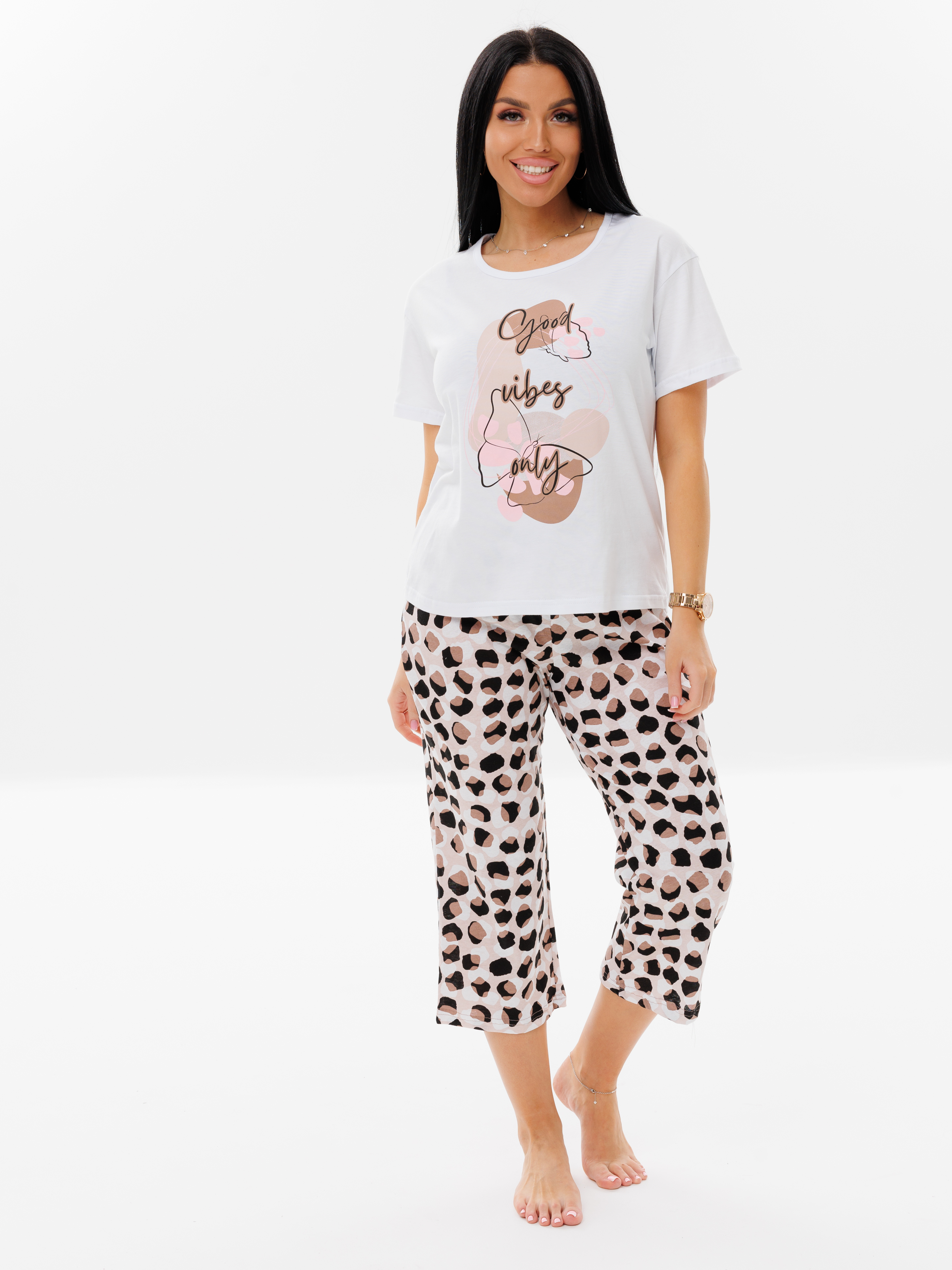 Женская пижама П-67(К) / Коричневый (надписи) отшивается из хлопкового трикотажного полотна, кулирки. Женский костюм состоит из футболки прямого силуэта и бридж.
