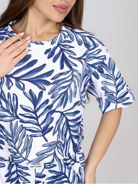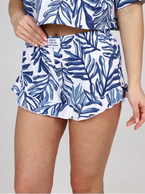 Женская пижама П-124.11 / Папоротник отшивается из 100% хлопка. Укороченная свободная футболка и шорты с оборками на комфортном поясе-резинке.