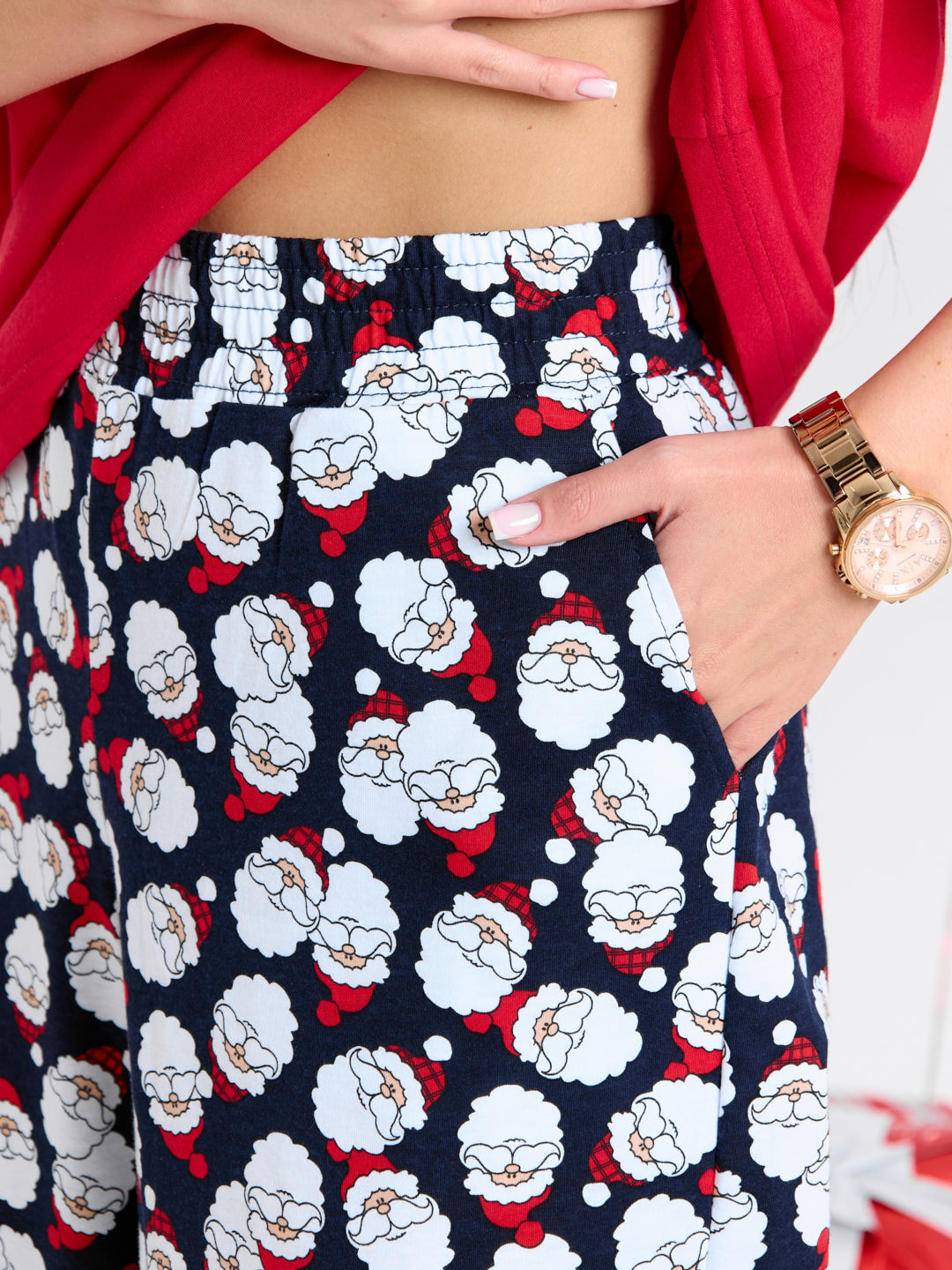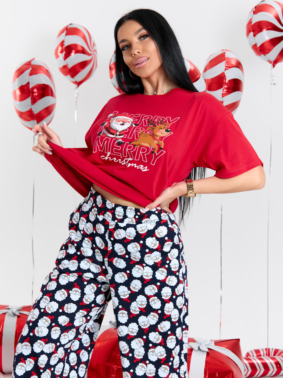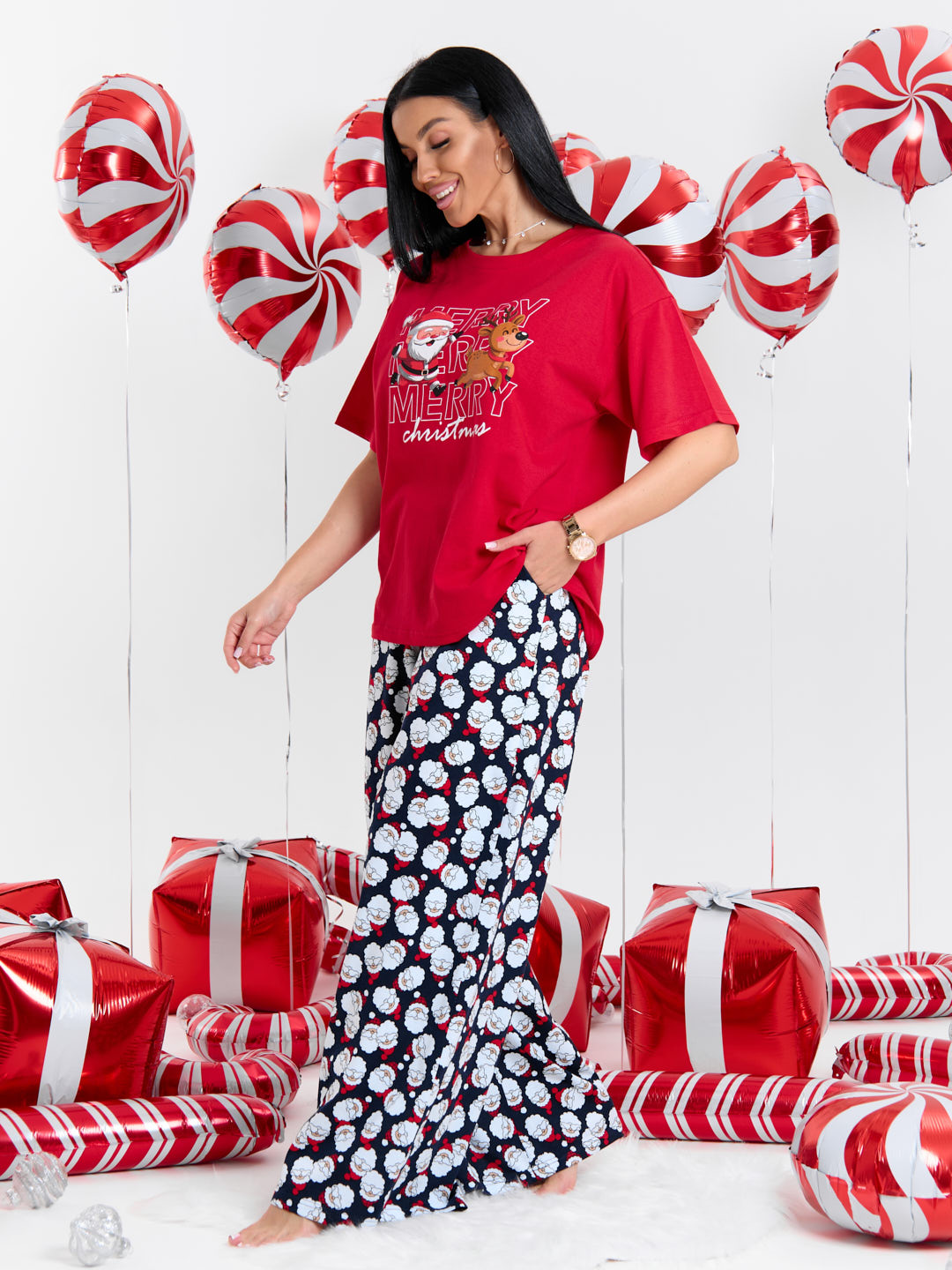 Очаровательная новогодняя пижама-двойка - идеальный выбор для создания праздничного настроения в домашней обстановке! В комплект входят: • Футболка с новогодним дизайном • Брюки палаццо Этот очаровательный комплект станет незабываемым подарком для себя или близких на Новый год. Сочетание праздничного дизайна, комфорта и качества делает эту пижаму настоящим сокровищем для тех, кто ценит уют и стиль в домашней одежде. Создайте волшебную атмосферу праздника с нашей пижамой.