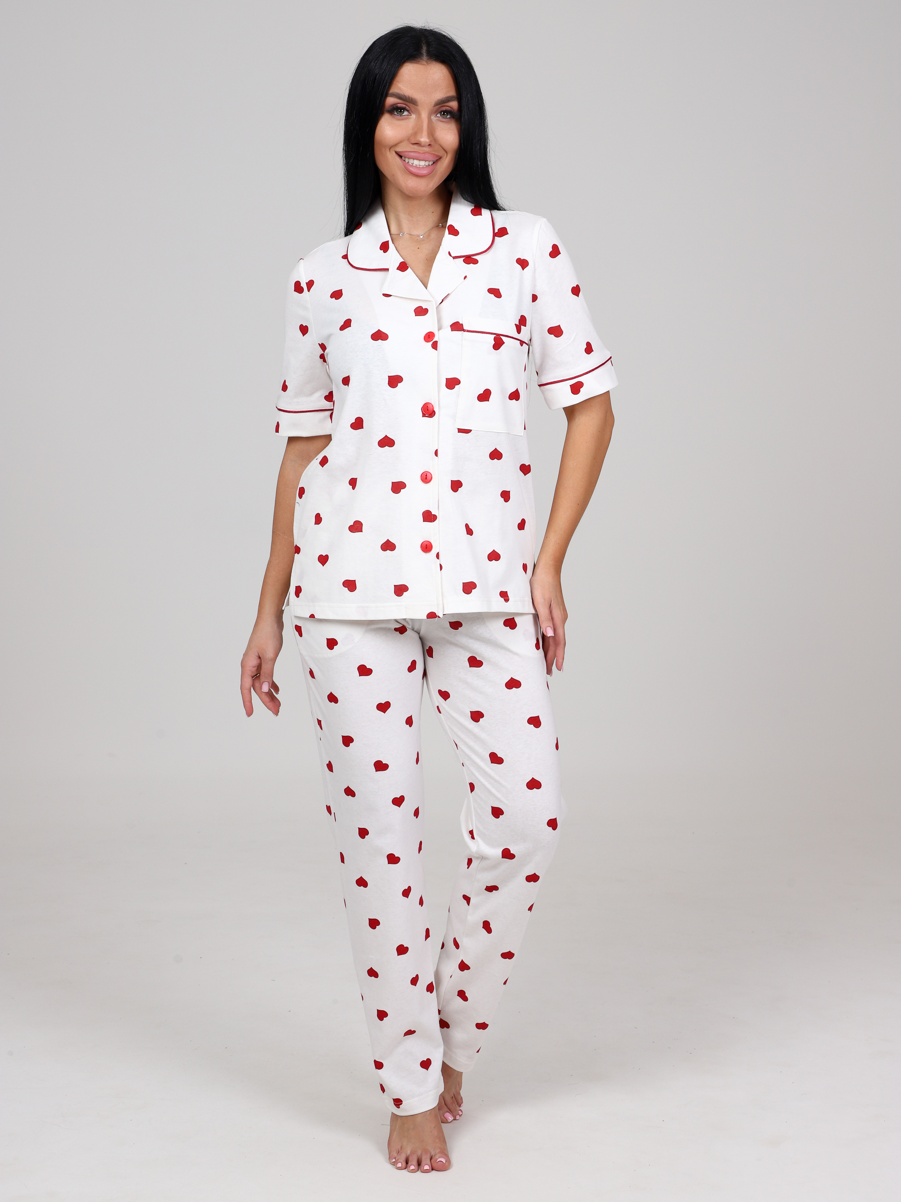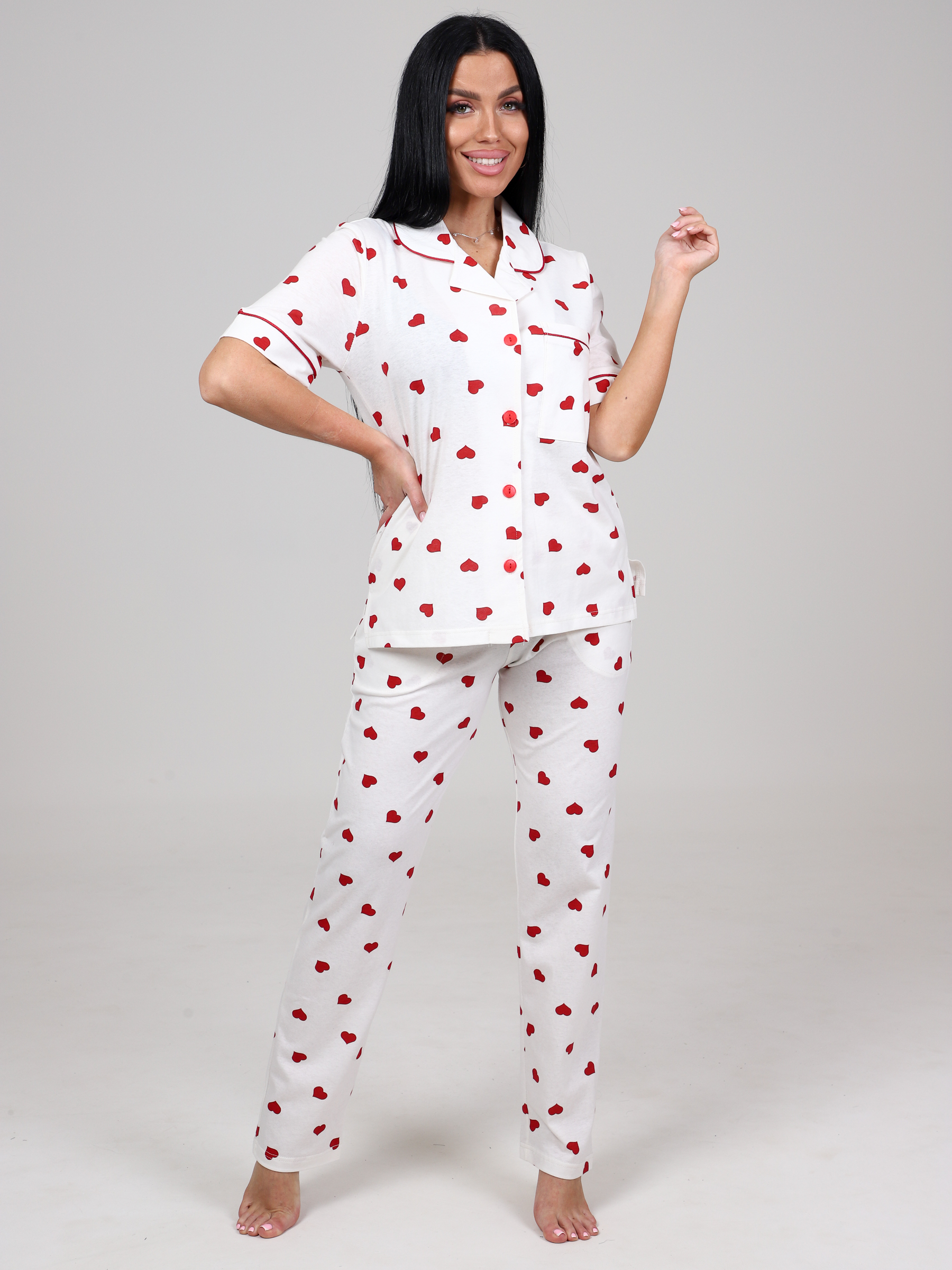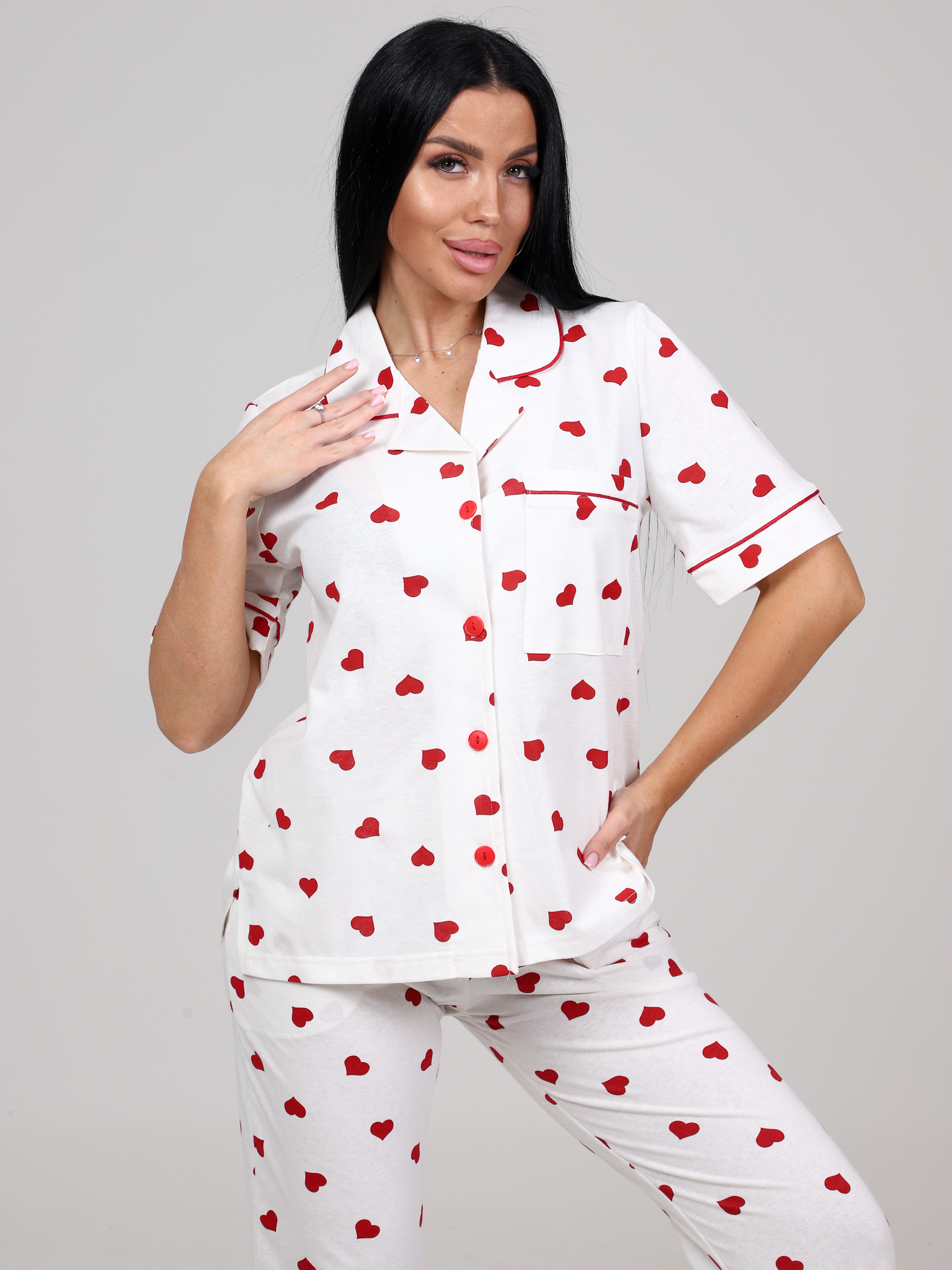 Костюм женский трикотажный из кулирки кк-61 - незаменимая вещь в базовом гардеробе. Домашний костюм с короткими рукавами состоит из рубашки с накладным карманом на полочке и брюк чуть зауженного силуэта. Стильный домашний женский костюм из 100% хлопка подойдет на каждый день. Домашний костюм хорошо пропускает воздух и не будет стеснять ваши движения благодаря мягкой трикотажной ткани. Яркий, сочный принт не оставит никого равнодушным, подойдет под любое Ваше настроение. Трикотажный домашний комплект подойдет для дома, для отдыха, для сна, для дачи, в поездку, на море, на отдых, а так же не стеснит движения даже во время активной игры с ребенком или уборки, а рубашка свободного кроя скроет недостатки фигуры.