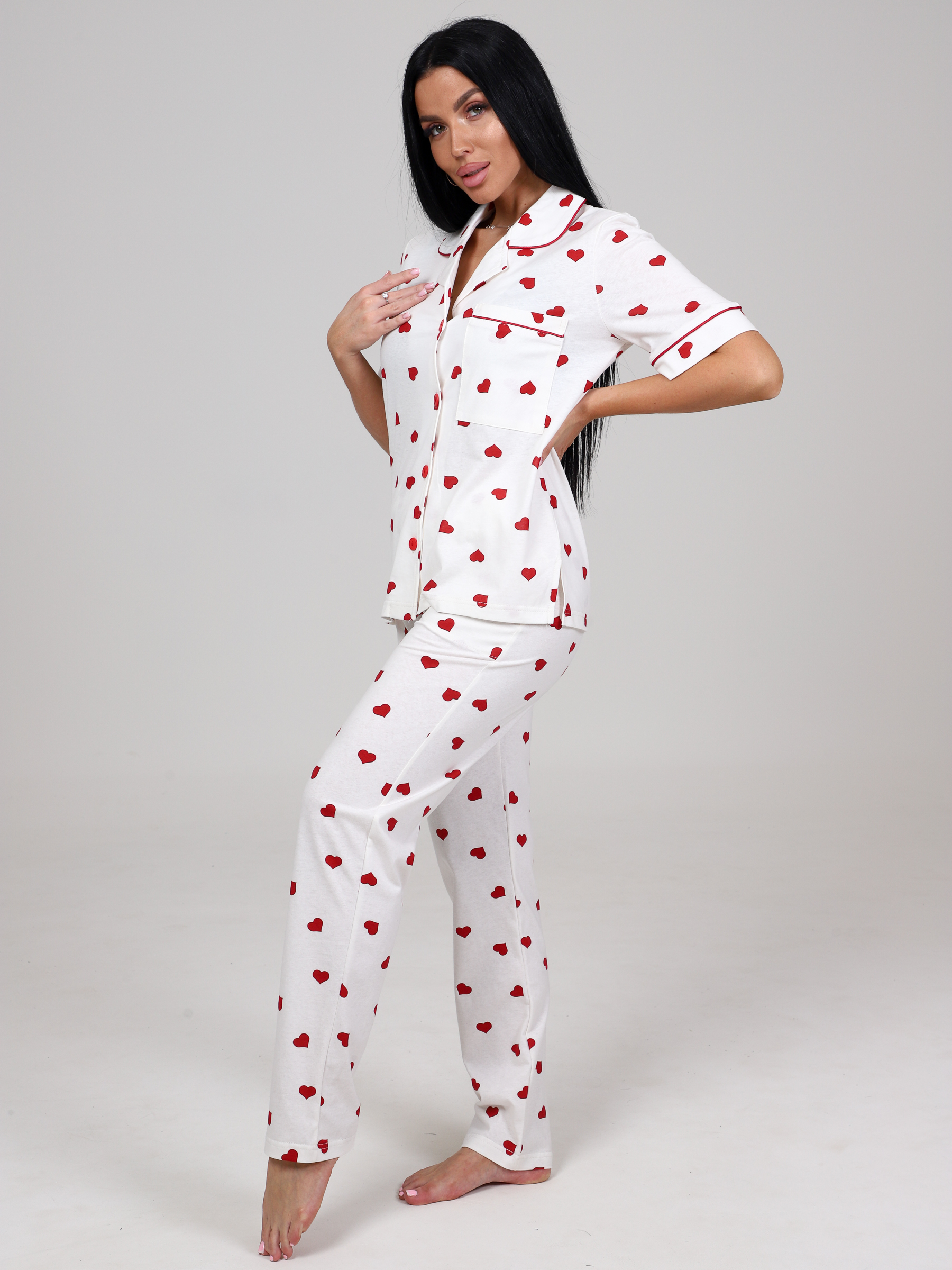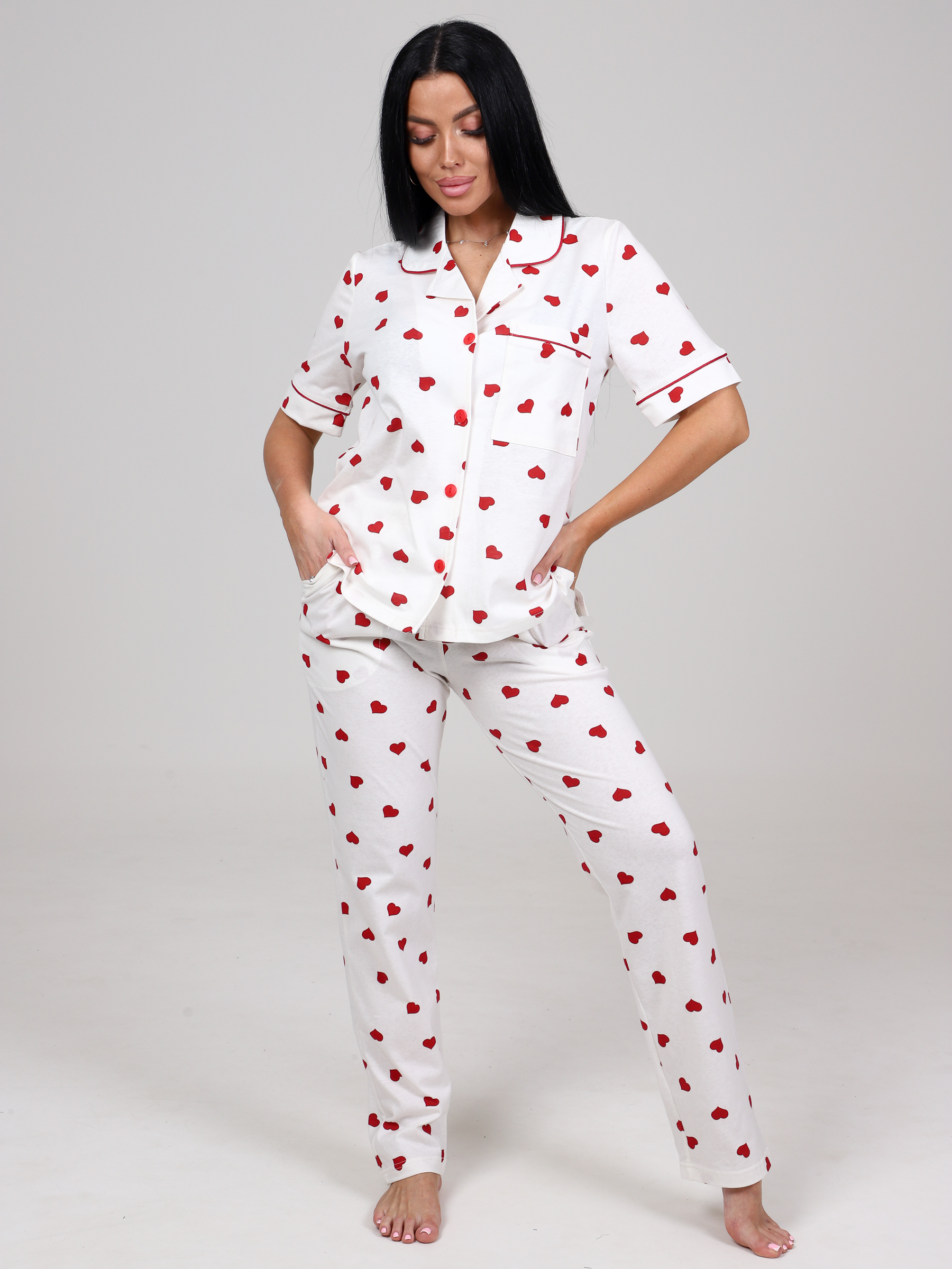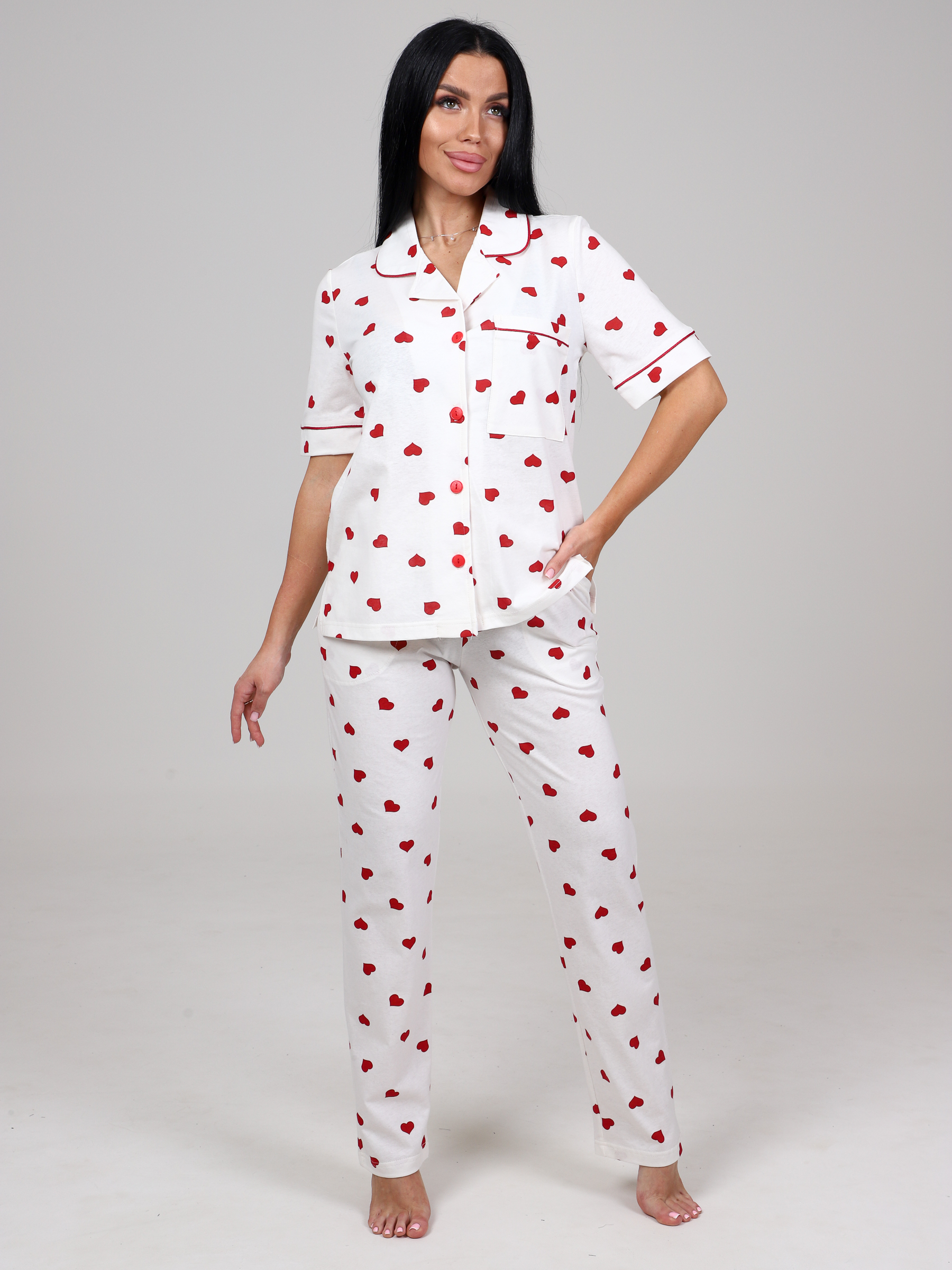 Костюм женский трикотажный из кулирки кк-61 - незаменимая вещь в базовом гардеробе. Домашний костюм с короткими рукавами состоит из рубашки с накладным карманом на полочке и брюк чуть зауженного силуэта. Стильный домашний женский костюм из 100% хлопка подойдет на каждый день. Домашний костюм хорошо пропускает воздух и не будет стеснять ваши движения благодаря мягкой трикотажной ткани. Яркий, сочный принт не оставит никого равнодушным, подойдет под любое Ваше настроение. Трикотажный домашний комплект подойдет для дома, для отдыха, для сна, для дачи, в поездку, на море, на отдых, а так же не стеснит движения даже во время активной игры с ребенком или уборки, а рубашка свободного кроя скроет недостатки фигуры.