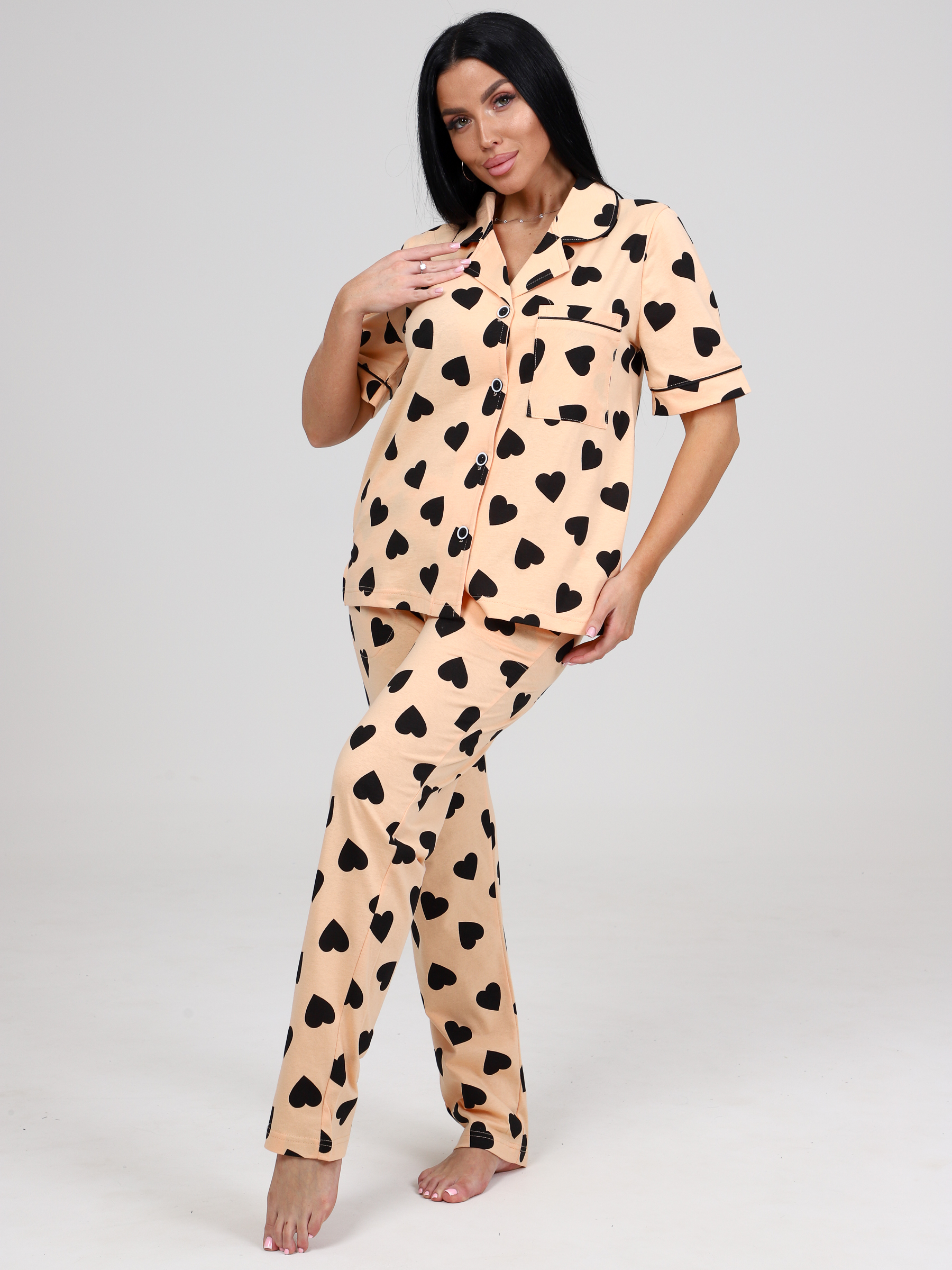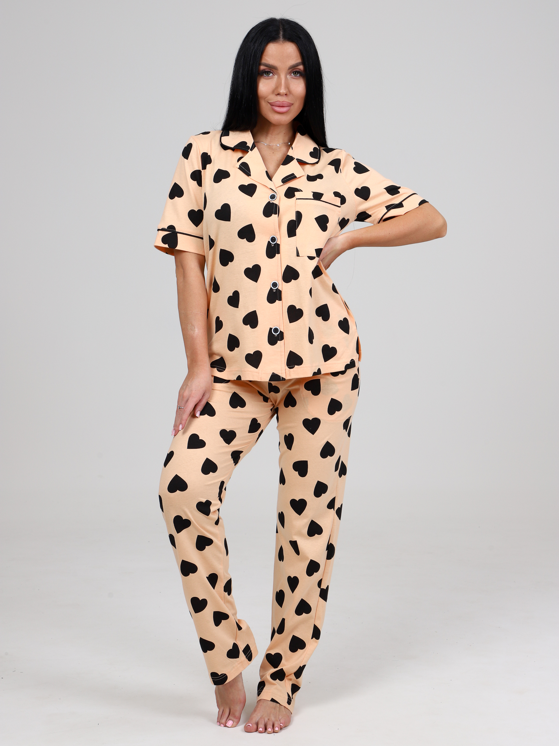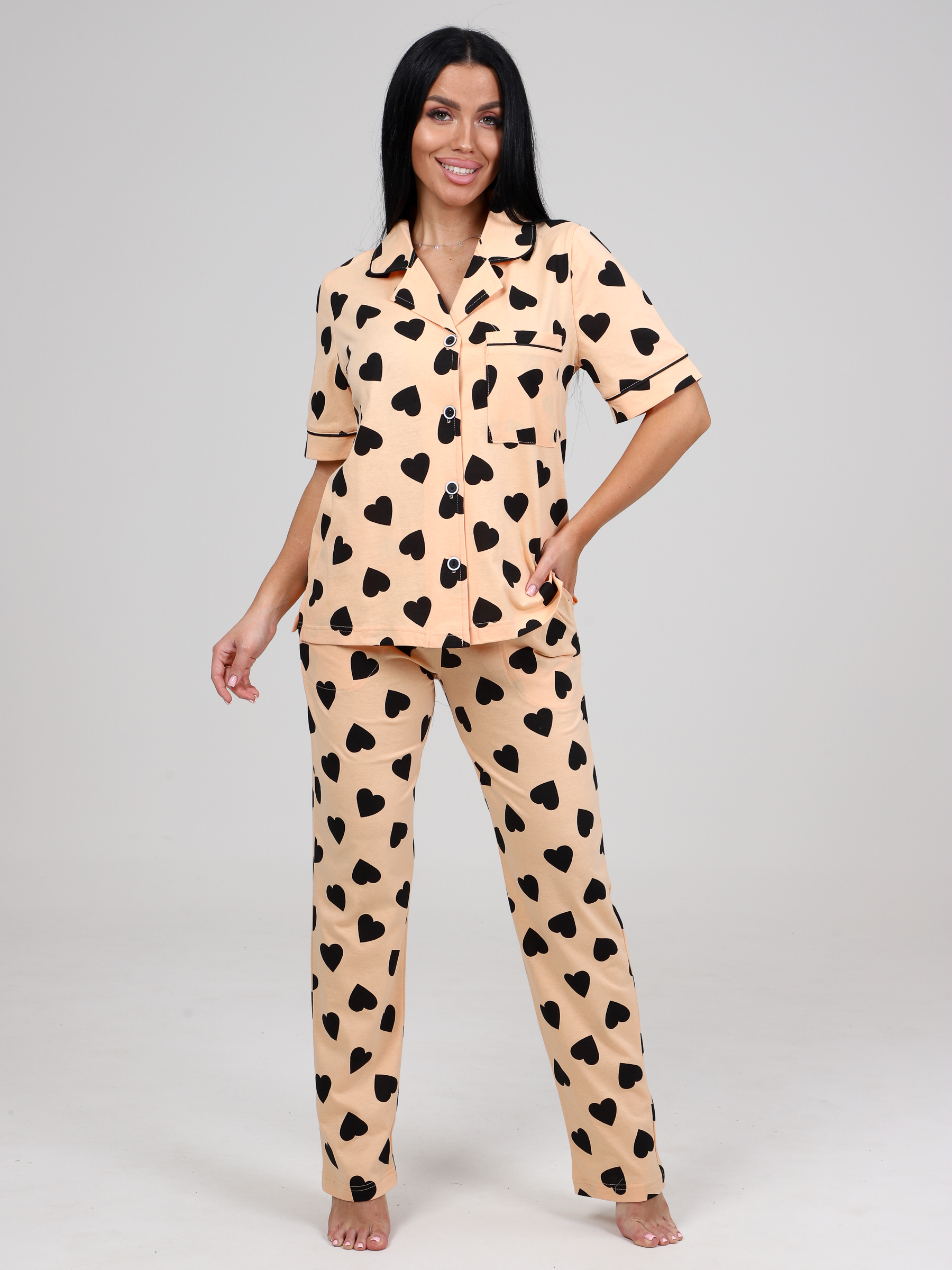 Костюм женский трикотажный из кулирки кк-61 - незаменимая вещь в базовом гардеробе. Домашний костюм с короткими рукавами состоит из рубашки с накладным карманом на полочке и брюк чуть зауженного силуэта. Стильный домашний женский костюм из 100% хлопка подойдет на каждый день. Домашний костюм хорошо пропускает воздух и не будет стеснять ваши движения благодаря мягкой трикотажной ткани. Яркий, сочный принт не оставит никого равнодушным, подойдет под любое Ваше настроение. Трикотажный домашний комплект подойдет для дома, для отдыха, для сна, для дачи, в поездку, на море, на отдых, а так же не стеснит движения даже во время активной игры с ребенком или уборки, а рубашка свободного кроя скроет недостатки фигуры.