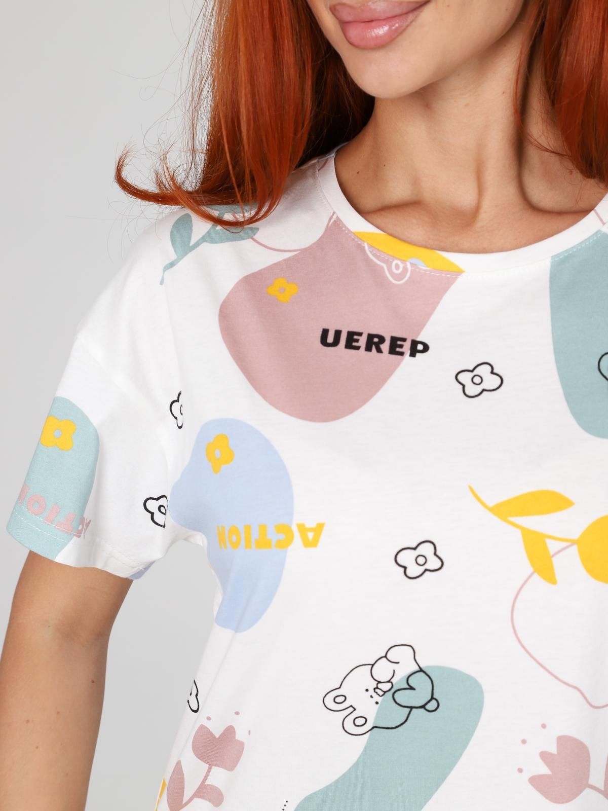 Пижама "Мирин" из набивного трикотажного полотна "кулирка" состоит из футболки и брюк. Футболка свободного покроя со спущенной линией плеча, короткими втачными рукавами, горловиной овальной формы, обработанной втачной планкой. Брюки длинные, свободного покроя, на притачном поясе с эластичной лентой и карманами в боковых швах.
