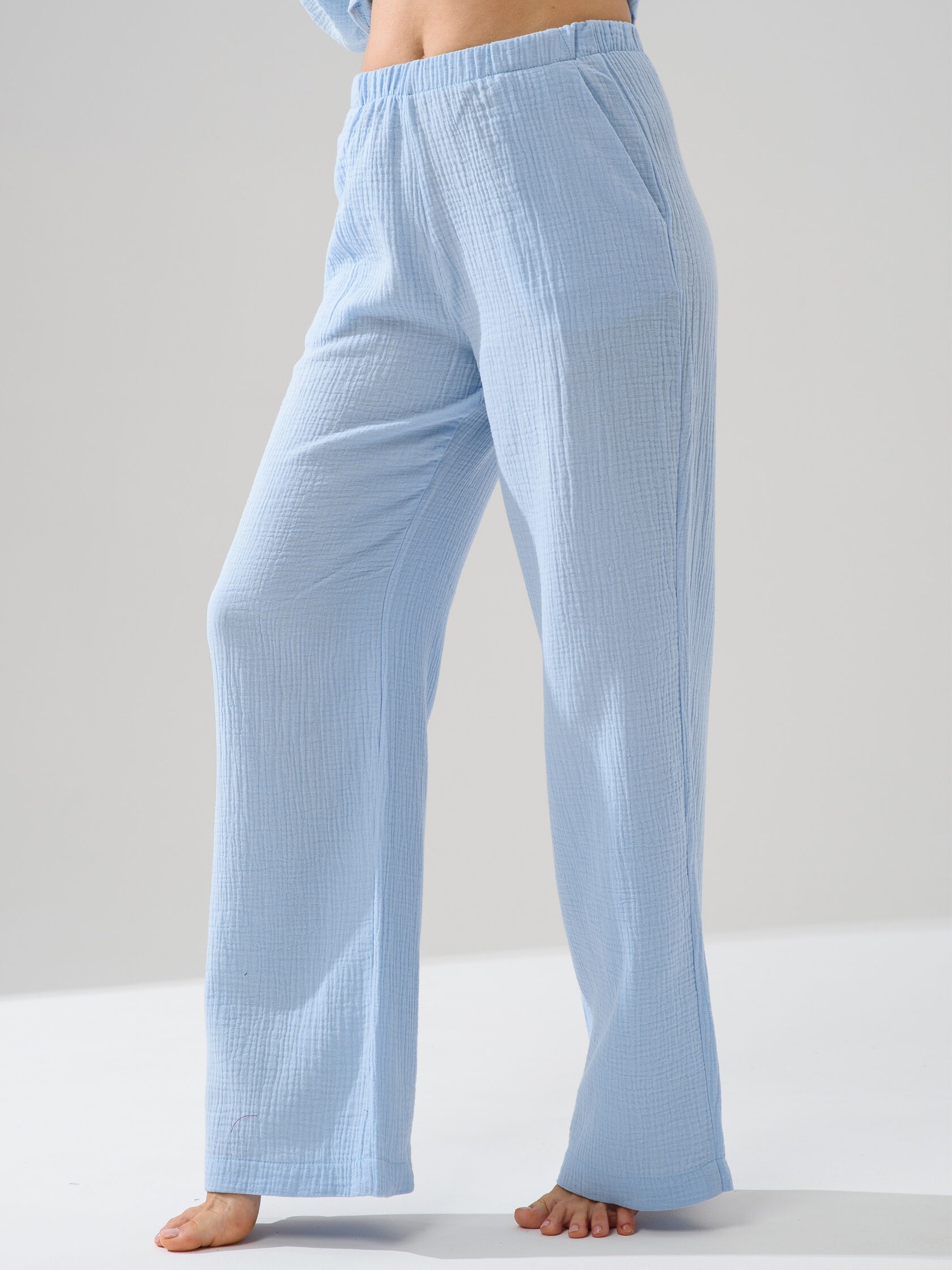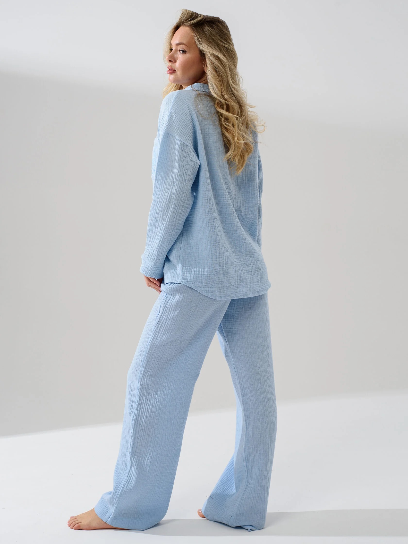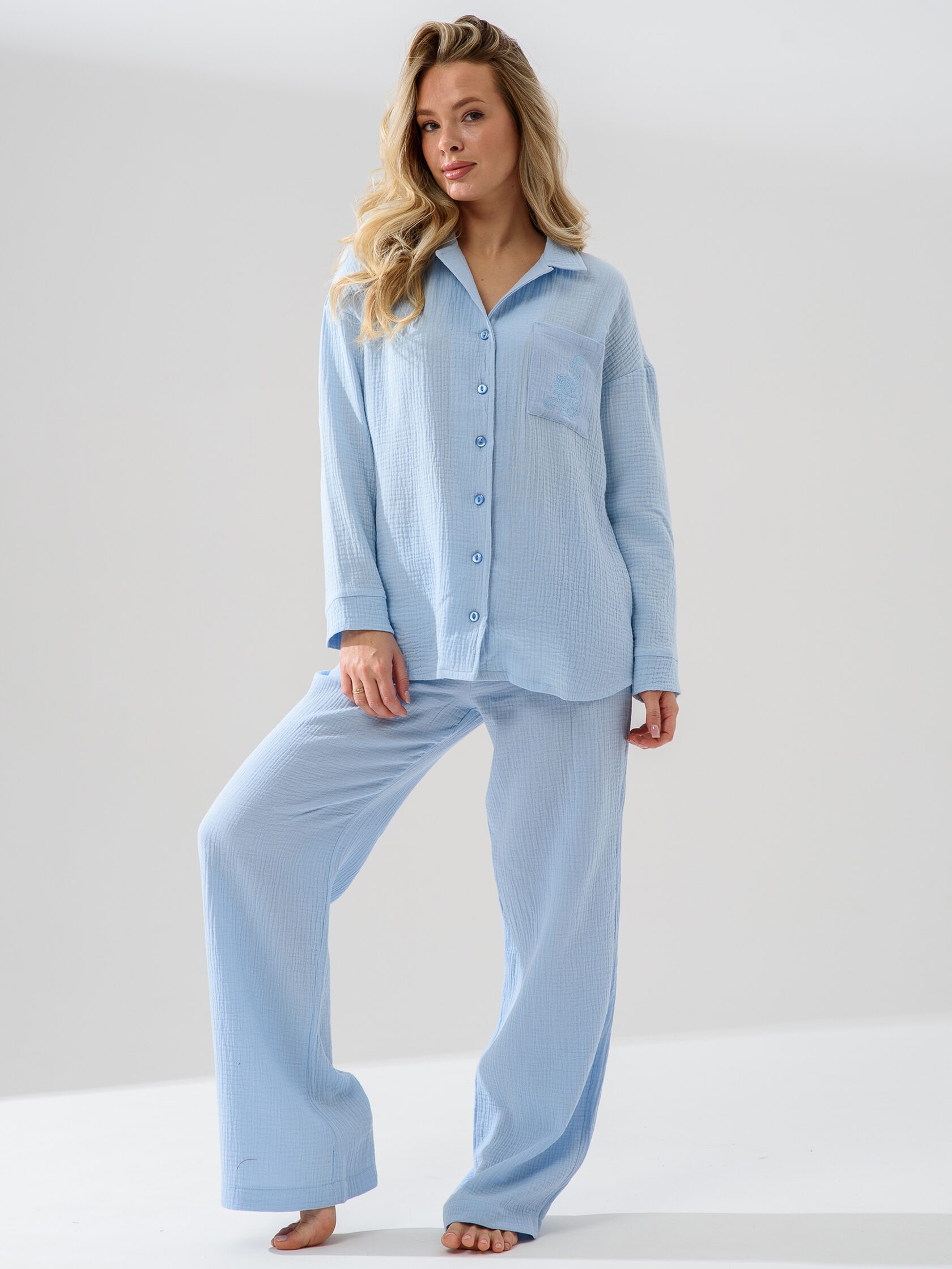 Женская пижама из муслина — это комплект домашней одежды, изготовленный из натуральной хлопковой ткани. Муслин отличается лёгкостью, воздухопроницаемостью и мягкостью, что обеспечивает комфорт во время сна и отдыха.