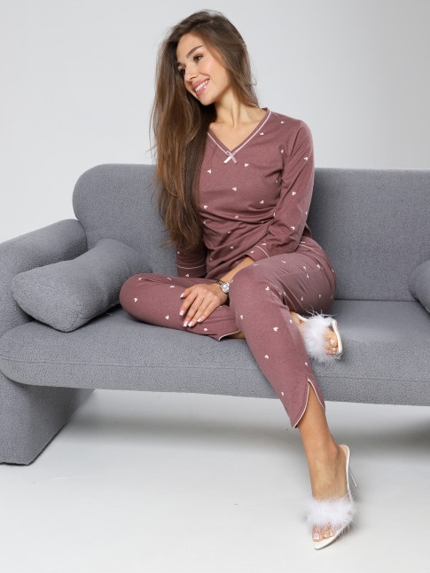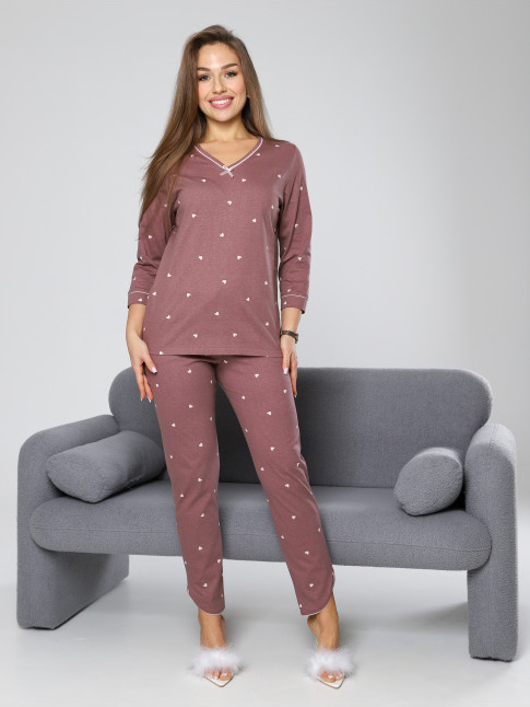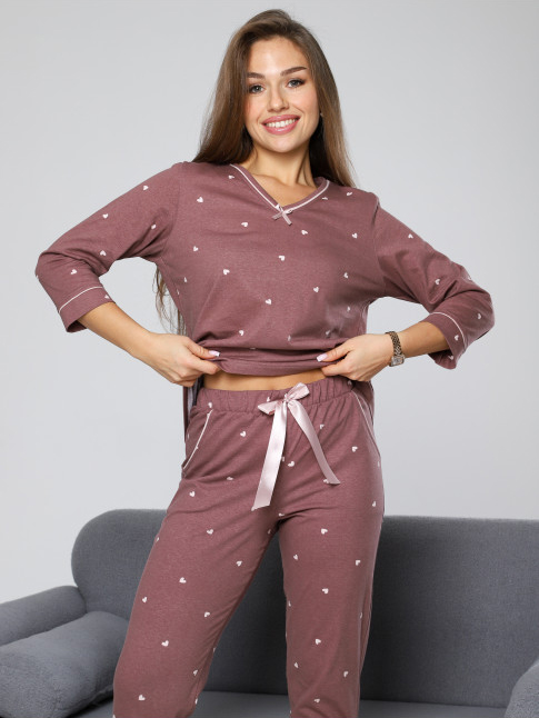 Пижама женская. Кофта с рукавом 3/4, брюки зауженные брюки с двумя внутренними карманами с кантом, боковые вырезы с окантовкой, пояс-резинка декорирован атласным бантом