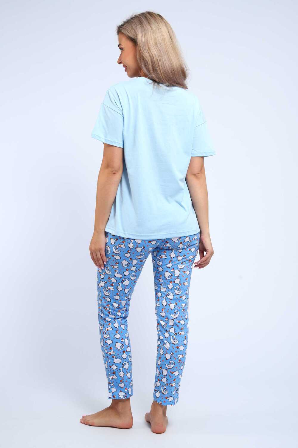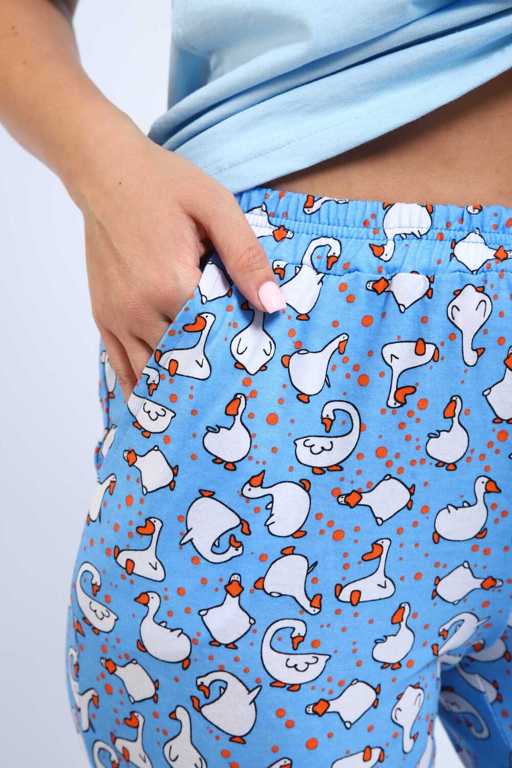 Нежная и легкая пижама из 100% хлопка, прекрасно сидит на фигуре. Брюки бананчики, с принтом гуси, выполнены с поясом на резинке, дополнены карманами. Отличный вариант для подарка, путешествия, отдыха...