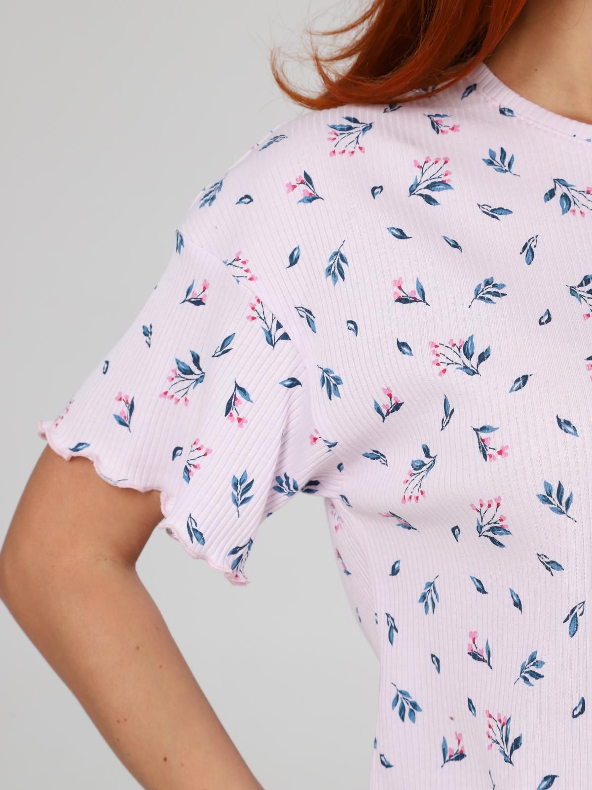 Пижама "Шодо" из набивного трикотажного полотна "кашкорсе" состоит из футболки и шорт. Футболка свободного покроя со спущенной линией плеча, короткими втачными рукавами, горловиной овальной формы, обработанной втачной планкой. Нижние срезы рукавов и низ изделия обработаны узкой обметочной строчкой, создающей красивый волнистый край. Шорты средней длины с цельнокроеным поясом с эластичной лентой. Нижние срезы шорт обработаны узкой обметочной строчкой, создающей красивый волнистый край.