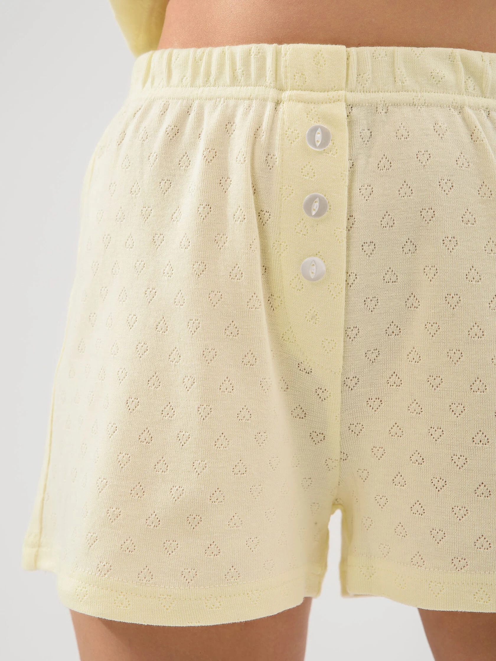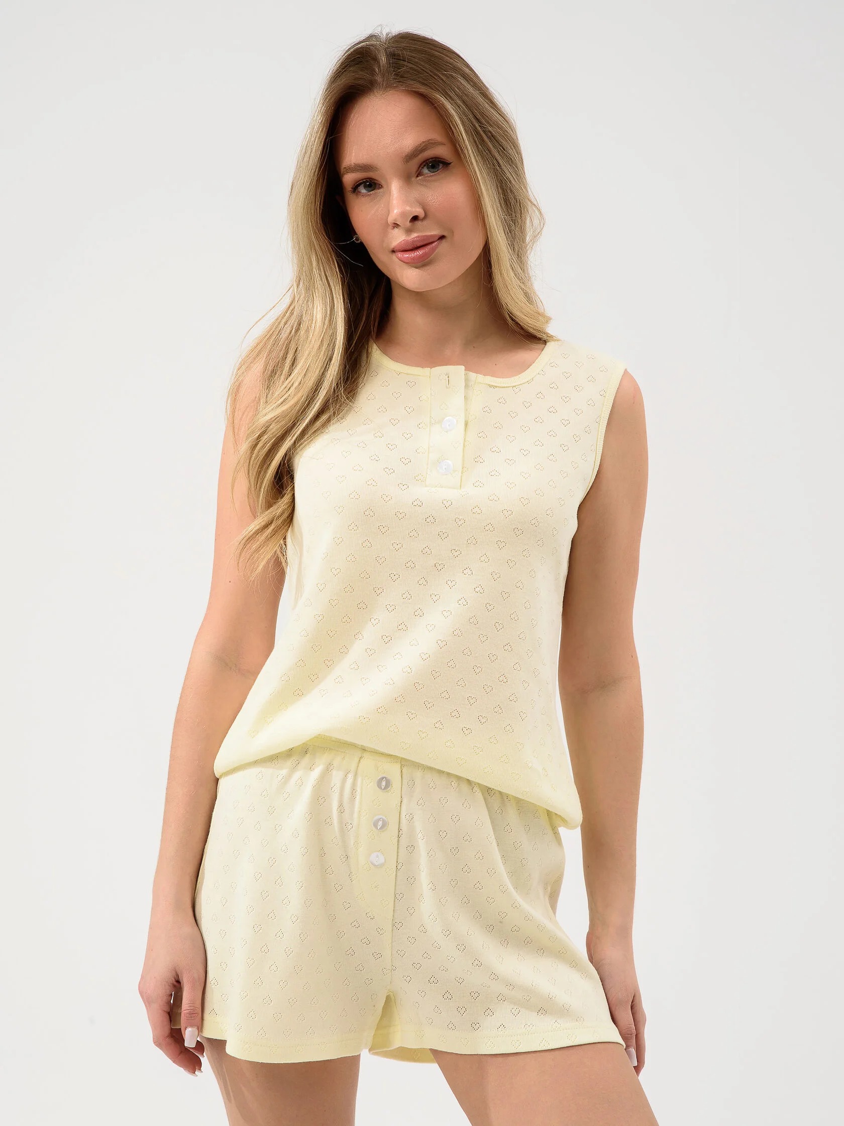 Пижама "Шарм" (шорты) 2429-Рн / Желтый отлично подойдет для комфортного отдыха дома, сочетая в себе практичность и эстетику. Благодаря натуральному составу, изделие обеспечивает приятные тактильные ощущения и позволяет коже дышать.