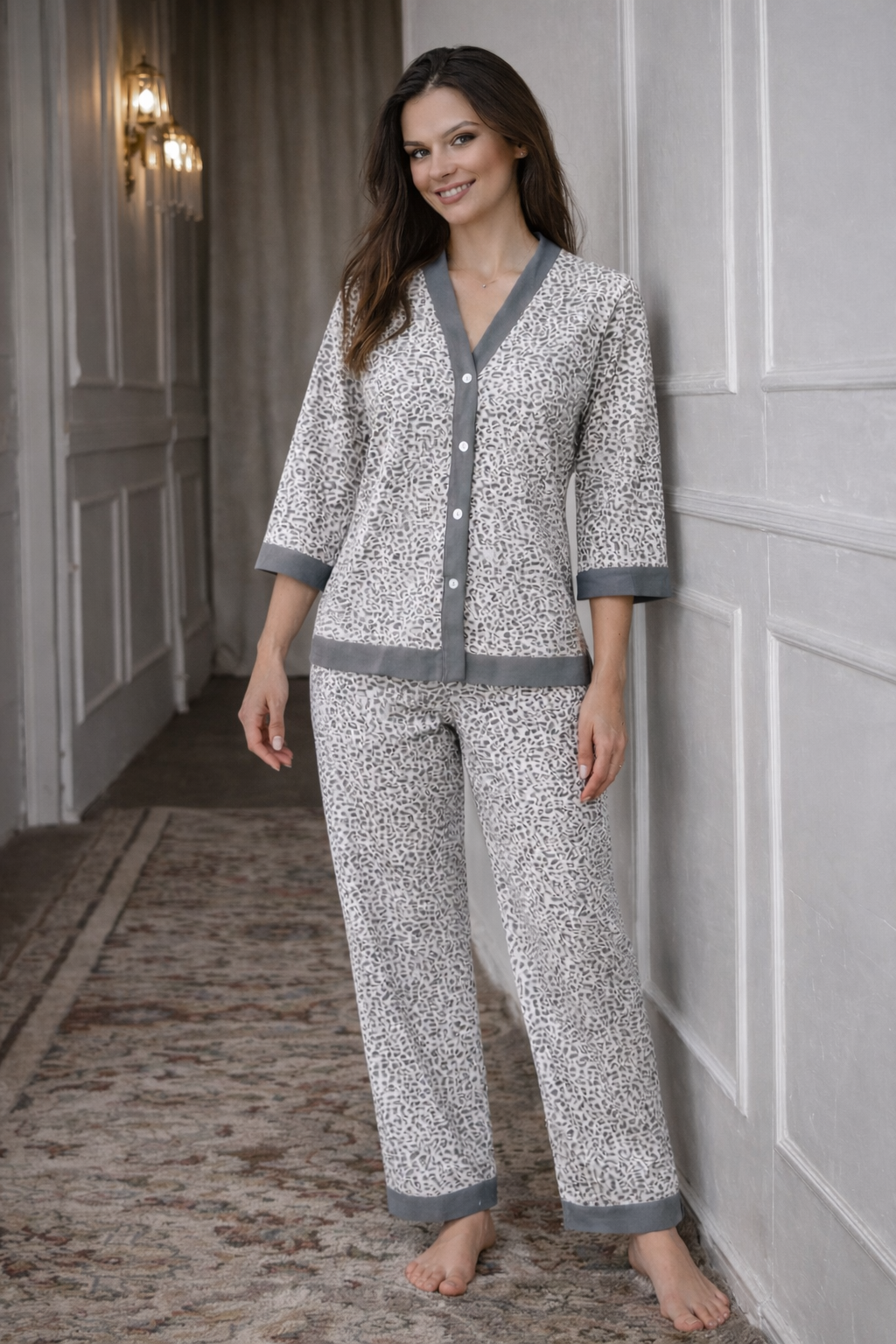 Женская пижама из 100% хлопка — идеальный вариант для комфортного сна и уютного отдыха дома. Натуральная ткань мягкая, дышащая и приятная к телу, подходит для повседневного использования в любое время года. Модель выполнена в удобном свободном силуэте, не сковывает движений и обеспечивает максимальный комфорт. Брюки на мягкой резинке, без карманов, удобно сидят по фигуре и не создают лишнего объёма. Кофта застёгивается на пуговицы, что делает пижаму практичной и комфортной в носке, а рукав длиной 3/4 обеспечивает удобство и свободу движений. Пижама отлично подходит не только для сна, но и в качестве стильного и уютного домашнего костюма. Модель представлена в широком размерном ряду и выполнена в трендовых расцветках с актуальными принтами, благодаря чему станет прекрасным подарком для родных и близких — практичным, красивым и по-настоящему комфортным.