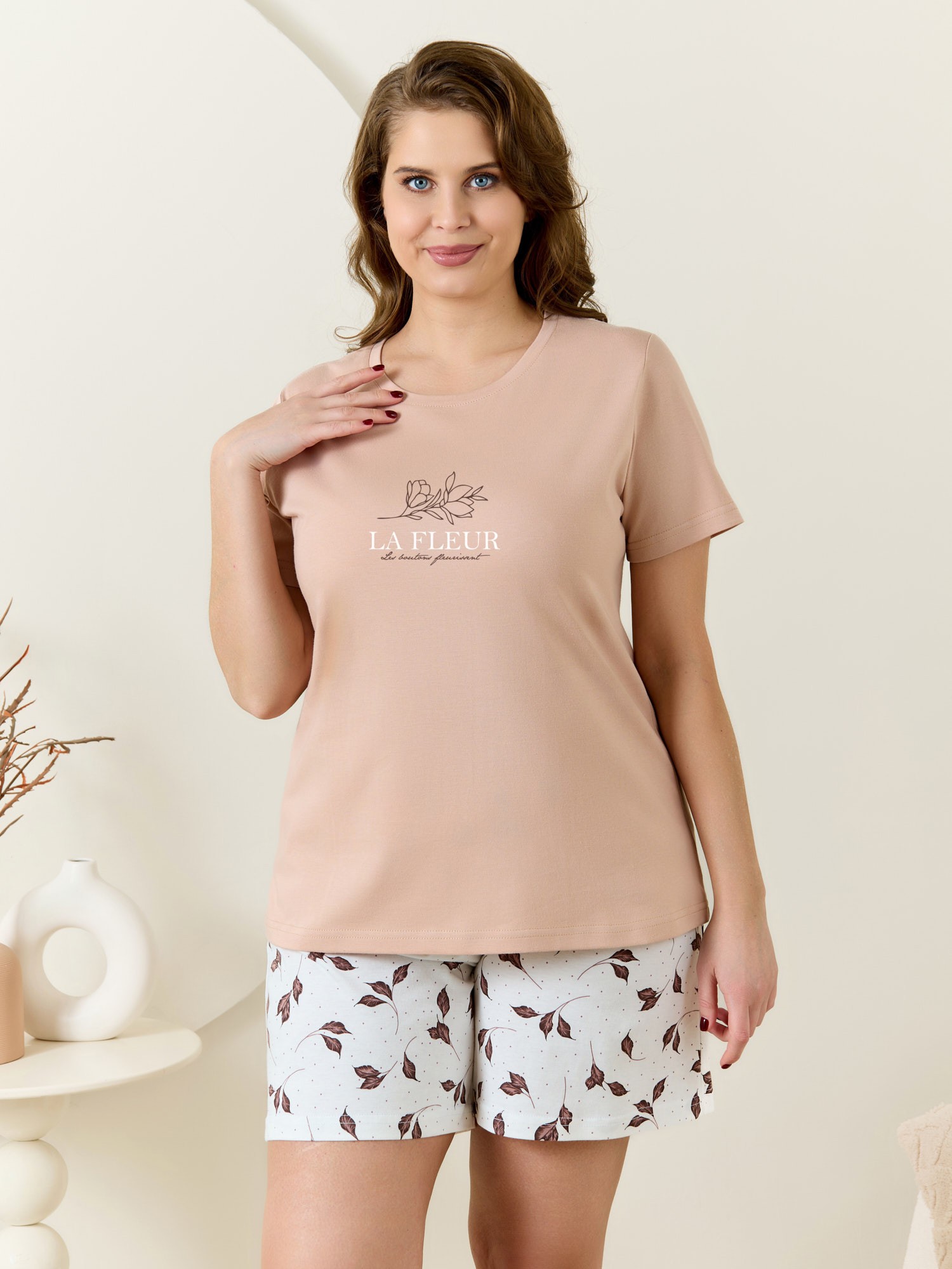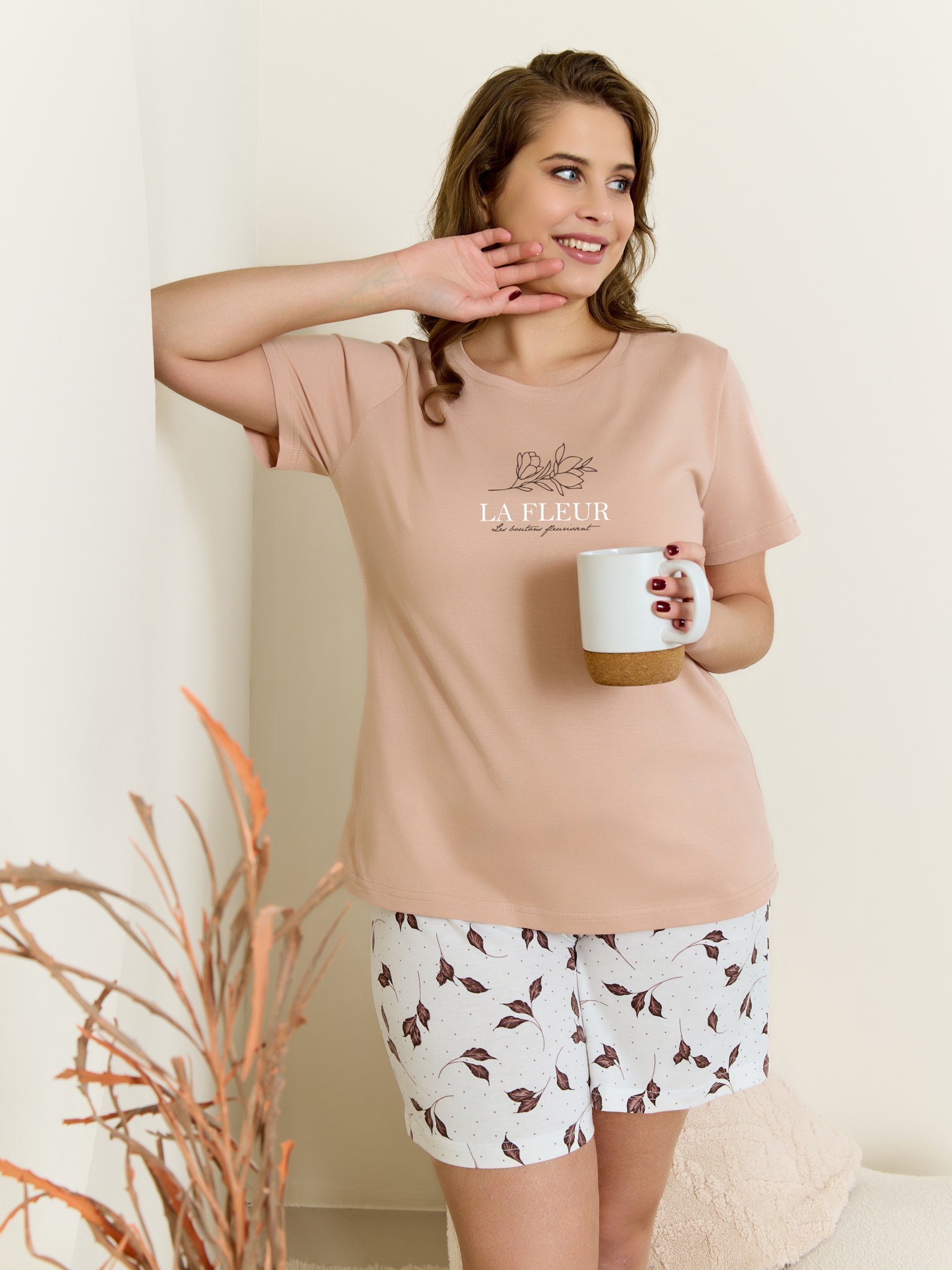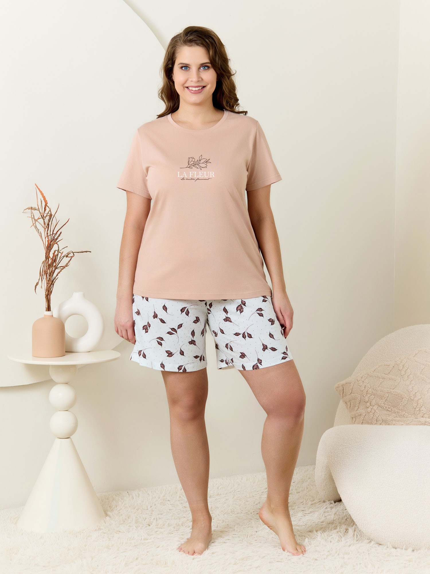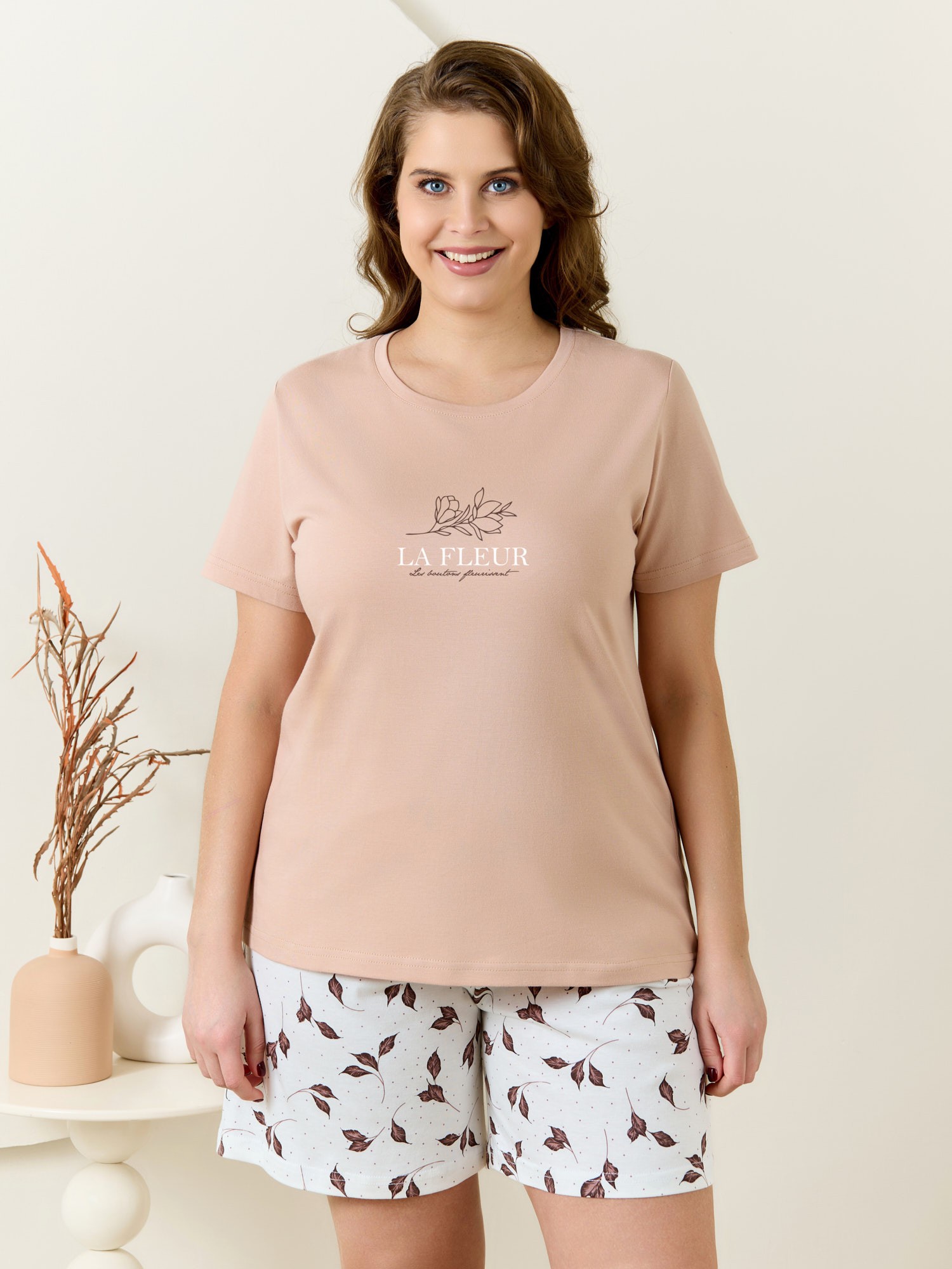 Пижама женская из трикотажного полотна «кулирка» в комбинации двух видов полотен: гладкокрашеного и с набивным рисунком, состоящая из футболки и шорт. Футболка женская из гладкокрашеного трикотажного полотна «кулирка», классического покроя, с короткими втачными рукавами, горловиной овальной формы, обработанной притачной бейкой из основного материала и принтом на полочке, выполненным в технике «шелкографии». Шорты – из полотна с набивным рисунком, удлиненные, свободного покроя, с эластичной тесьмой по талии.