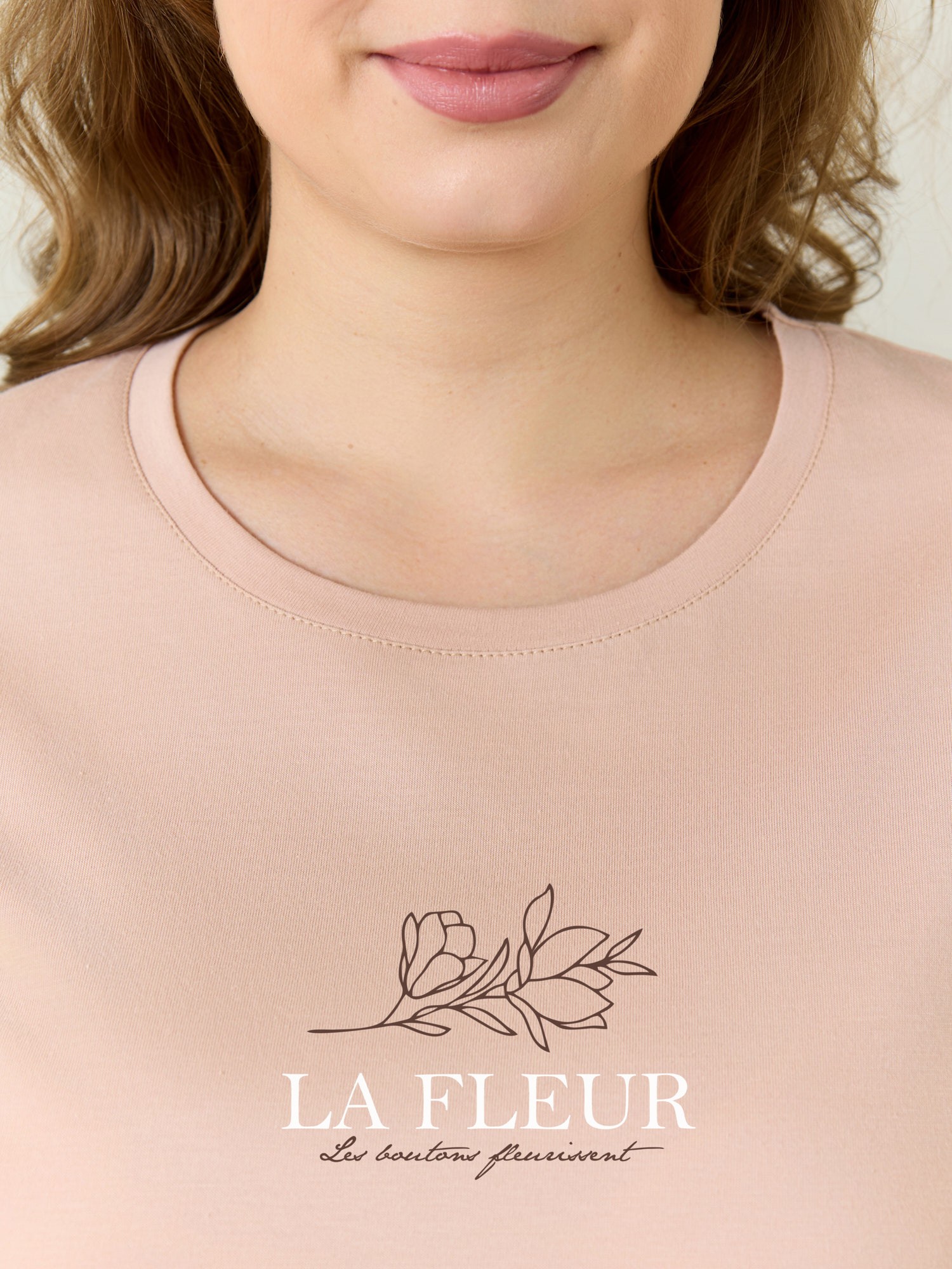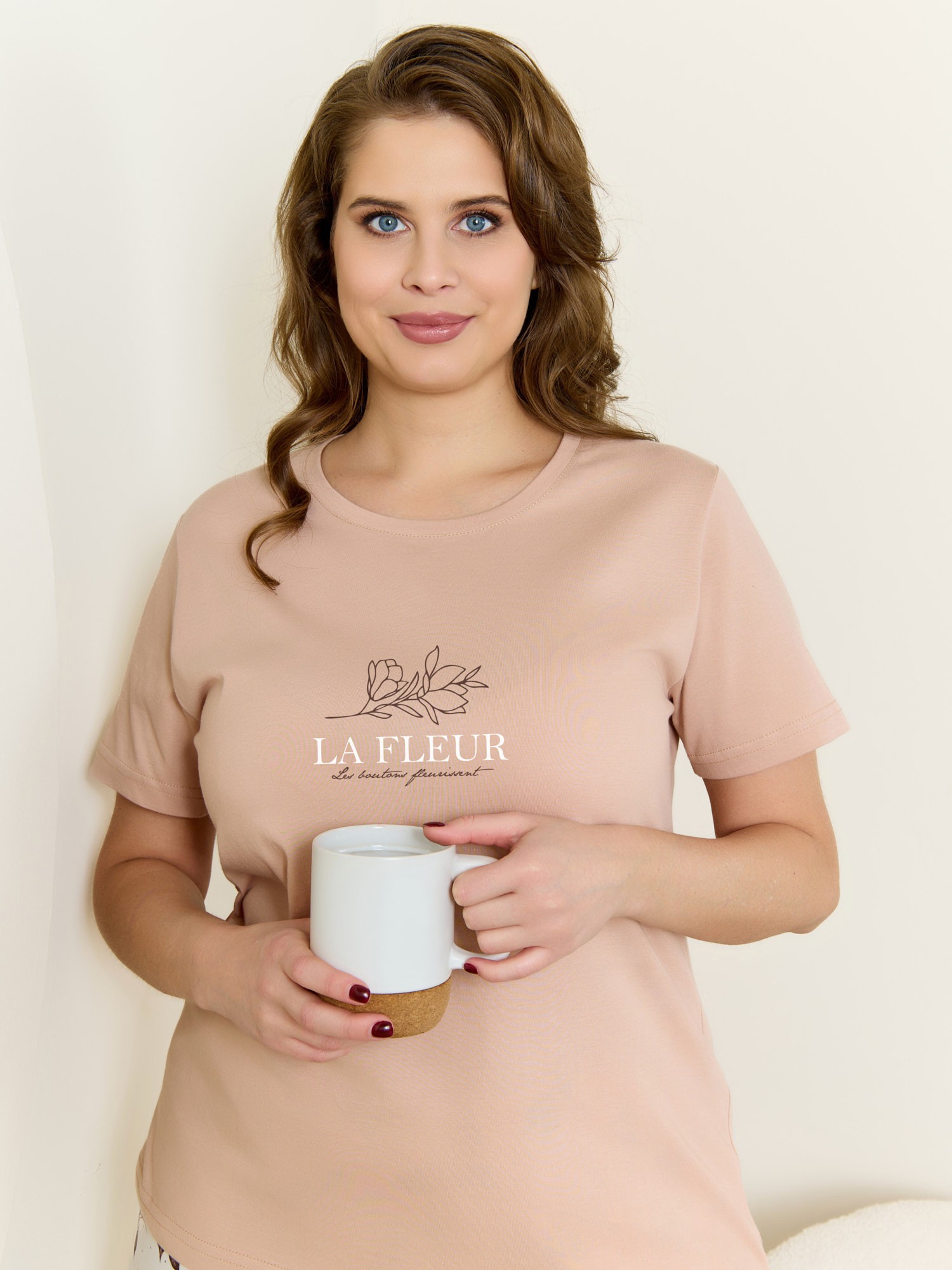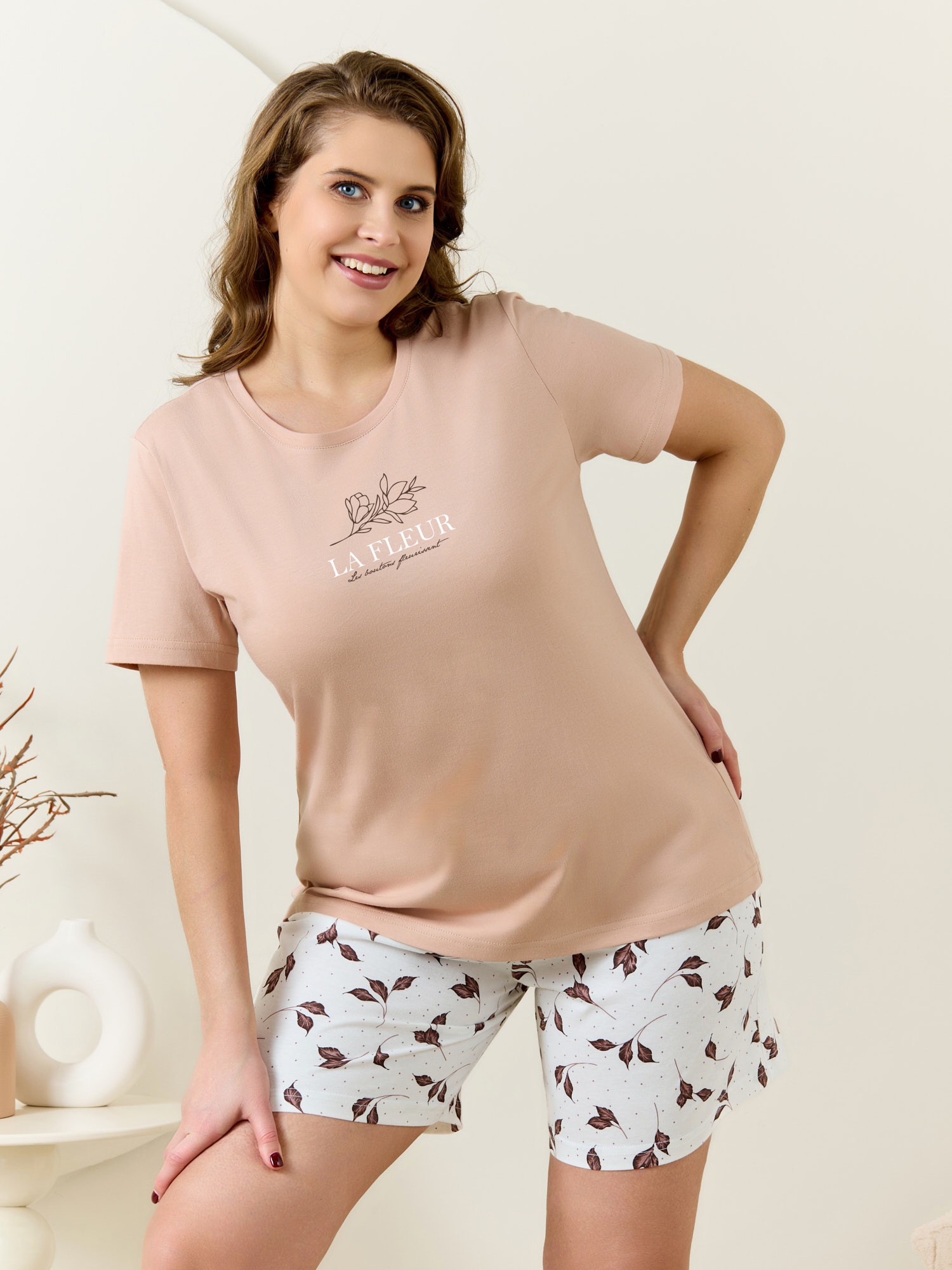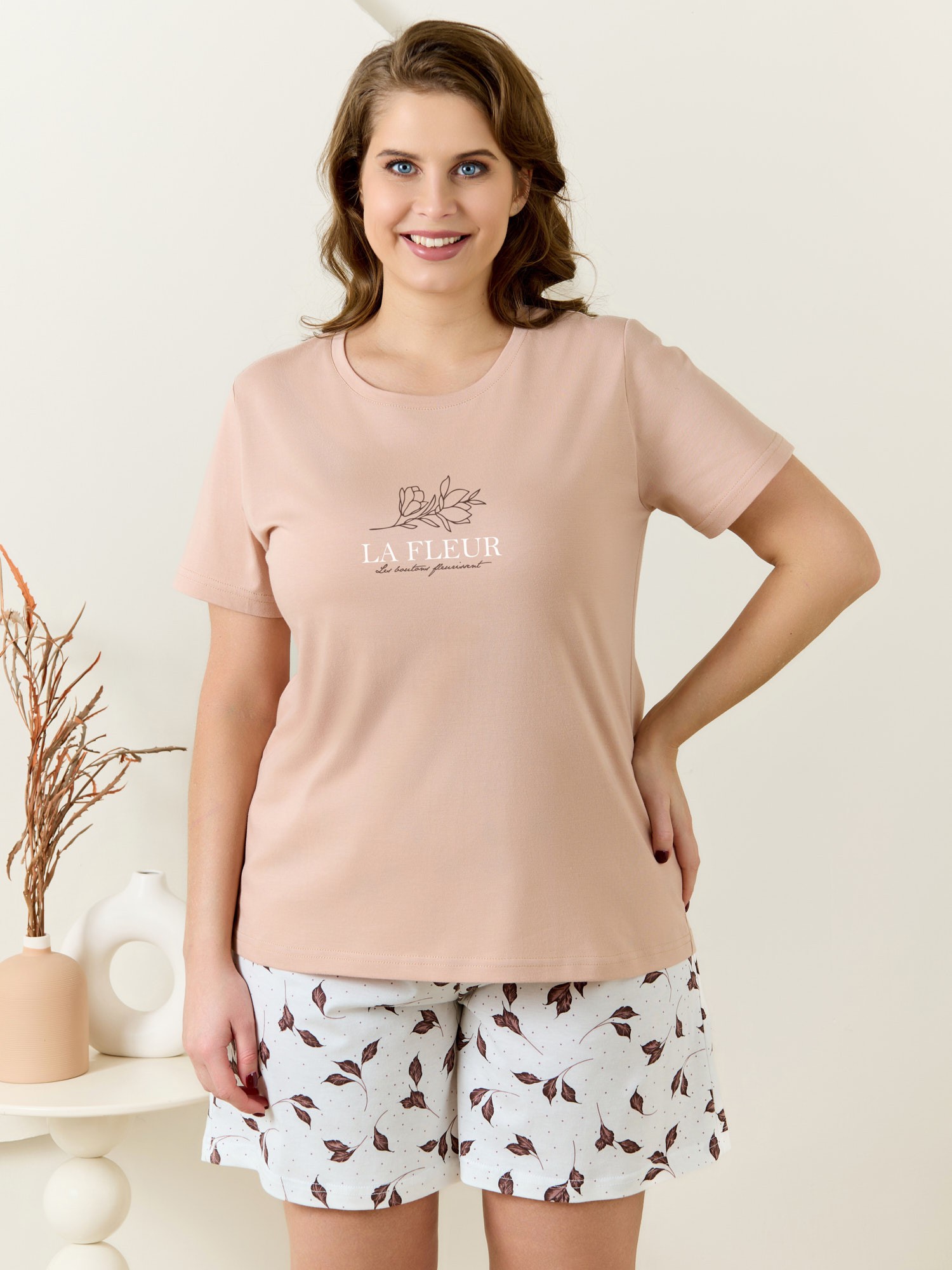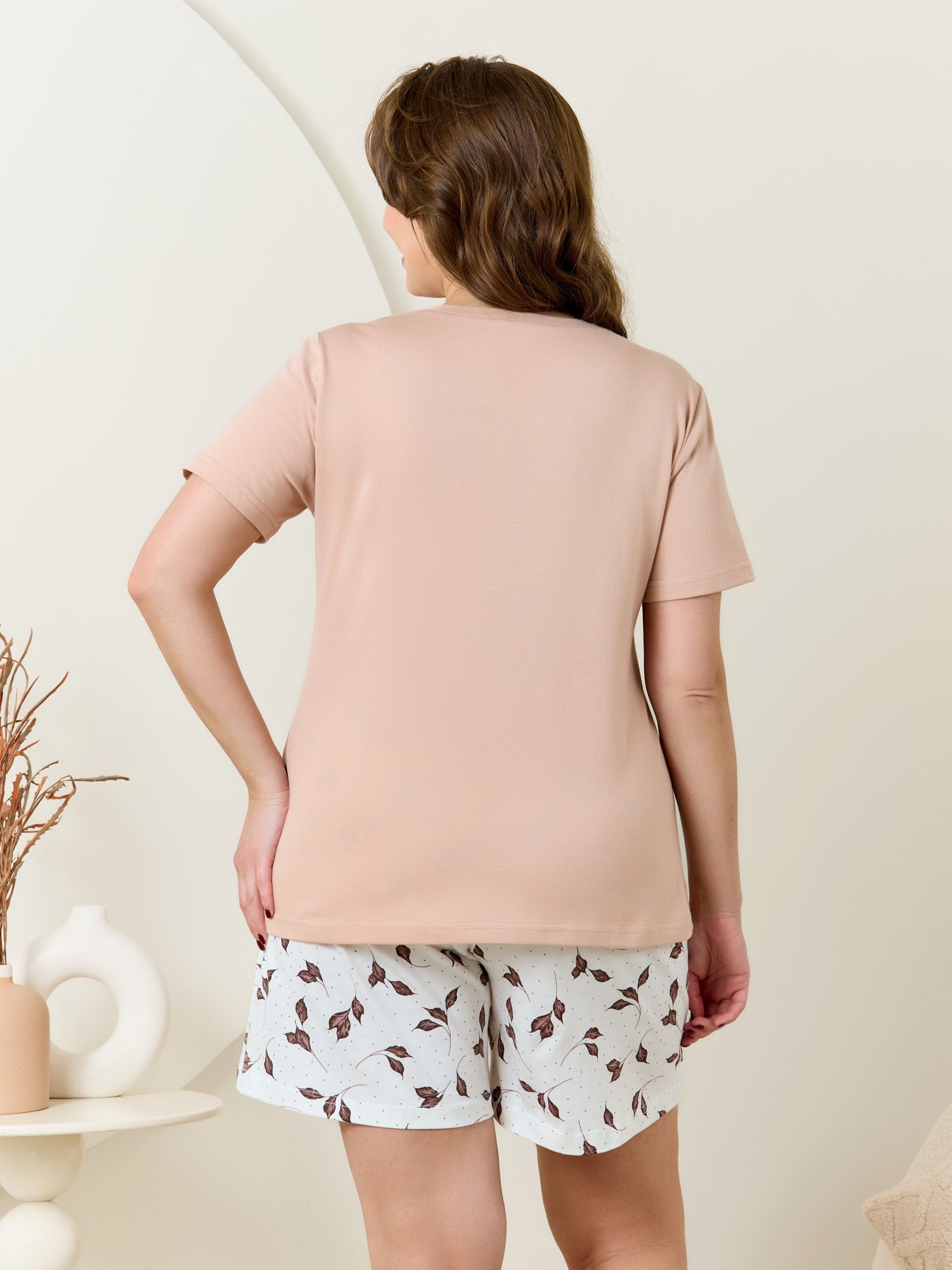 Пижама женская из трикотажного полотна «кулирка» в комбинации двух видов полотен: гладкокрашеного и с набивным рисунком, состоящая из футболки и шорт. Футболка женская из гладкокрашеного трикотажного полотна «кулирка», классического покроя, с короткими втачными рукавами, горловиной овальной формы, обработанной притачной бейкой из основного материала и принтом на полочке, выполненным в технике «шелкографии». Шорты – из полотна с набивным рисунком, удлиненные, свободного покроя, с эластичной тесьмой по талии.