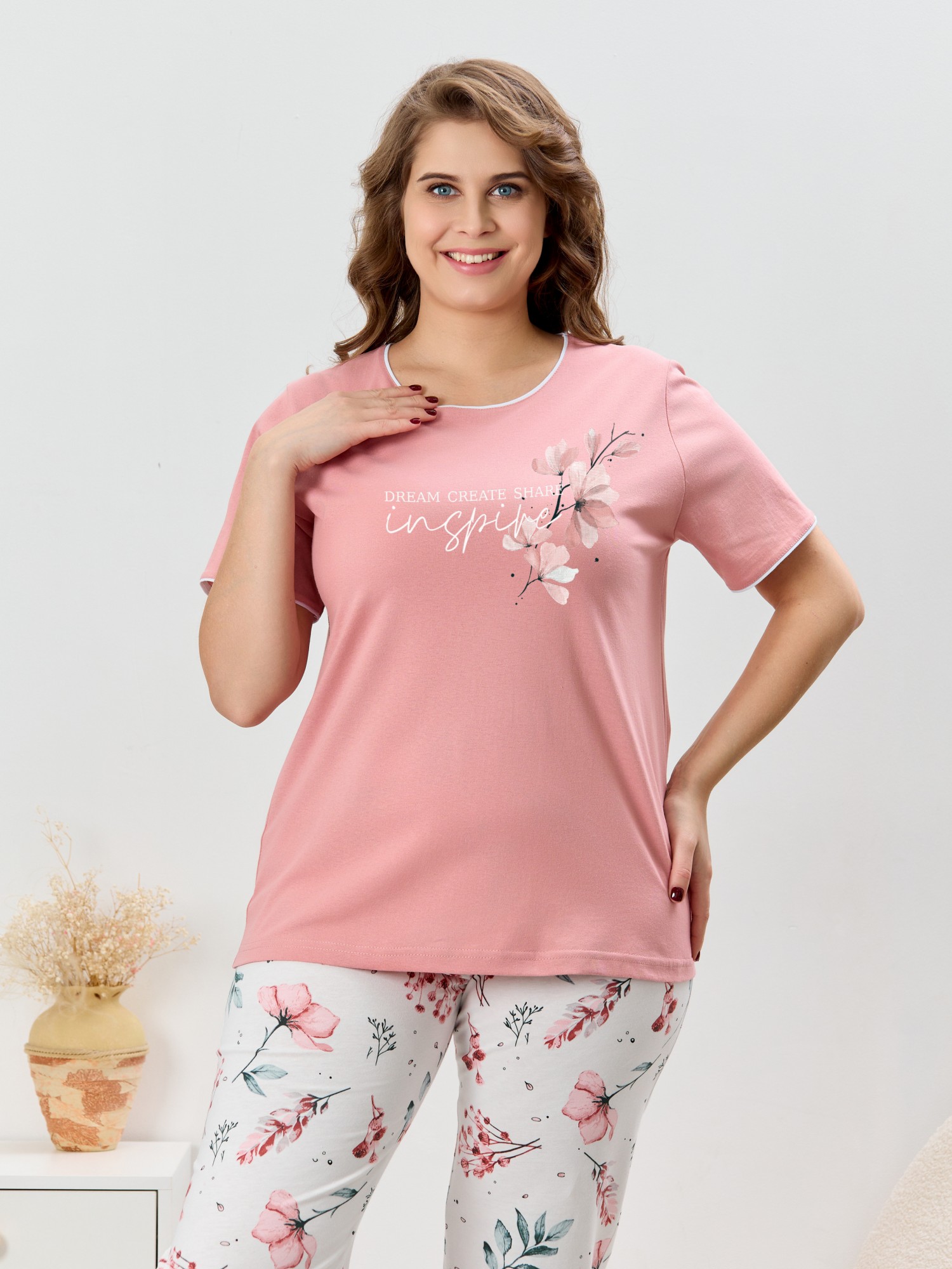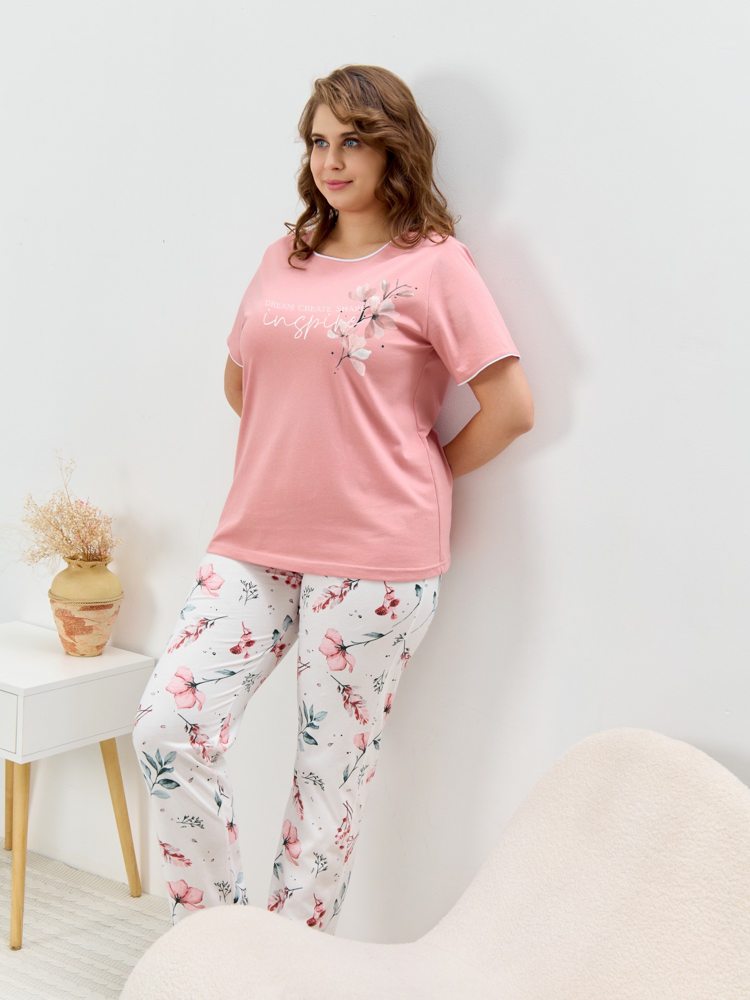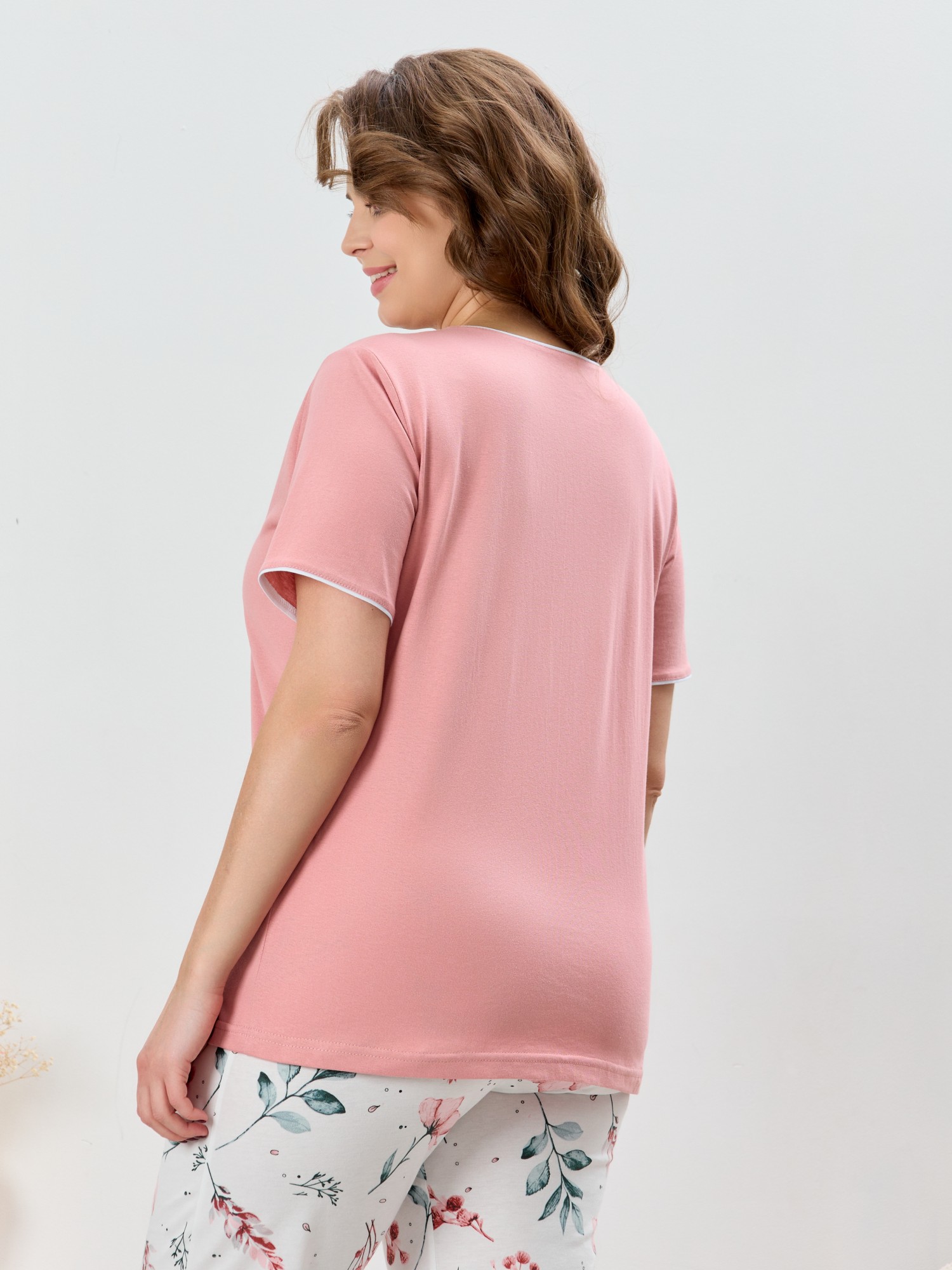 Пижама женская из трикотажного полотна «кулирка» в комбинации двух видов полотен: с набивным рисунком и гладкокрашеного в единой цветовой гамме, состоящая из футболки и брюк. Футболка - из гладкокрашеного полотна, классического покроя, с короткими втачными рукавами, горловиной овальной формы и принтом на полочке, выполненным в технике «шелкографии». Горловина, низ рукавов обработаны узким притачным кантом контрастного цвета. Брюки - длинные, с эластичной тесьмой по талии и притачными манжетами, которые обработаны с узким кантом контрастного цвета в соединительных швах.