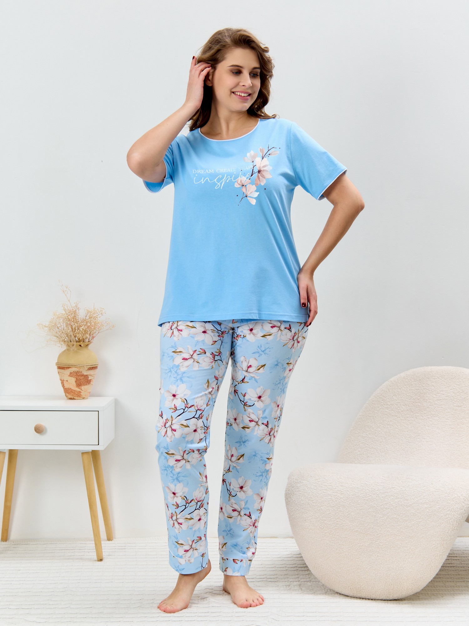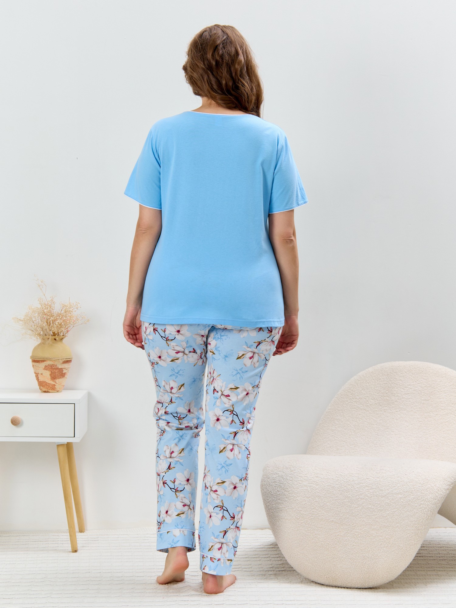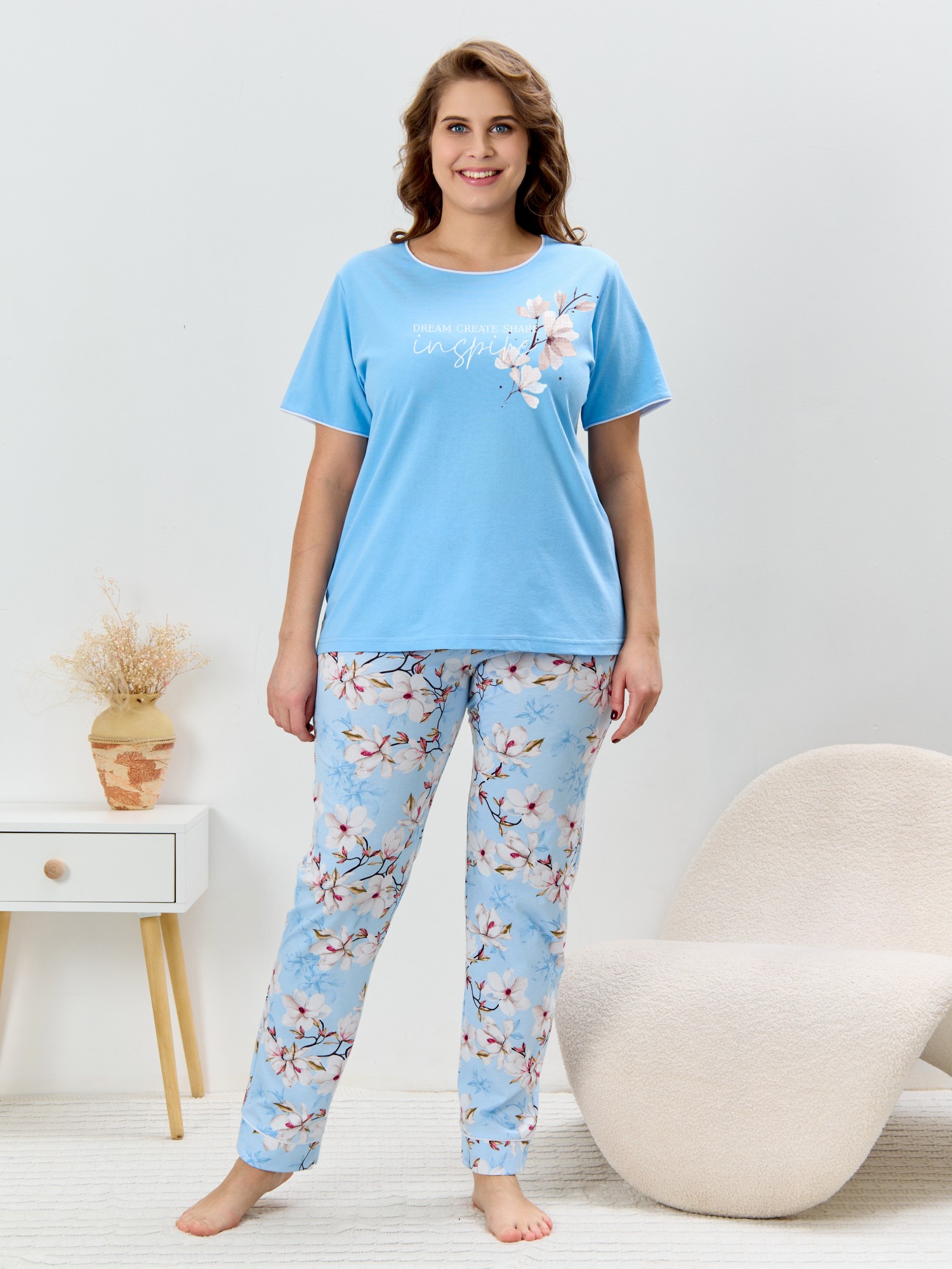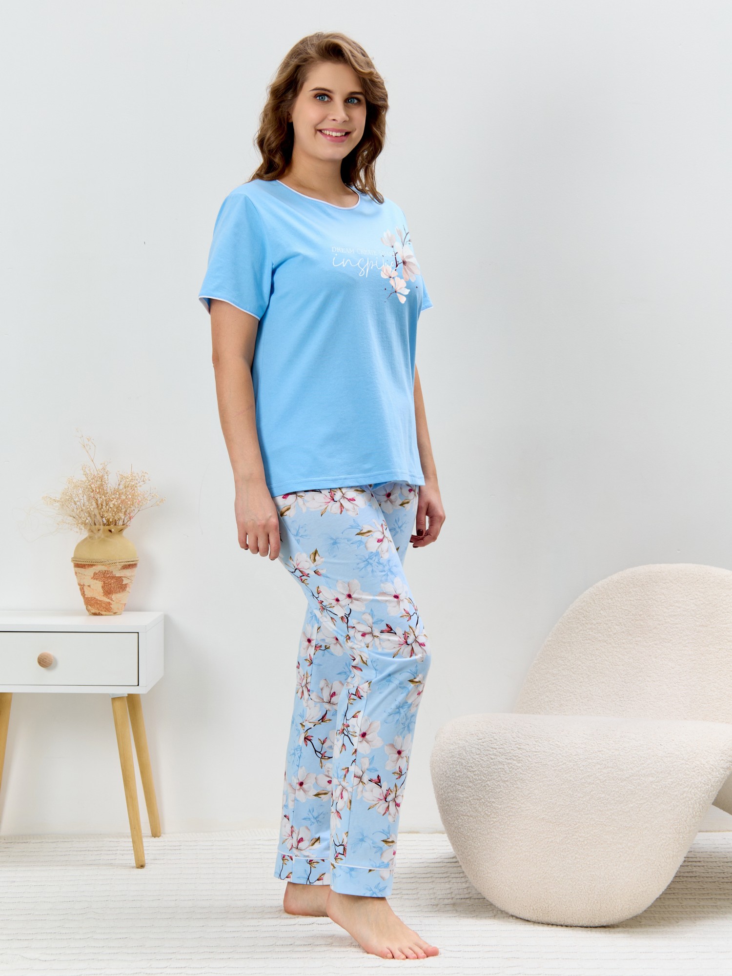 Пижама женская из трикотажного полотна «кулирка» в комбинации двух видов полотен: с набивным рисунком и гладкокрашеного в единой цветовой гамме, состоящая из футболки и брюк. Футболка - из гладкокрашеного полотна, классического покроя, с короткими втачными рукавами, горловиной овальной формы и принтом на полочке, выполненным в технике «шелкографии». Горловина, низ рукавов обработаны узким притачным кантом контрастного цвета. Брюки - длинные, с эластичной тесьмой по талии и притачными манжетами, которые обработаны с узким кантом контрастного цвета в соединительных швах.