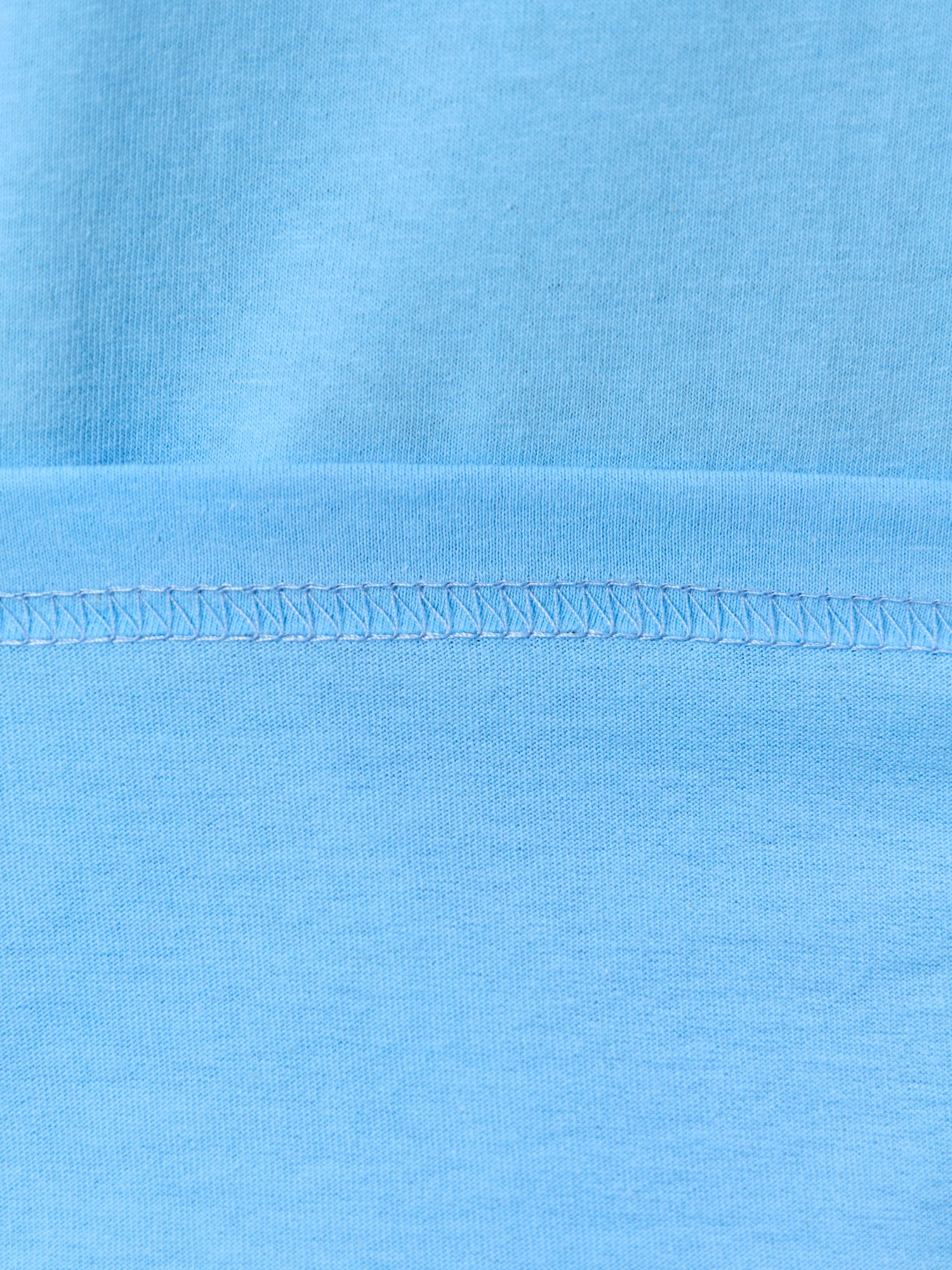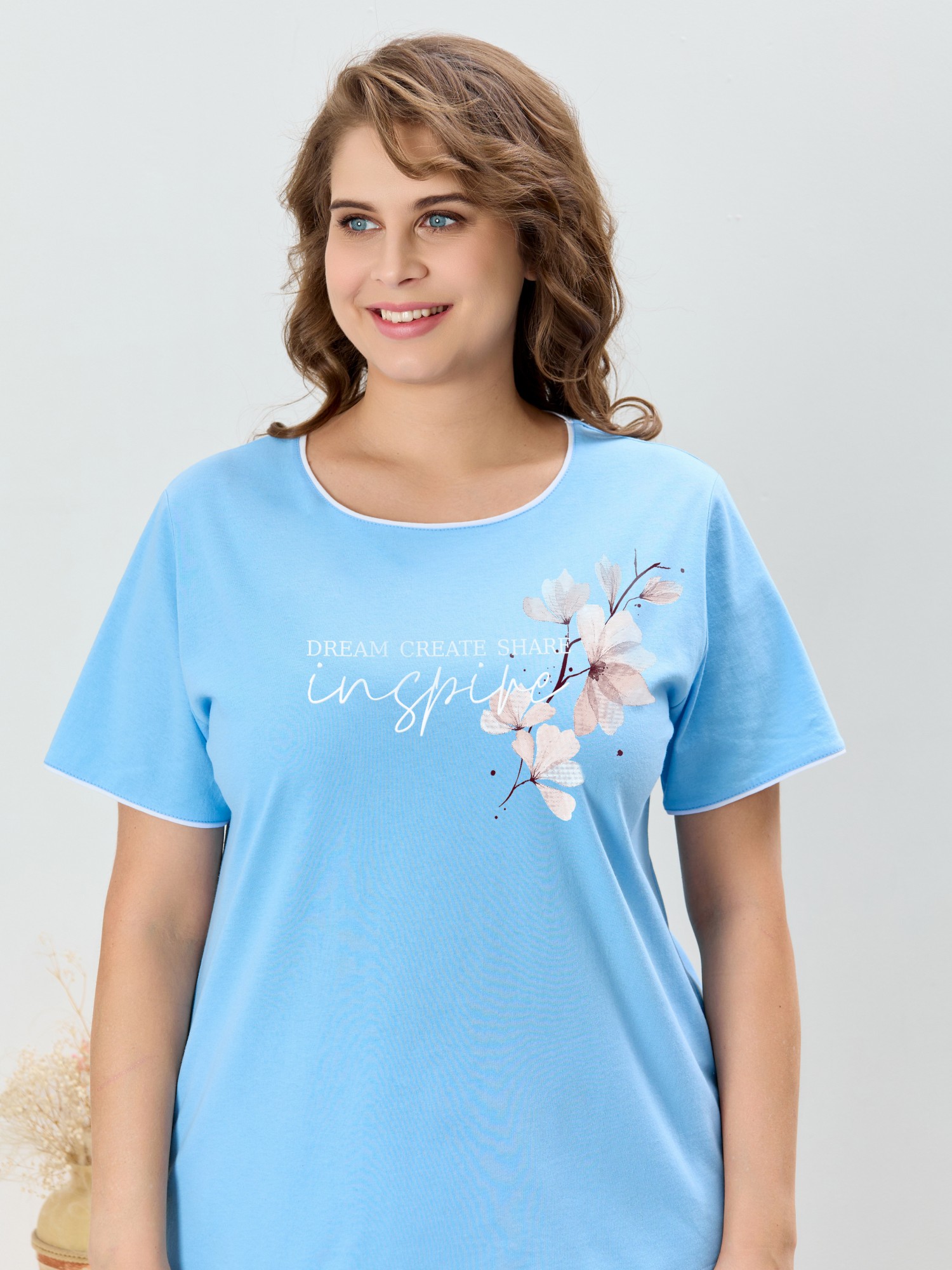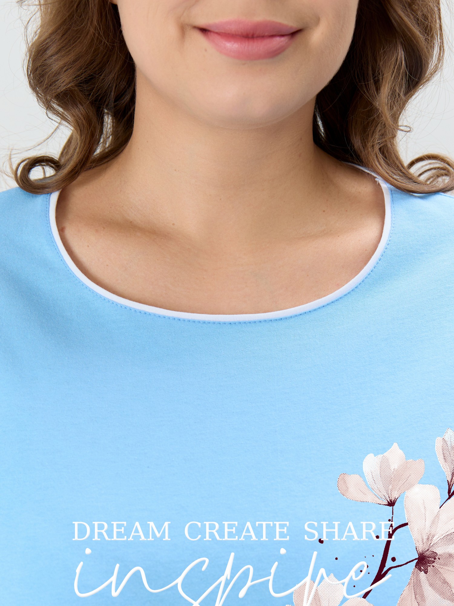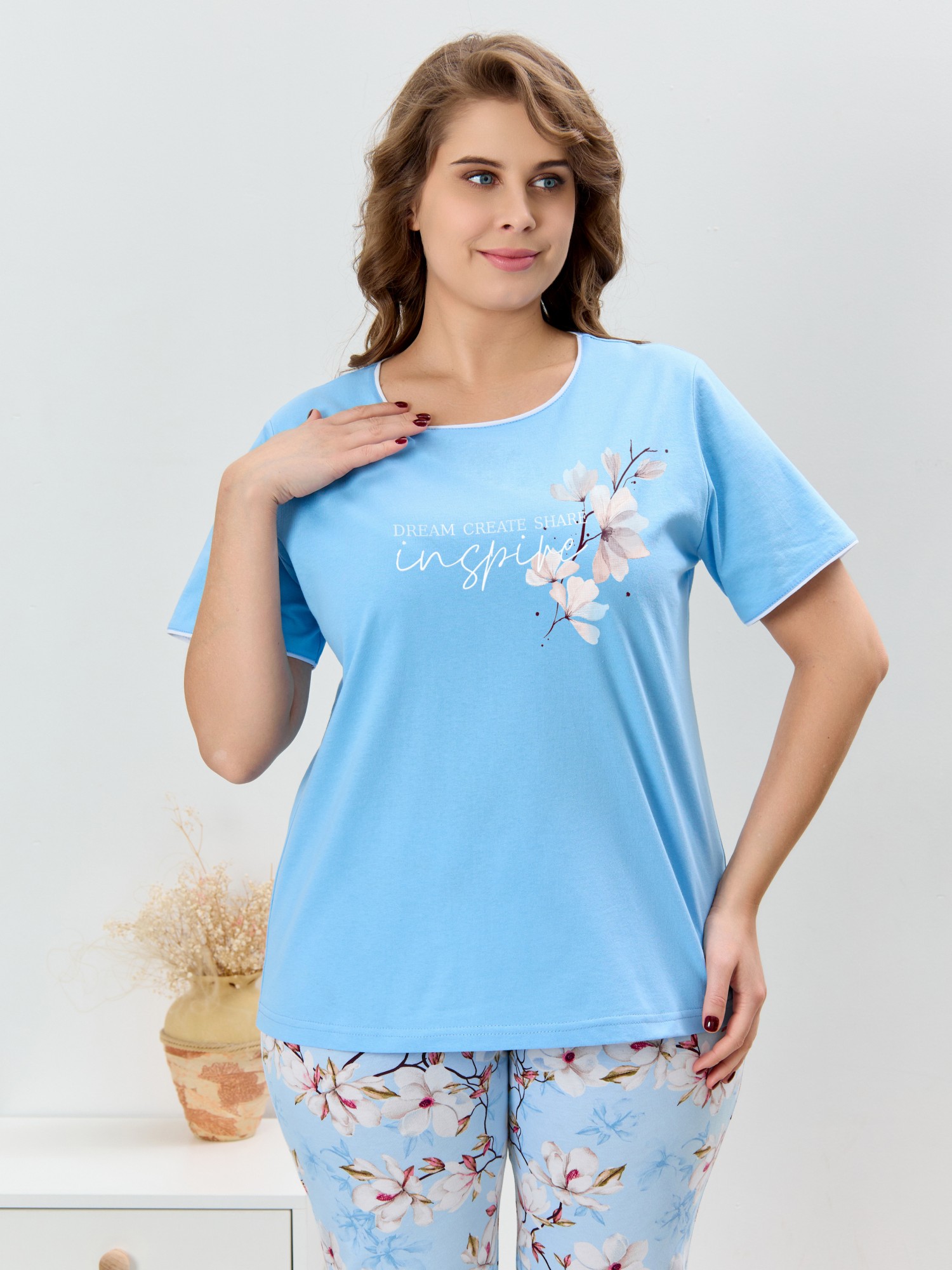 Пижама женская из трикотажного полотна «кулирка» в комбинации двух видов полотен: с набивным рисунком и гладкокрашеного в единой цветовой гамме, состоящая из футболки и брюк. Футболка - из гладкокрашеного полотна, классического покроя, с короткими втачными рукавами, горловиной овальной формы и принтом на полочке, выполненным в технике «шелкографии». Горловина, низ рукавов обработаны узким притачным кантом контрастного цвета. Брюки - длинные, с эластичной тесьмой по талии и притачными манжетами, которые обработаны с узким кантом контрастного цвета в соединительных швах.