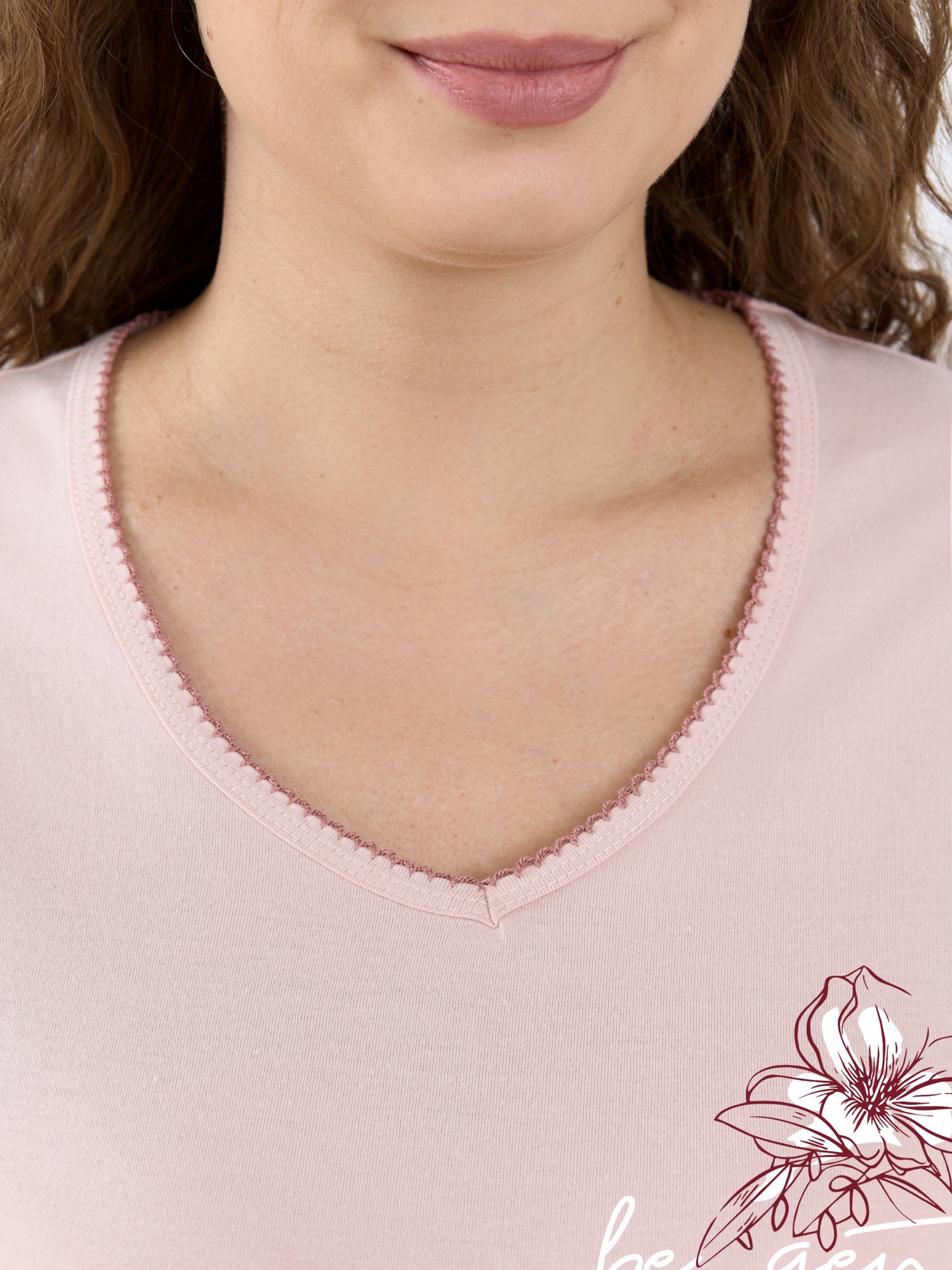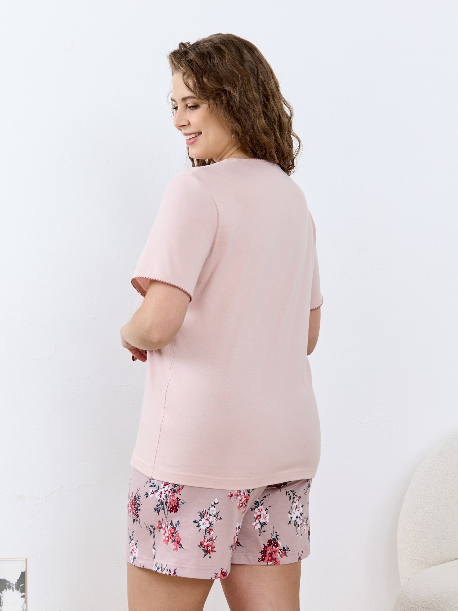 Пижама женская из трикотажного полотна «кулирка» в комбинации двух видов: гладкокрашеного и с набивным рисунком, состоящая из футболки и шорт. Футболка – из гладкокрашеного полотна, с короткими цельнокроеными рукавами, горловиной V-образной формы. Низ рукавов и горловина обработаны декоративной строчкой «кроше», на полочке печать, выполненная в технике «шелкографии». Шорты – из полотна с набивным рисунком, удлиненные, свободного покроя, с эластичной тесьмой по талии.