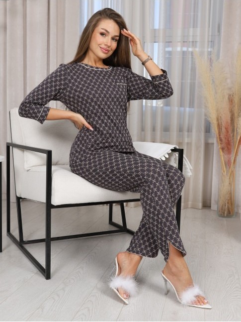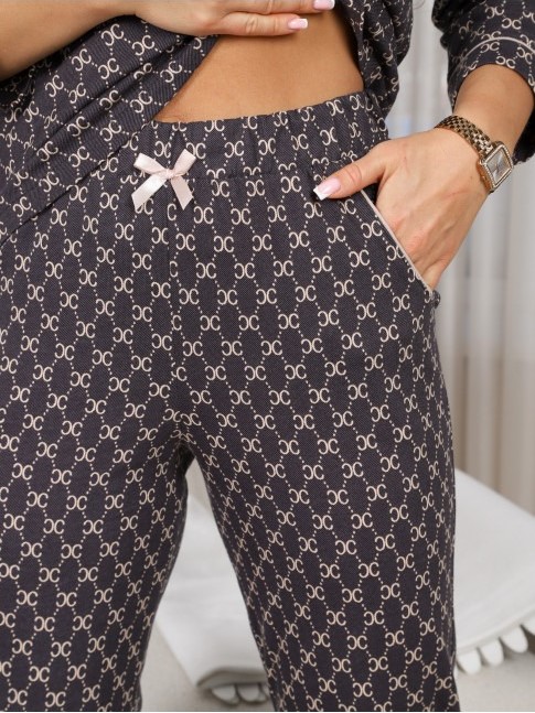 Кофта с рукавом 3/4, брюки зауженные брюки с двумя внутренними карманами с кантом, боковые вырезы с окантовкой, пояс-резинка декорирован атласным бантом.